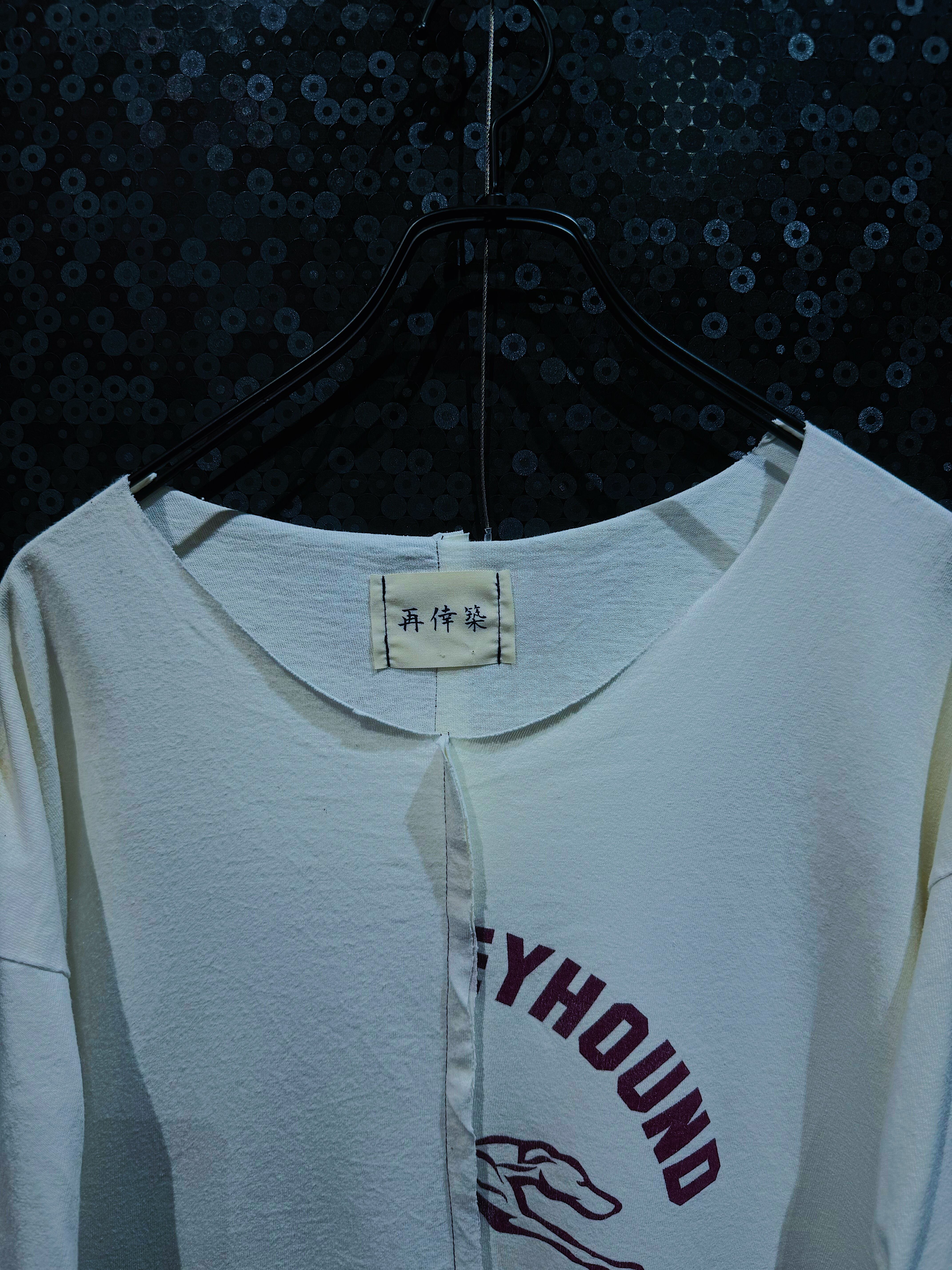 再倖築のタグも内側にしっかり縫い込まれており、手仕事の痕跡が作品としての完成度を高めています。ファッションという枠を超え、アートピースとしても成立するこのTシャツは、日常に溶け込む前衛性を体現した逸品。再構築ならではの実験的かつ洗練された世界観を味わえる、他には存在しない一点です。
