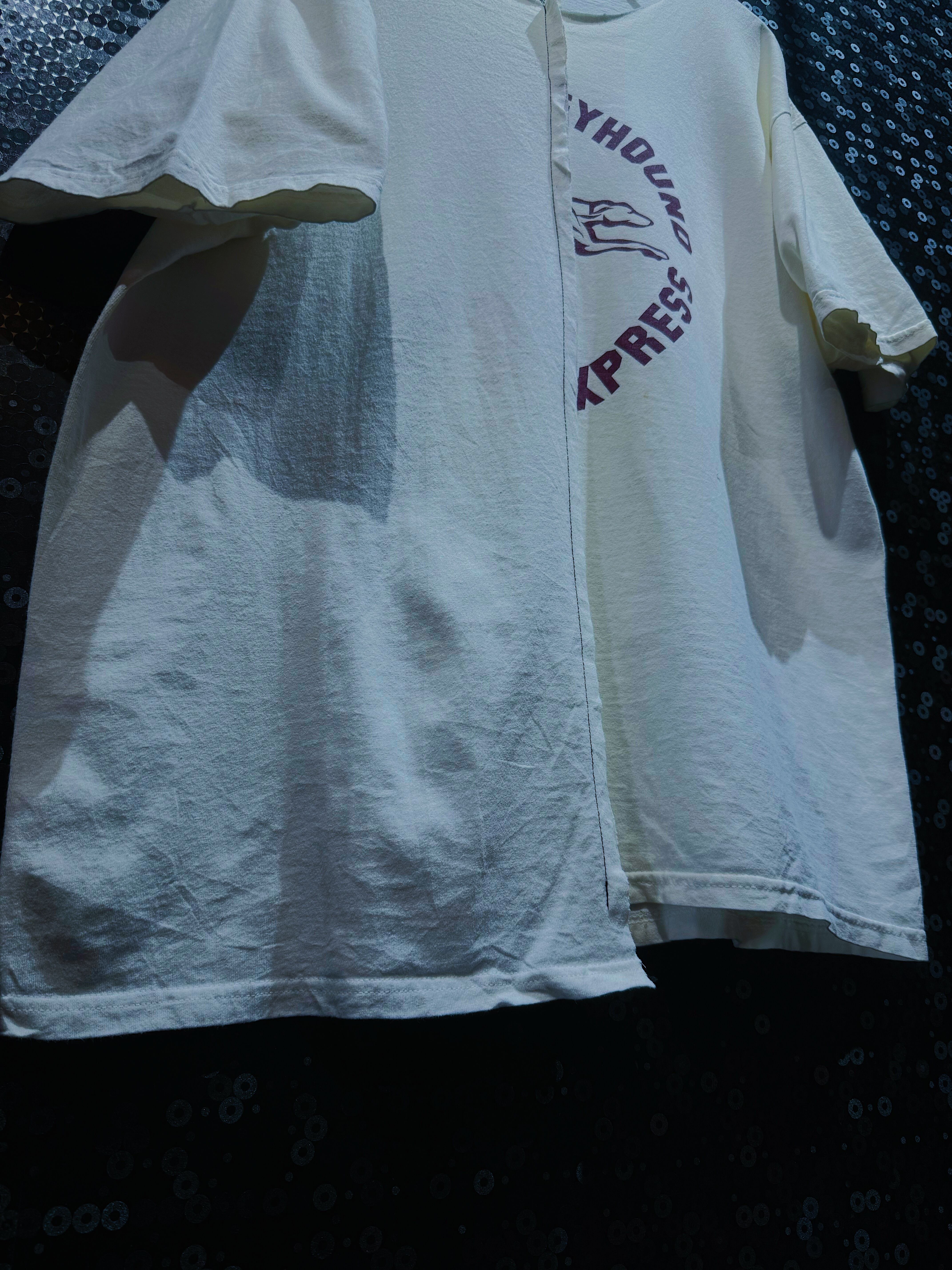 大胆にも片側はプリントTシャツ、もう片側は無地という対照的な構成になっており、その非対称性が逆にデザイン全体のバランスを美しく際立たせています。