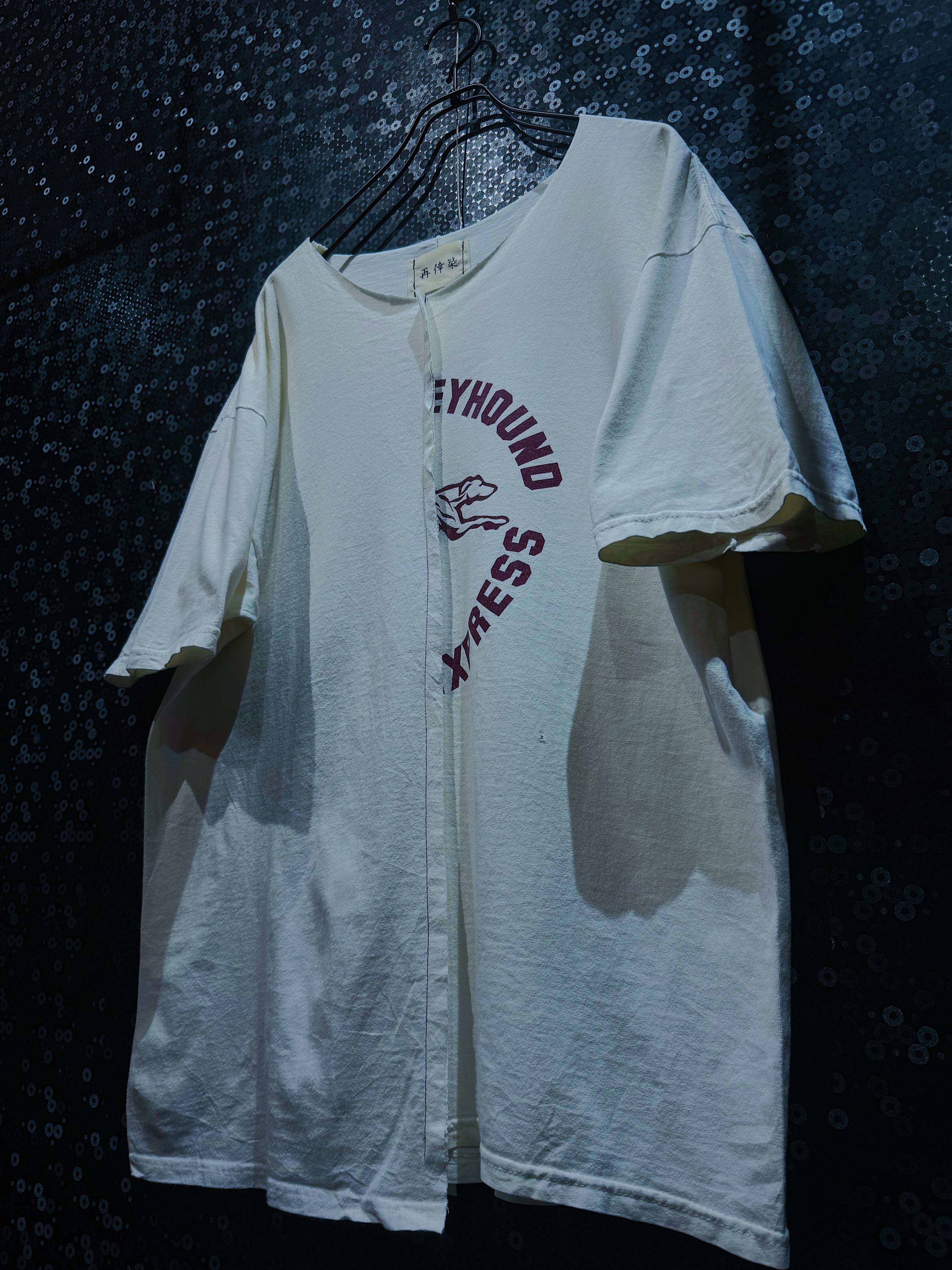 再倖築が手掛けた本作は、二枚の異なるTシャツを縦にドッキングさせた一点もののリメイクアイテム。
