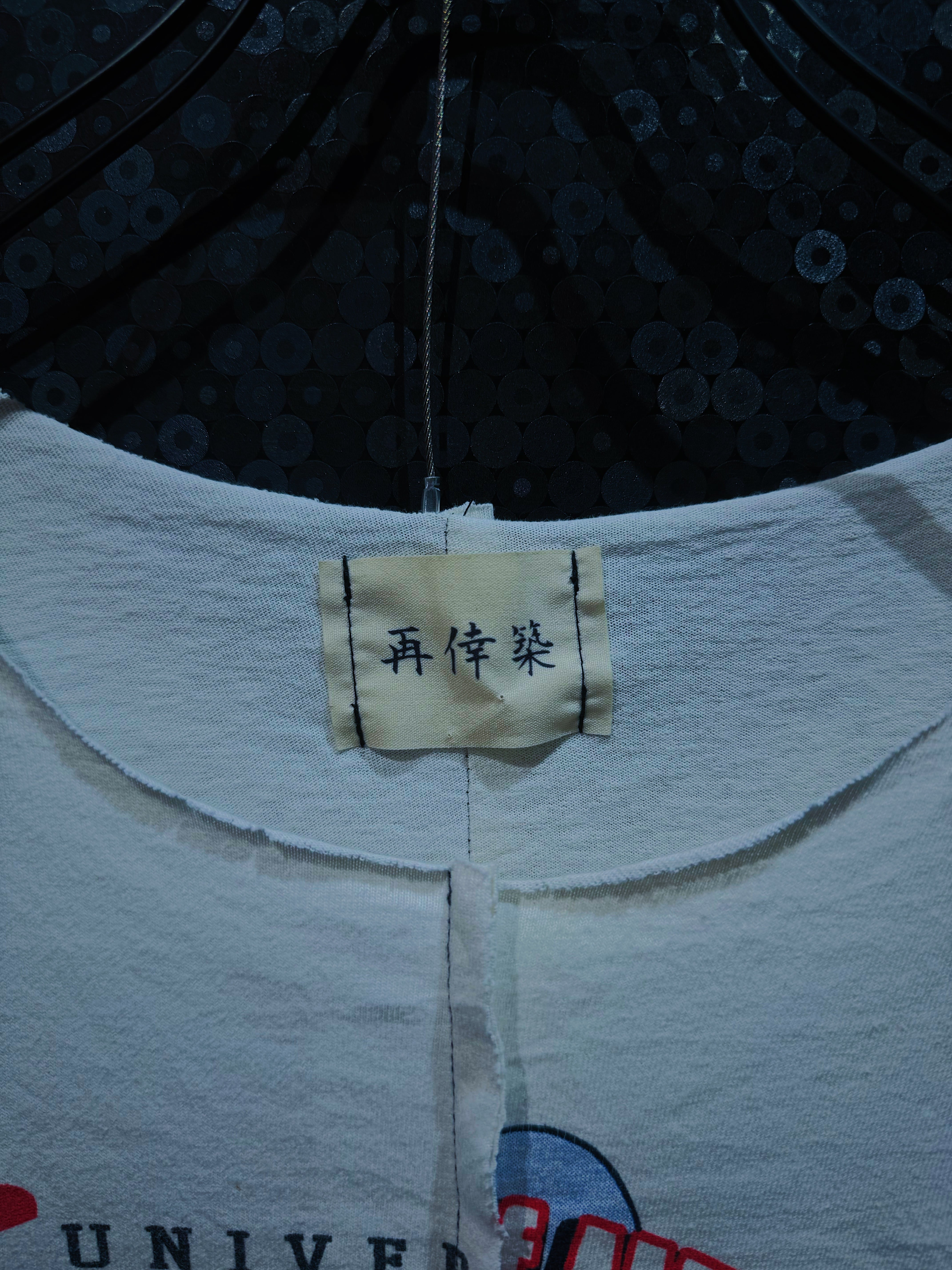 こちらのアイテムは、再倖築によるリメイクTシャツで、二枚の全く異なるヴィンテージTシャツを中央で縫い合わせ、ひとつの新たなストーリーを紡ぎ出した唯一無二の作品です。
