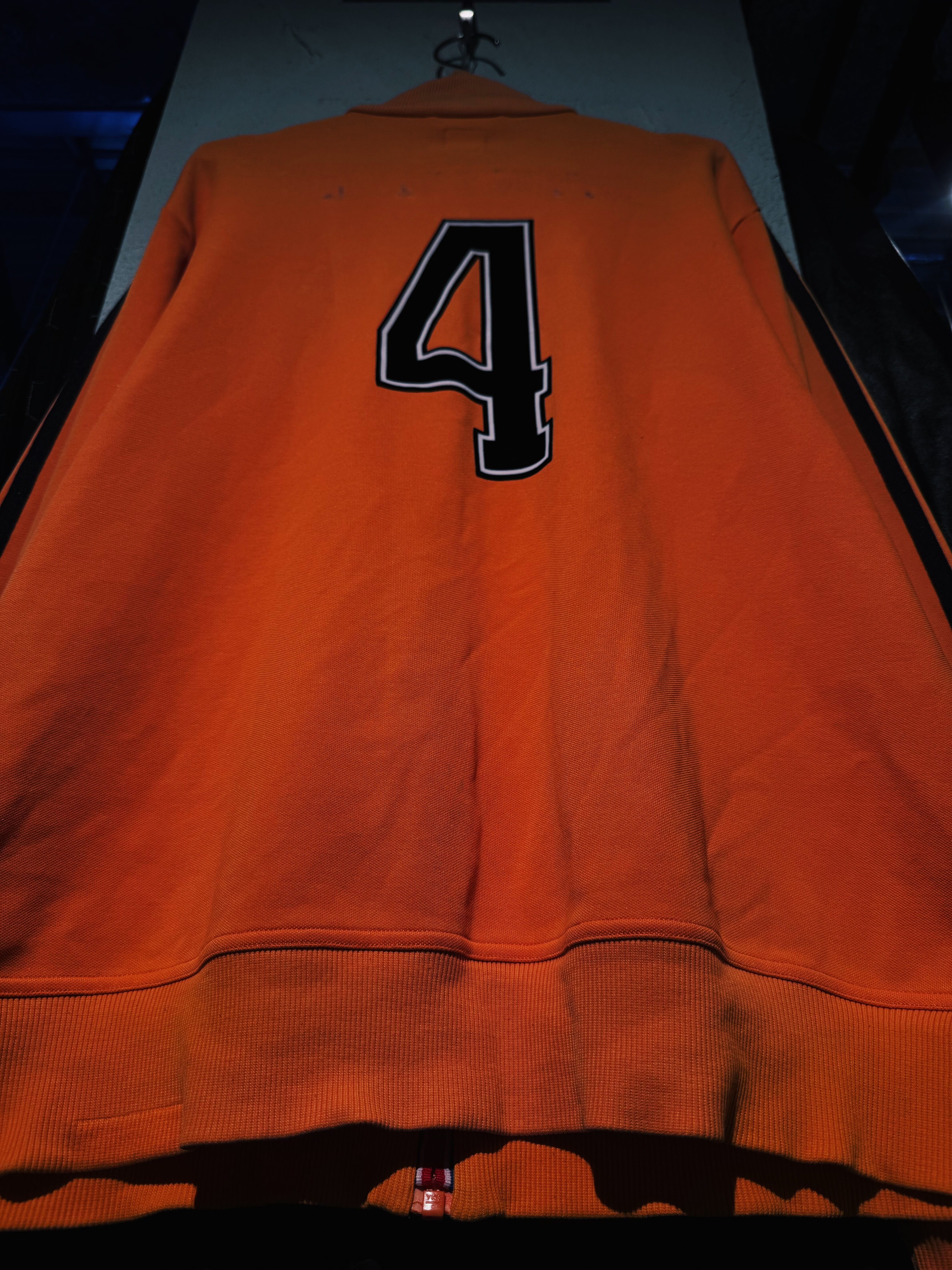 毎度即完のオレンジカラーのボディにクラシカルなストライプを載せたスタンドネックタイプのトラックジャケット。