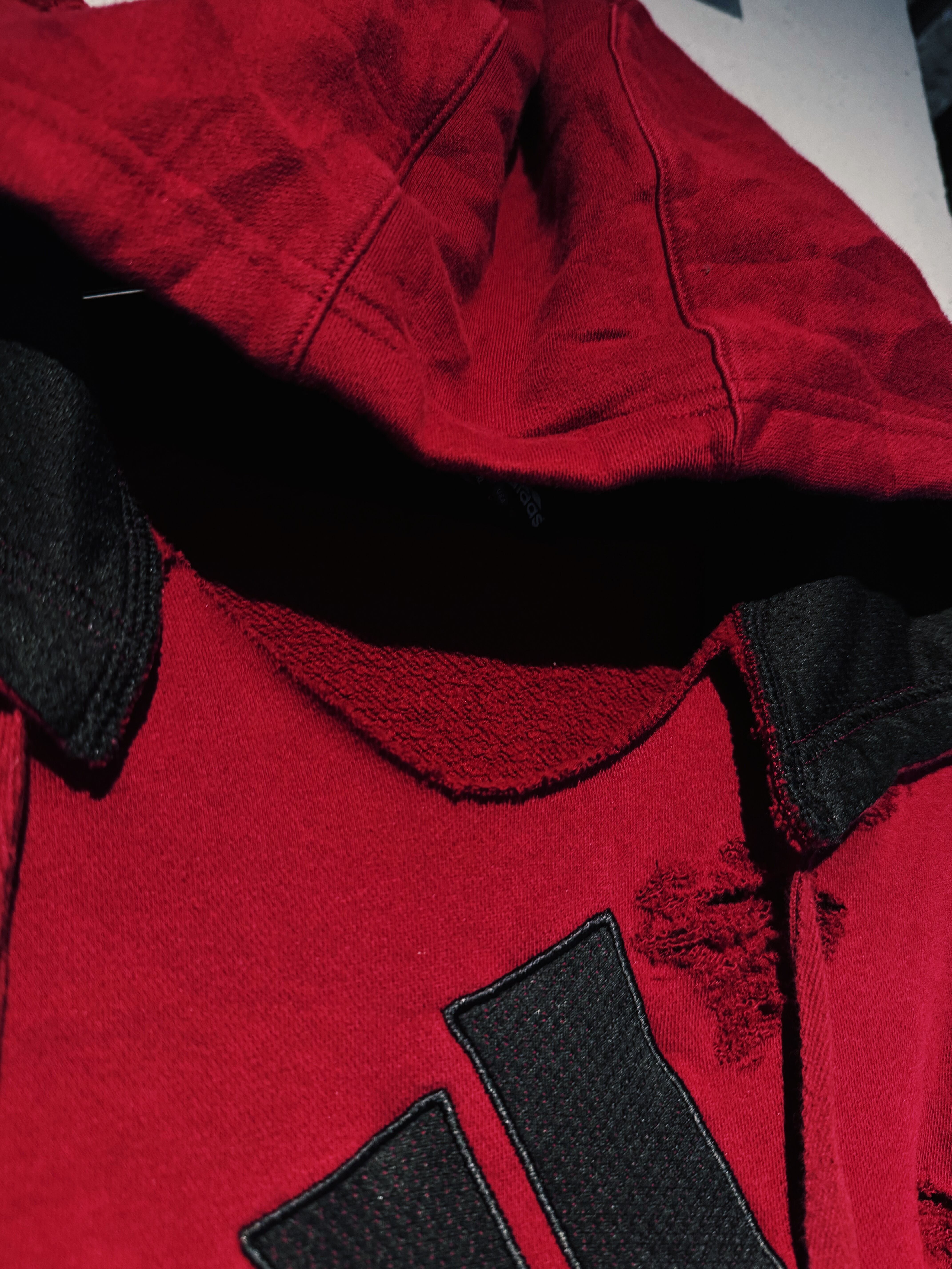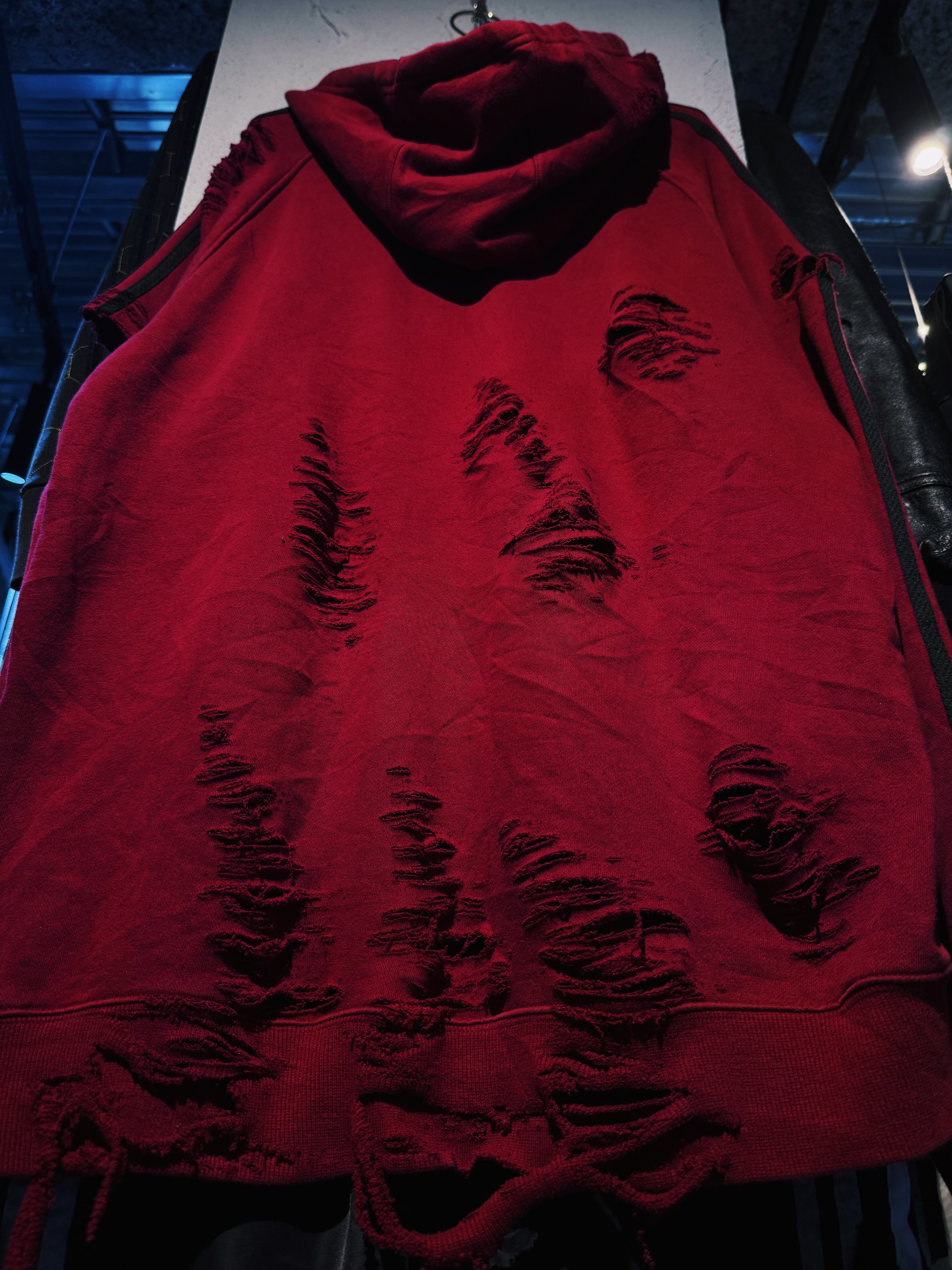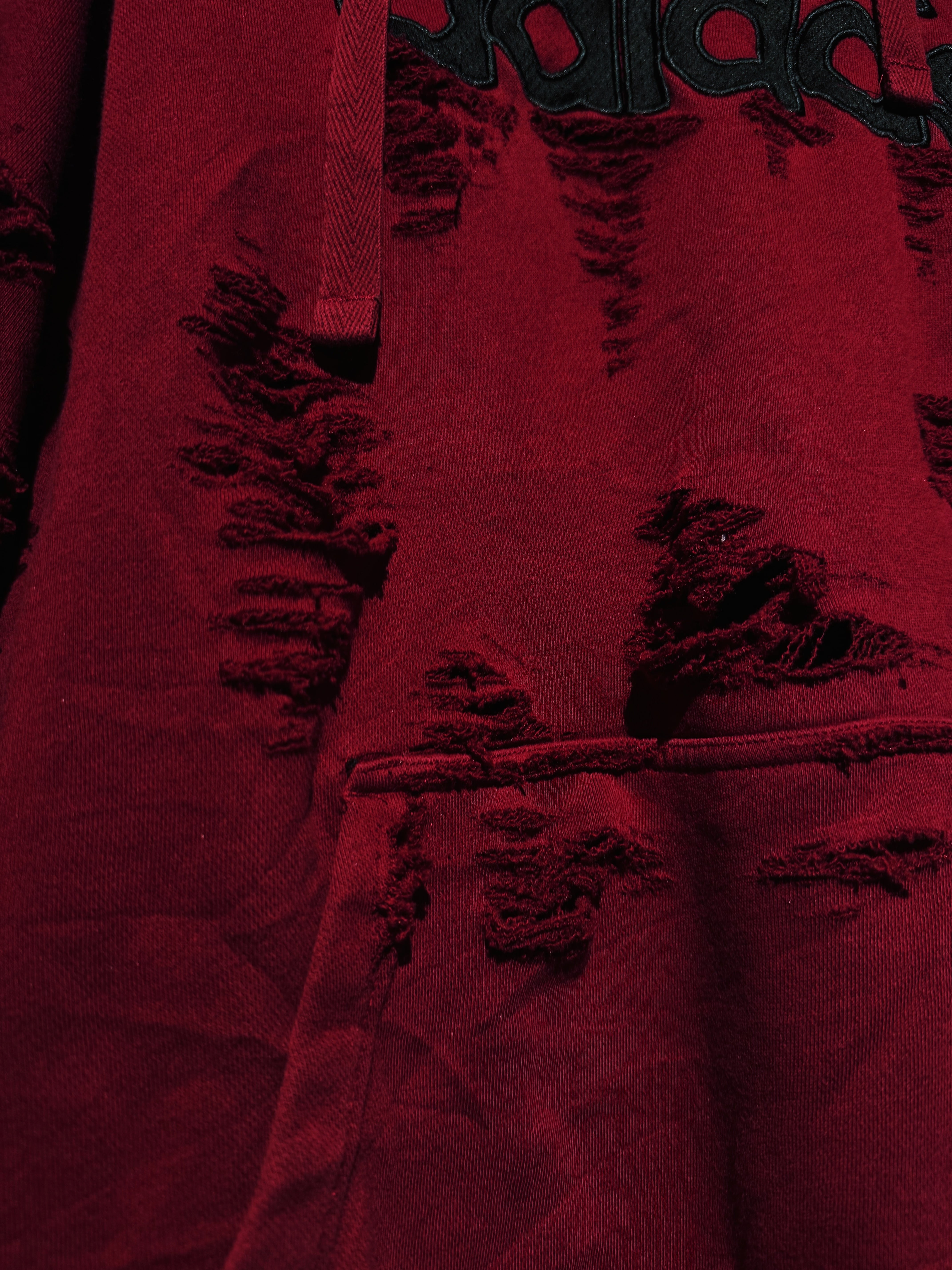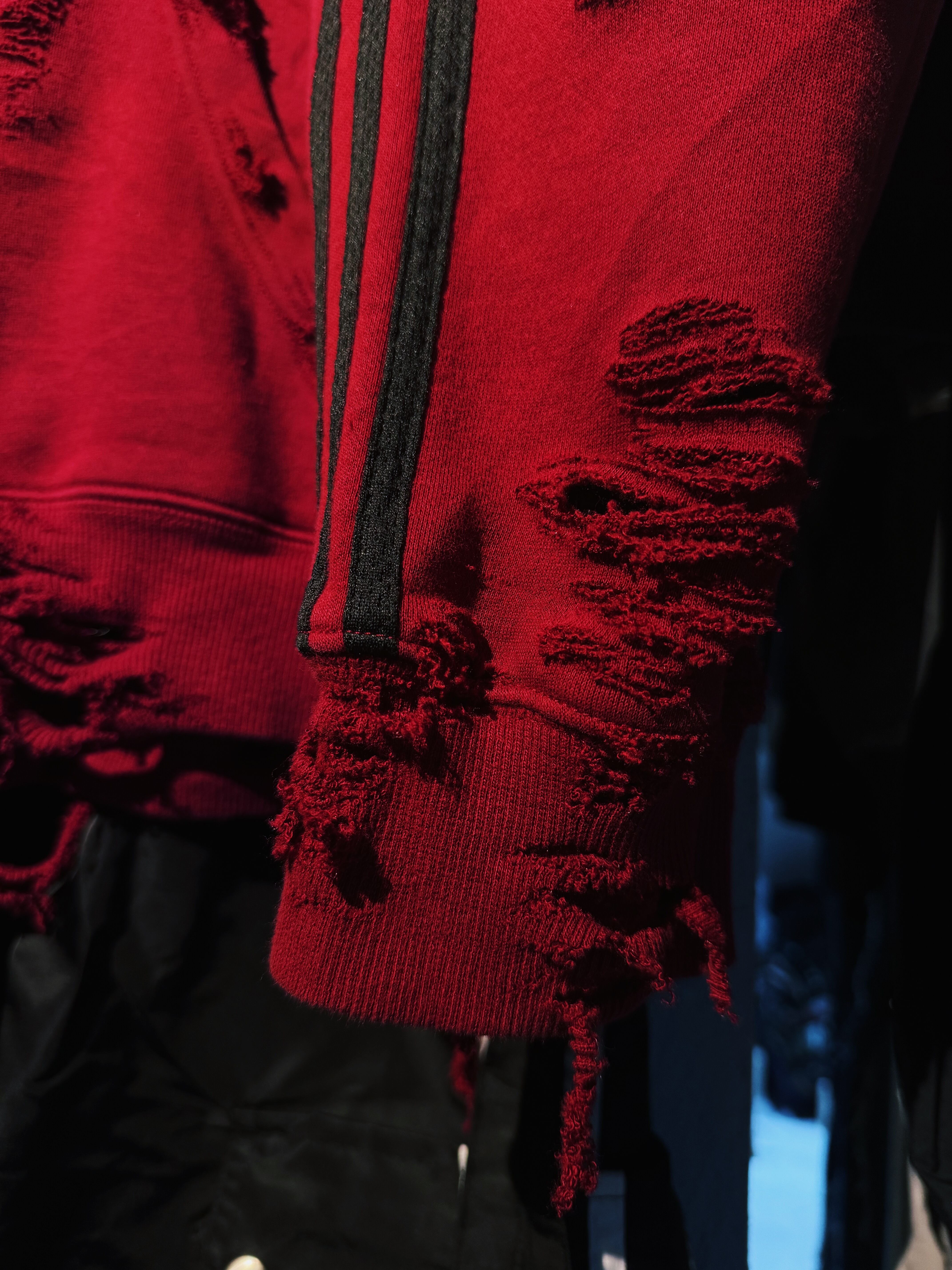 当店十八番のボロリメイクの中でもかなり人気の高い"adidas Originals"を贅沢にボロカスタムした一枚。”Originals”の代名詞でもあるパフォーマンスロゴをフロントに、3ストライプスを袖に、ブラックとレッドのカラーリングも素晴らしくボディも一級品。