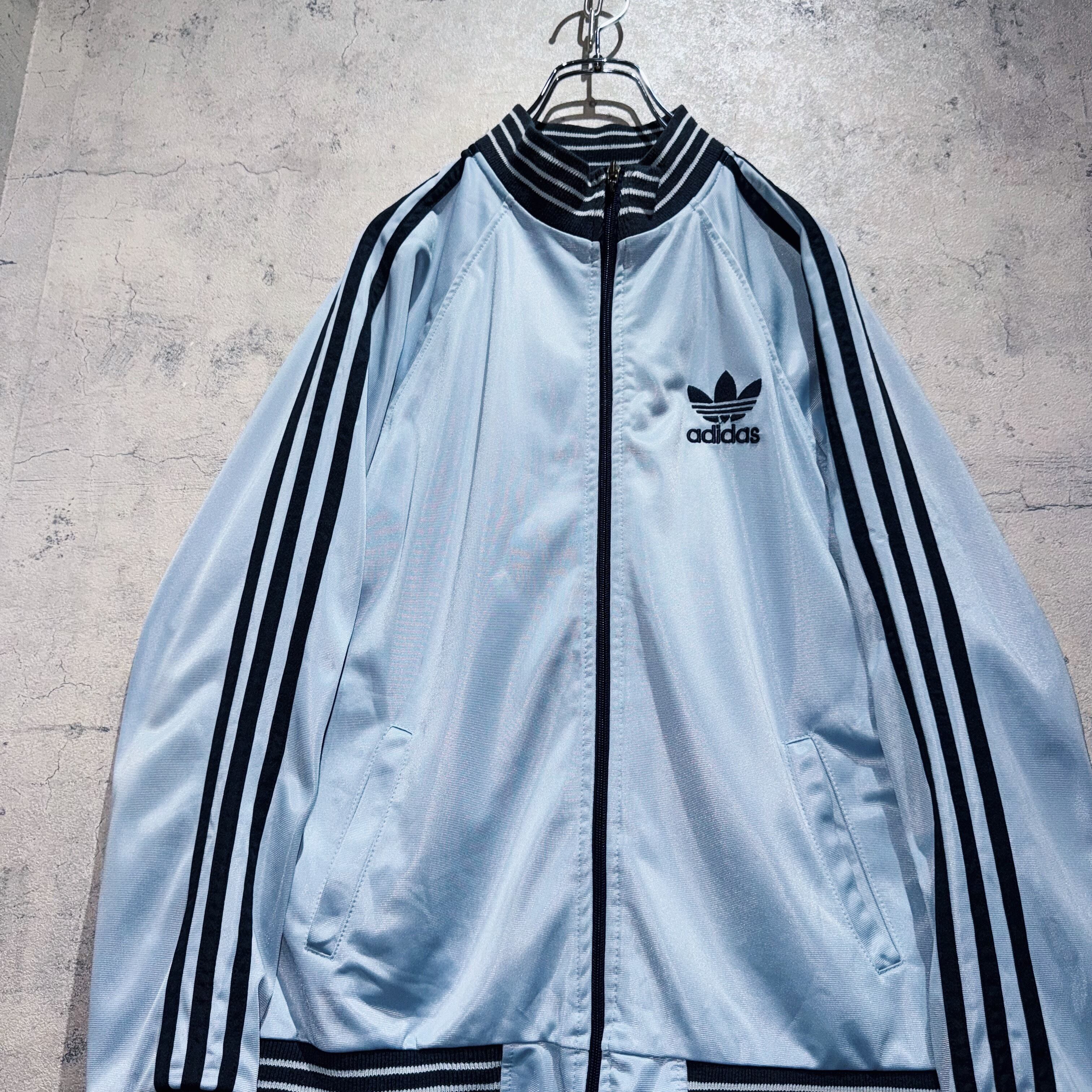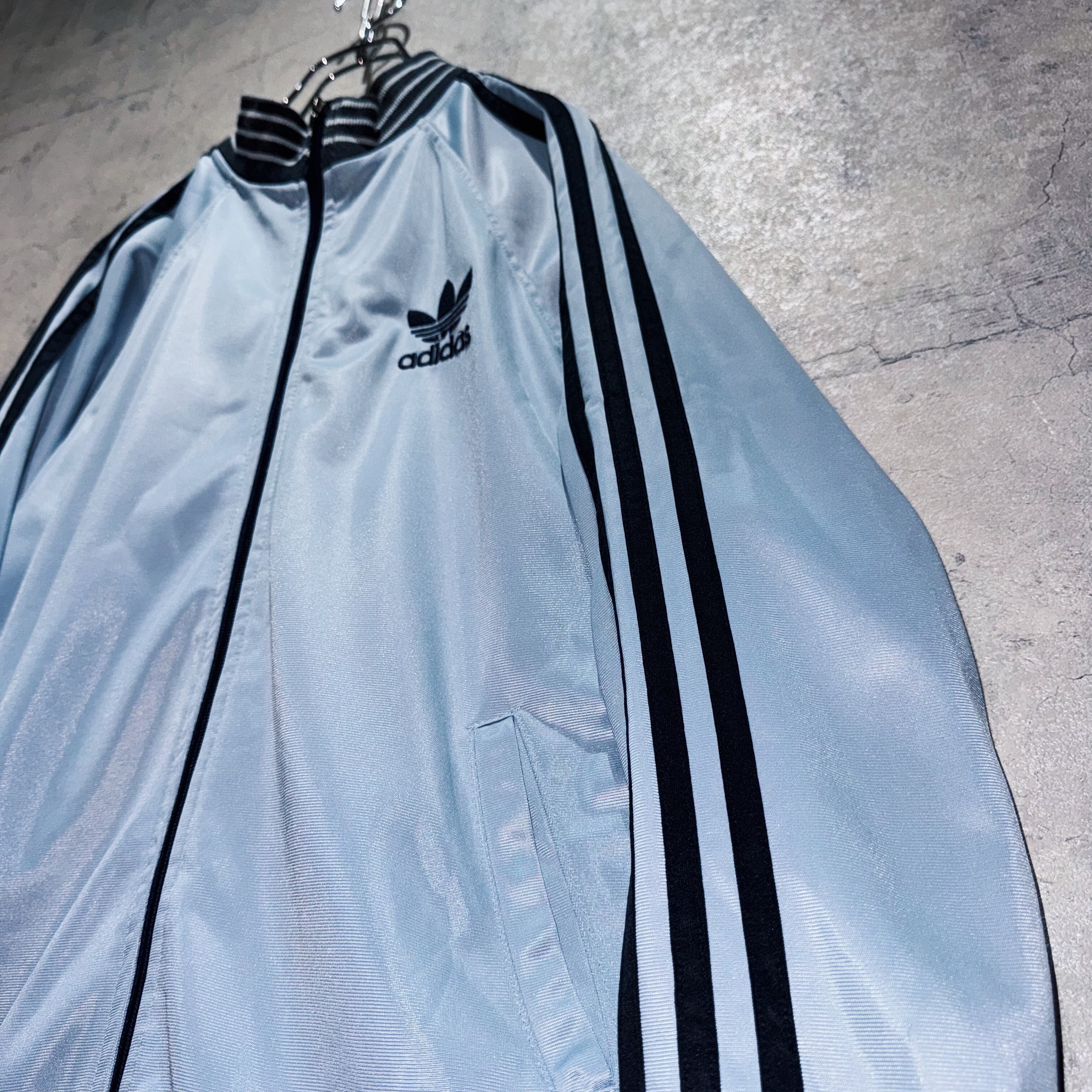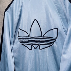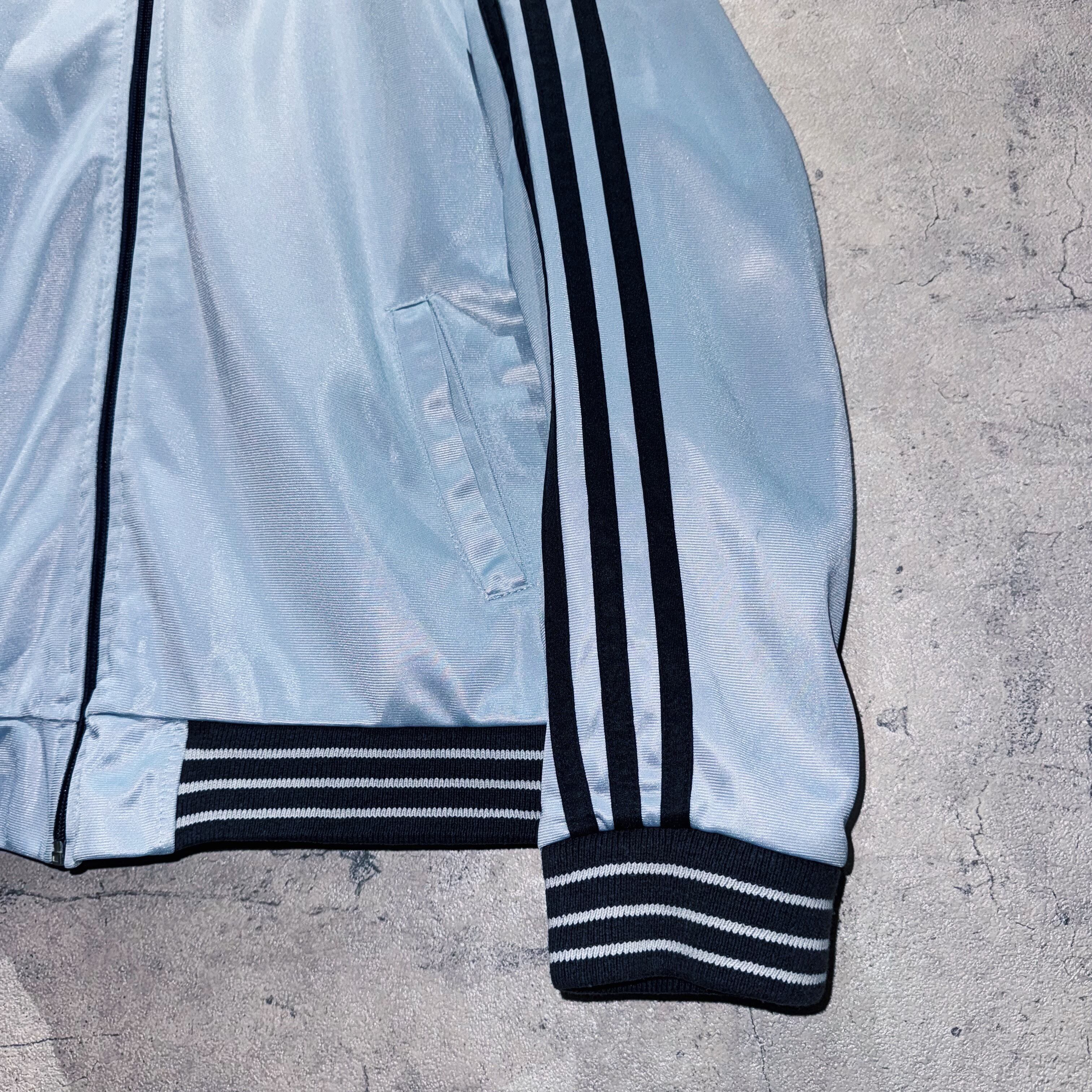 "ATP"のような艶やかで高級感のあるボディにアディダスの代名詞である3ストライプスを袖のラインだけでなく、ネックや裾にもあしらった稀有なデザイントラックジャケット。