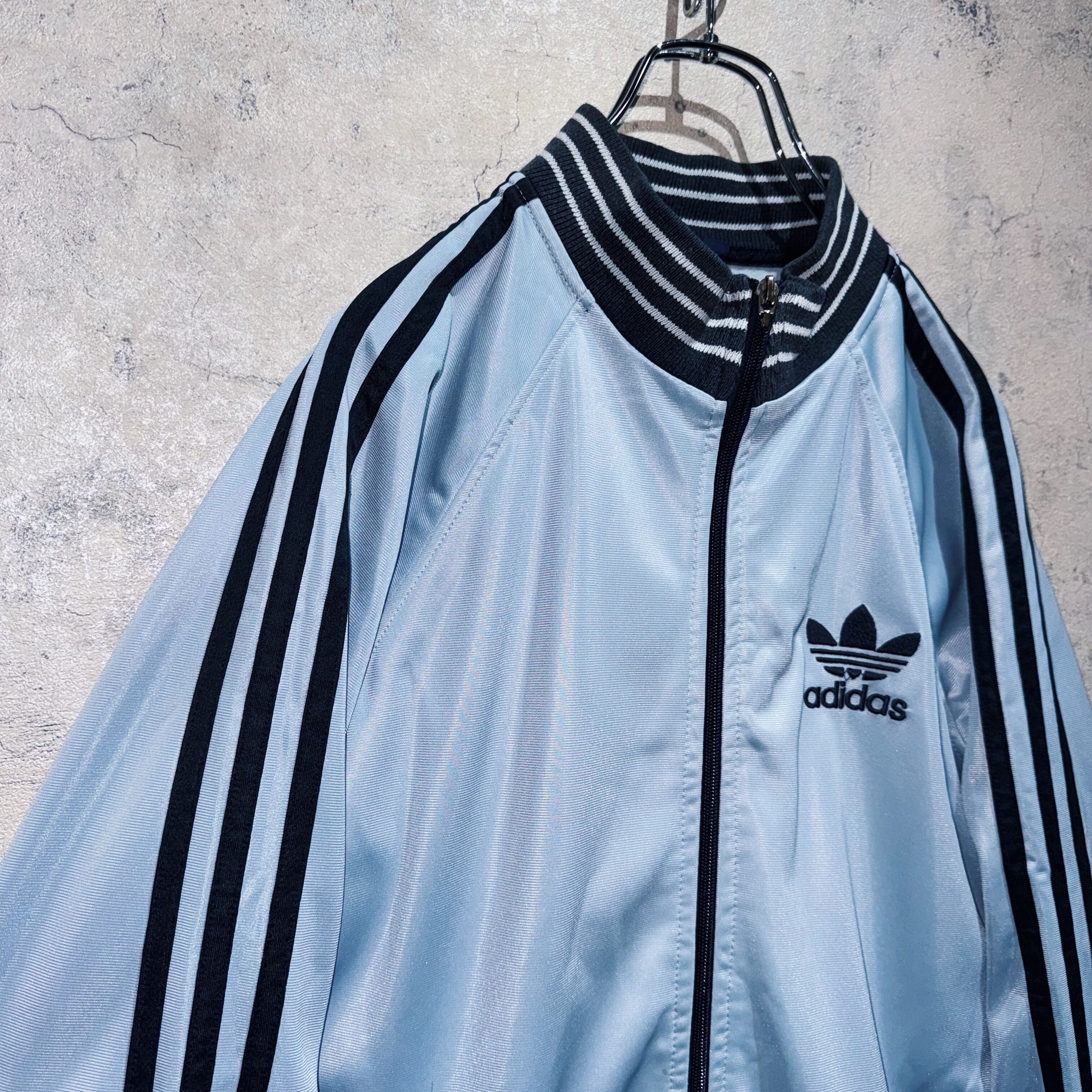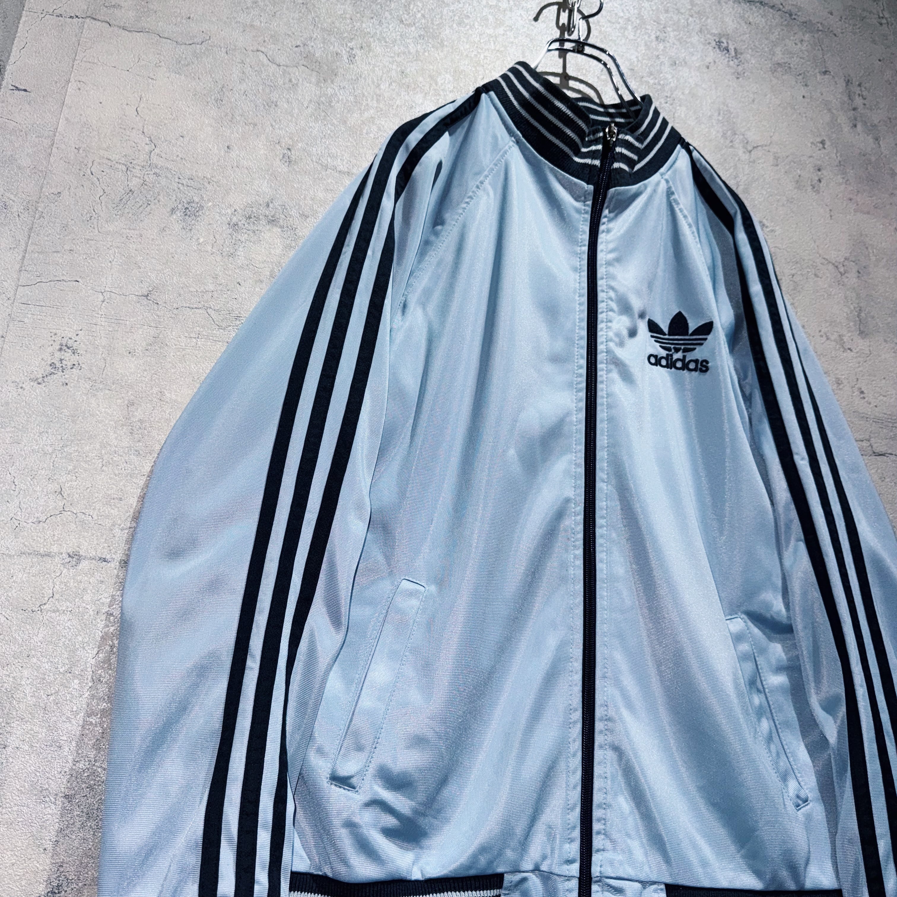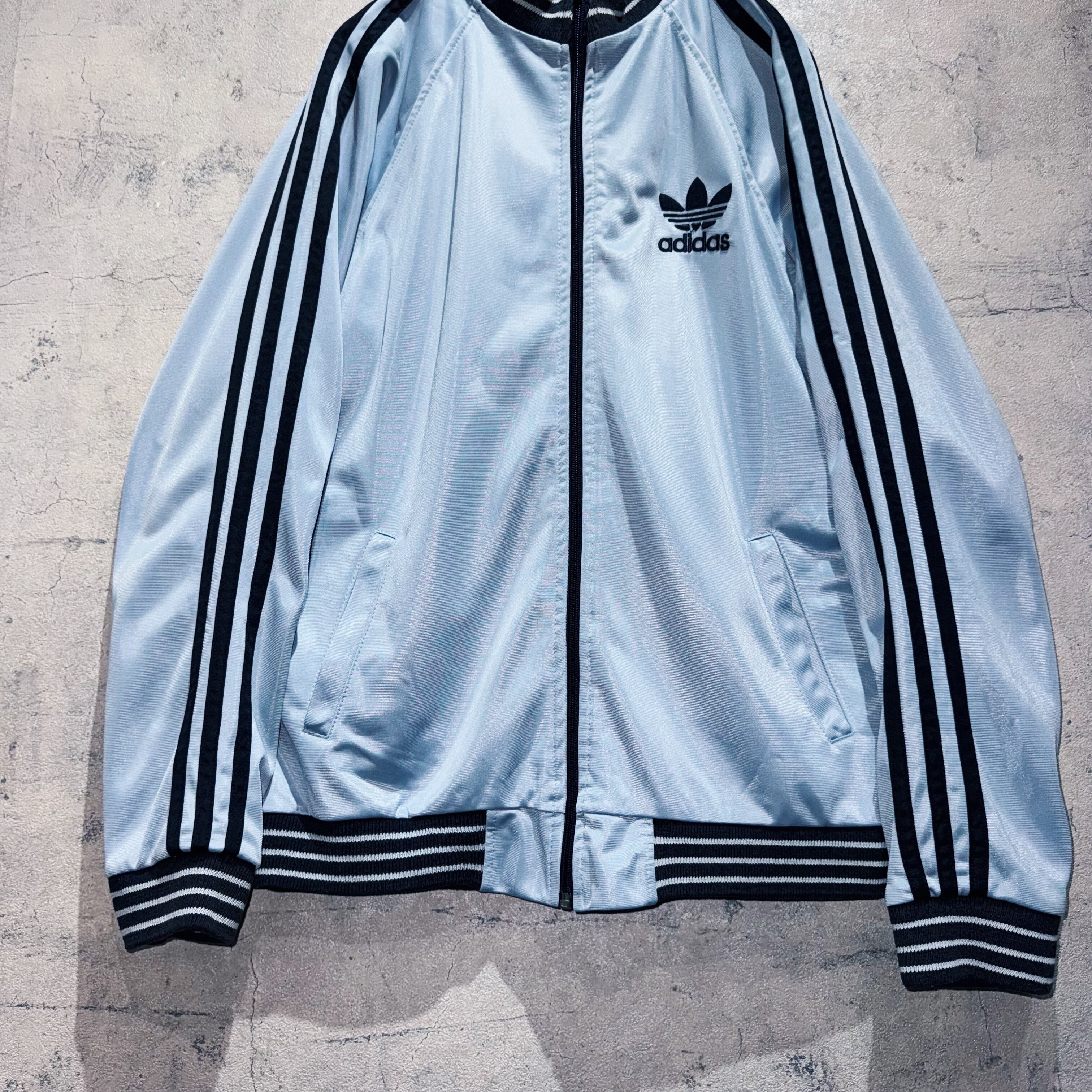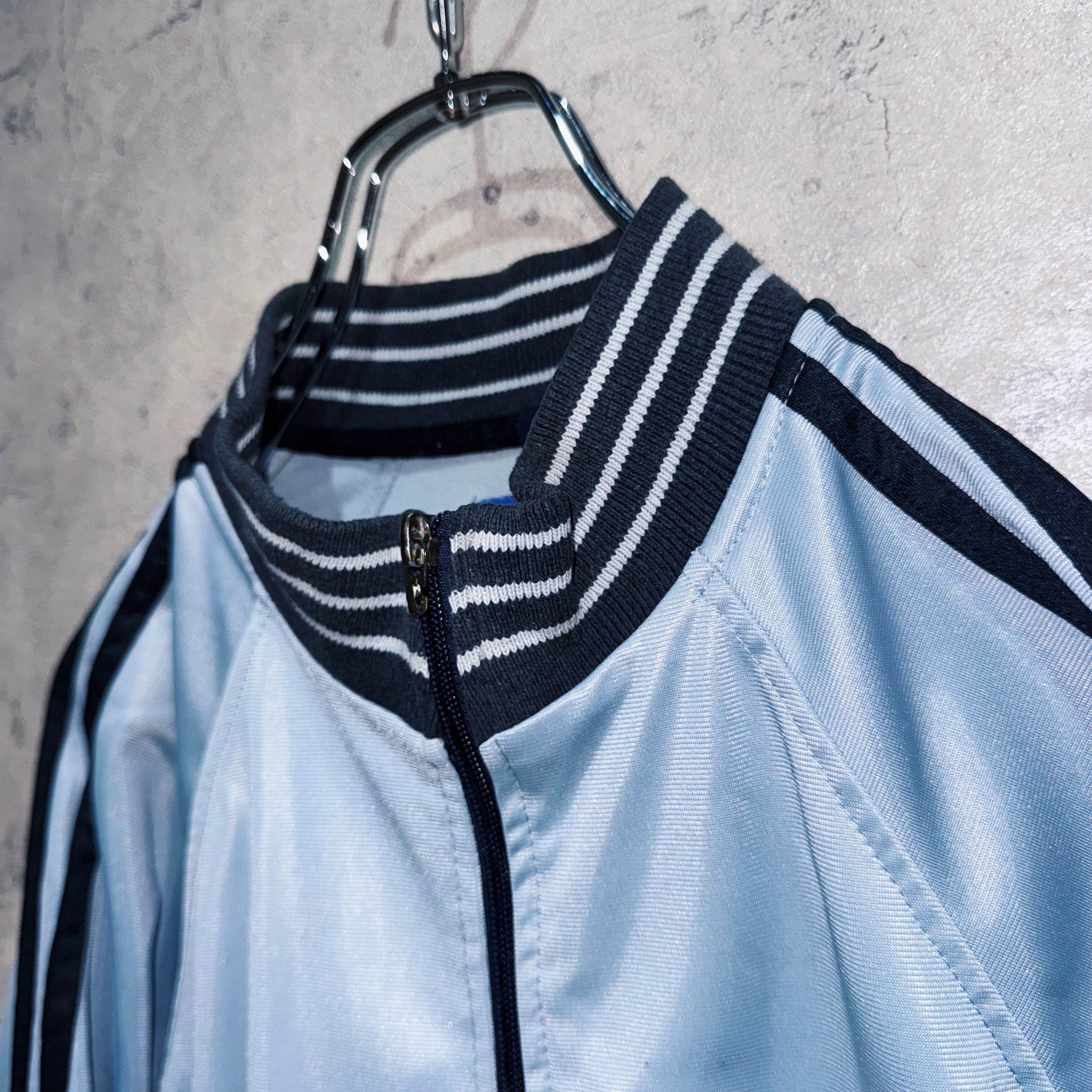 "ATP"のような艶やかで高級感のあるボディにアディダスの代名詞である3ストライプスを袖のラインだけでなく、ネックや裾にもあしらった稀有なデザイントラックジャケット。