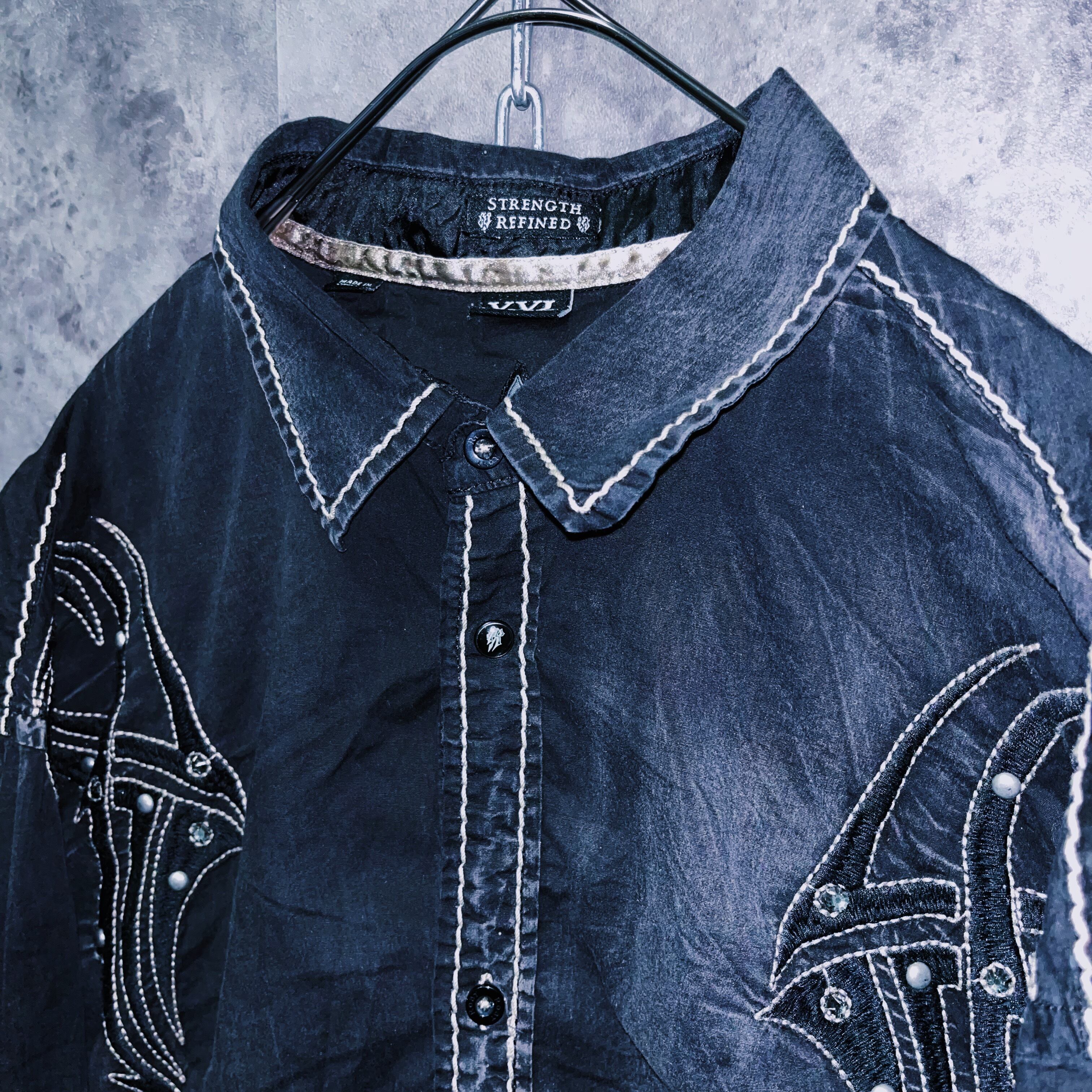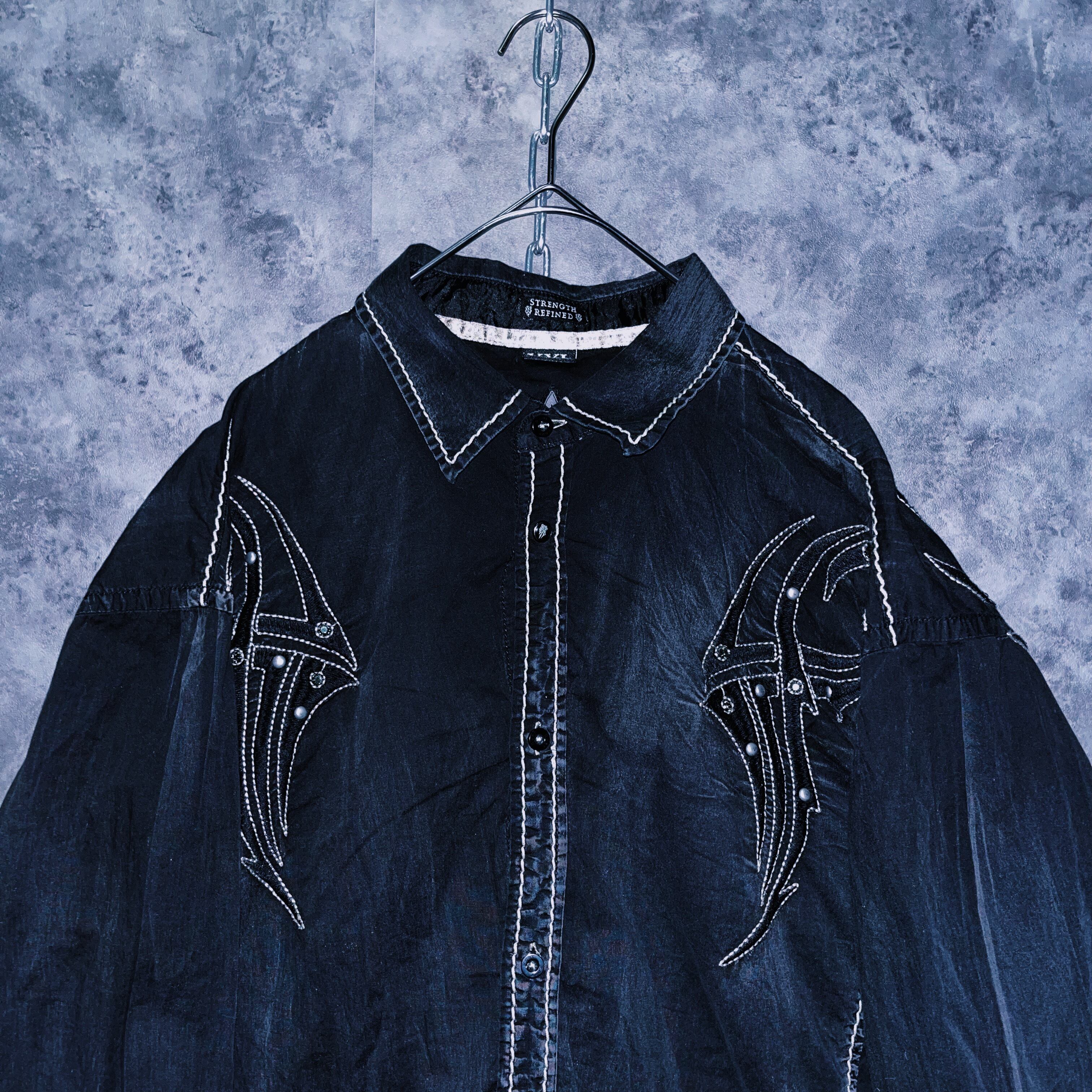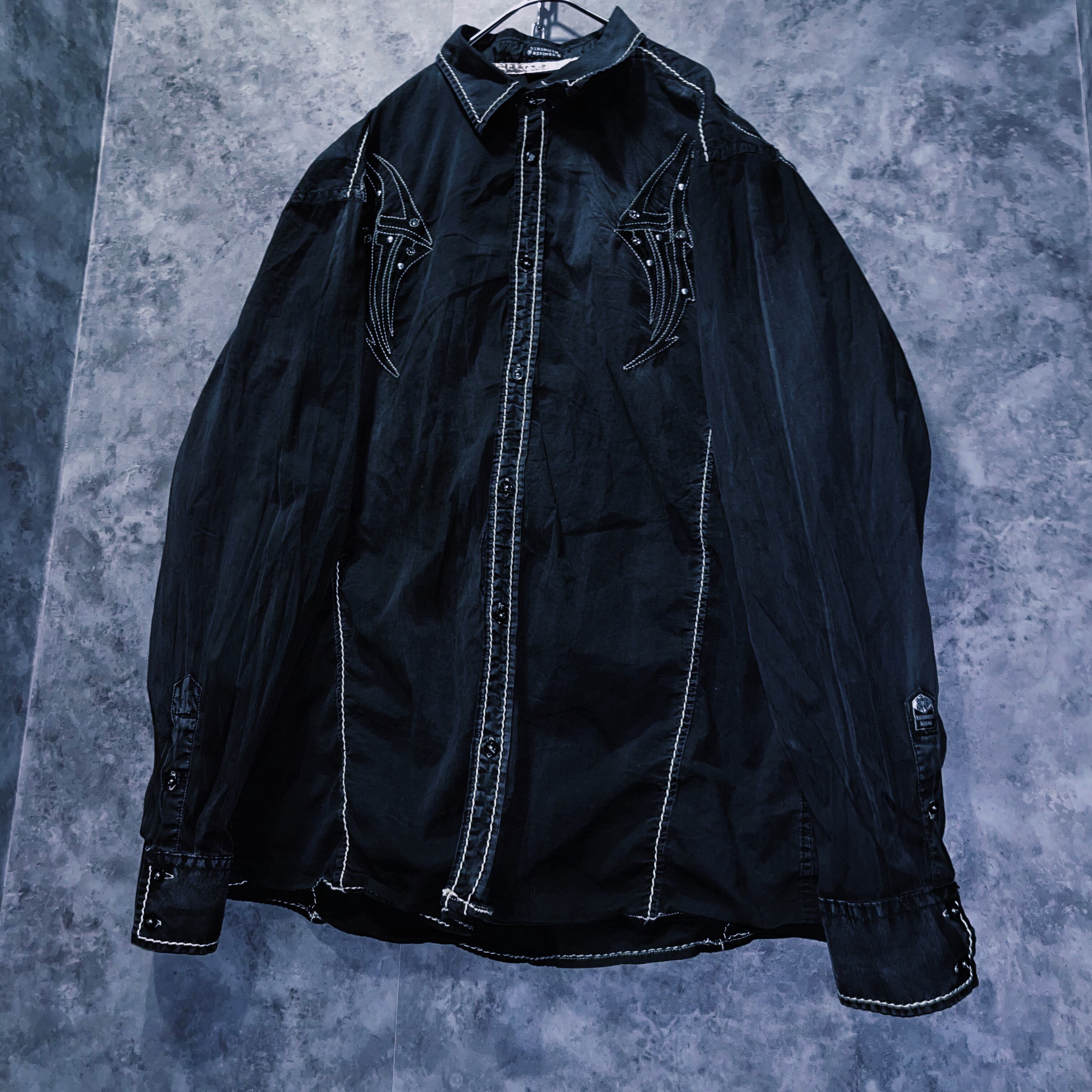 炭黒のボディ、刺繍に白のステッチが素晴らしいデザイン性とアクセントになっているシャツ。