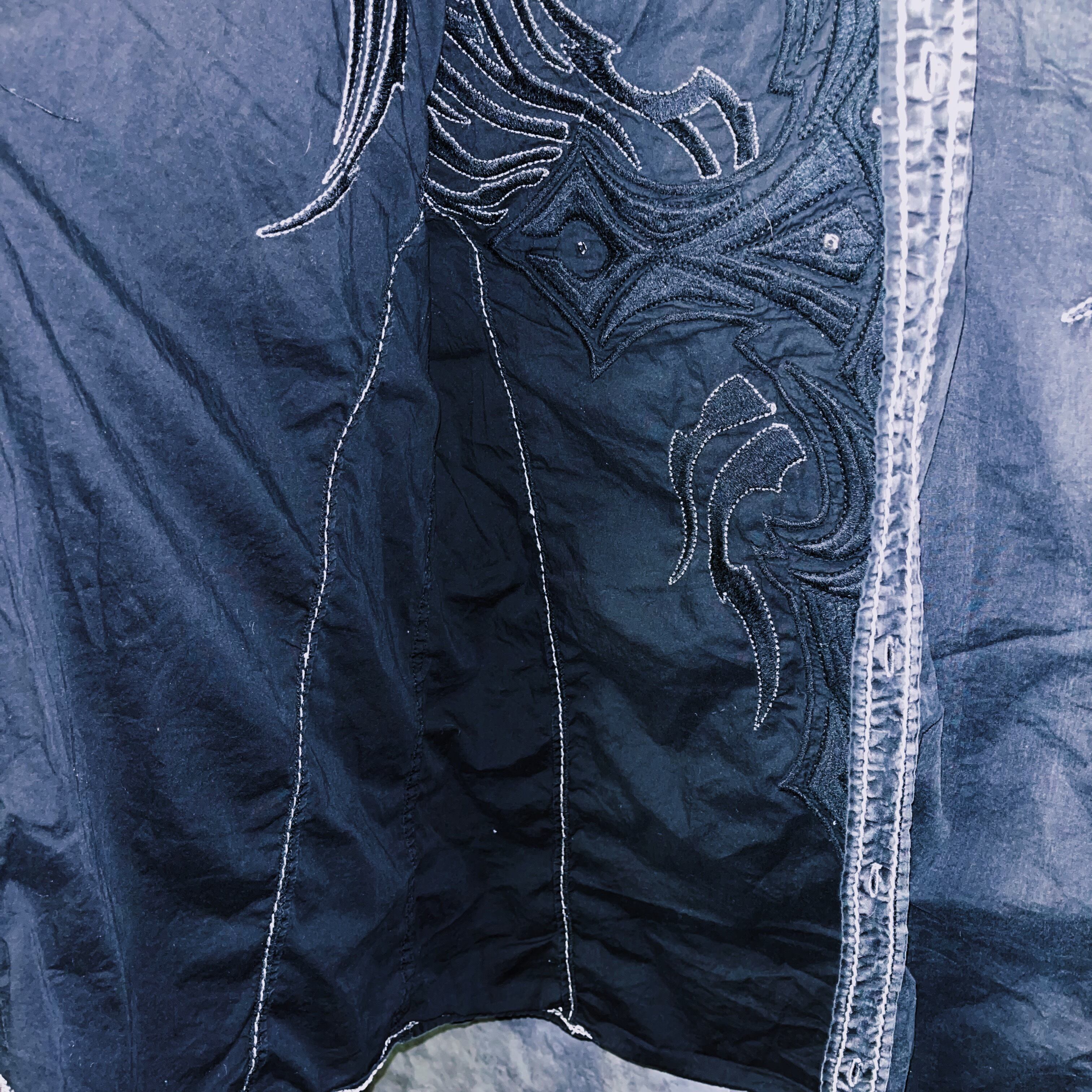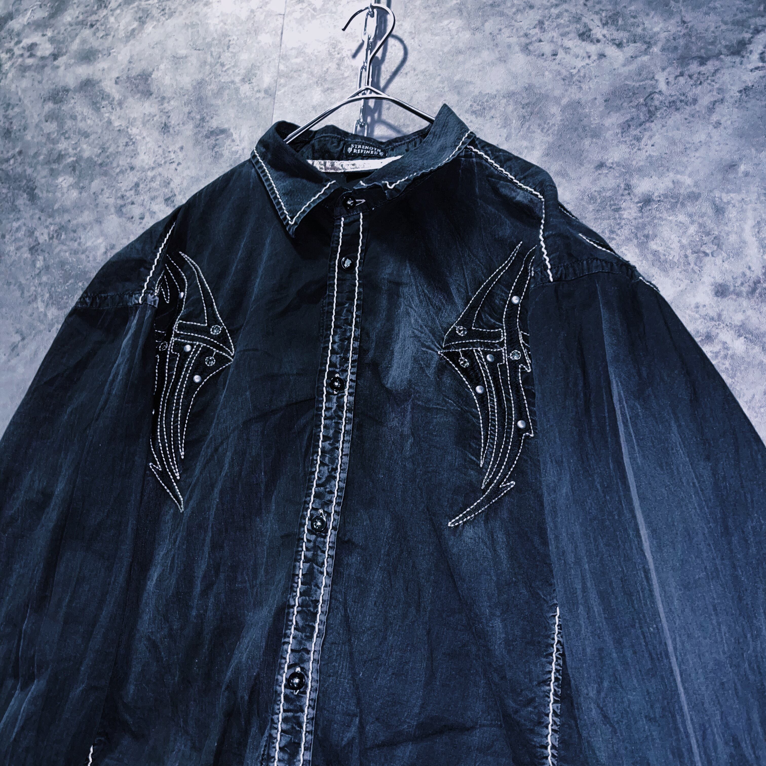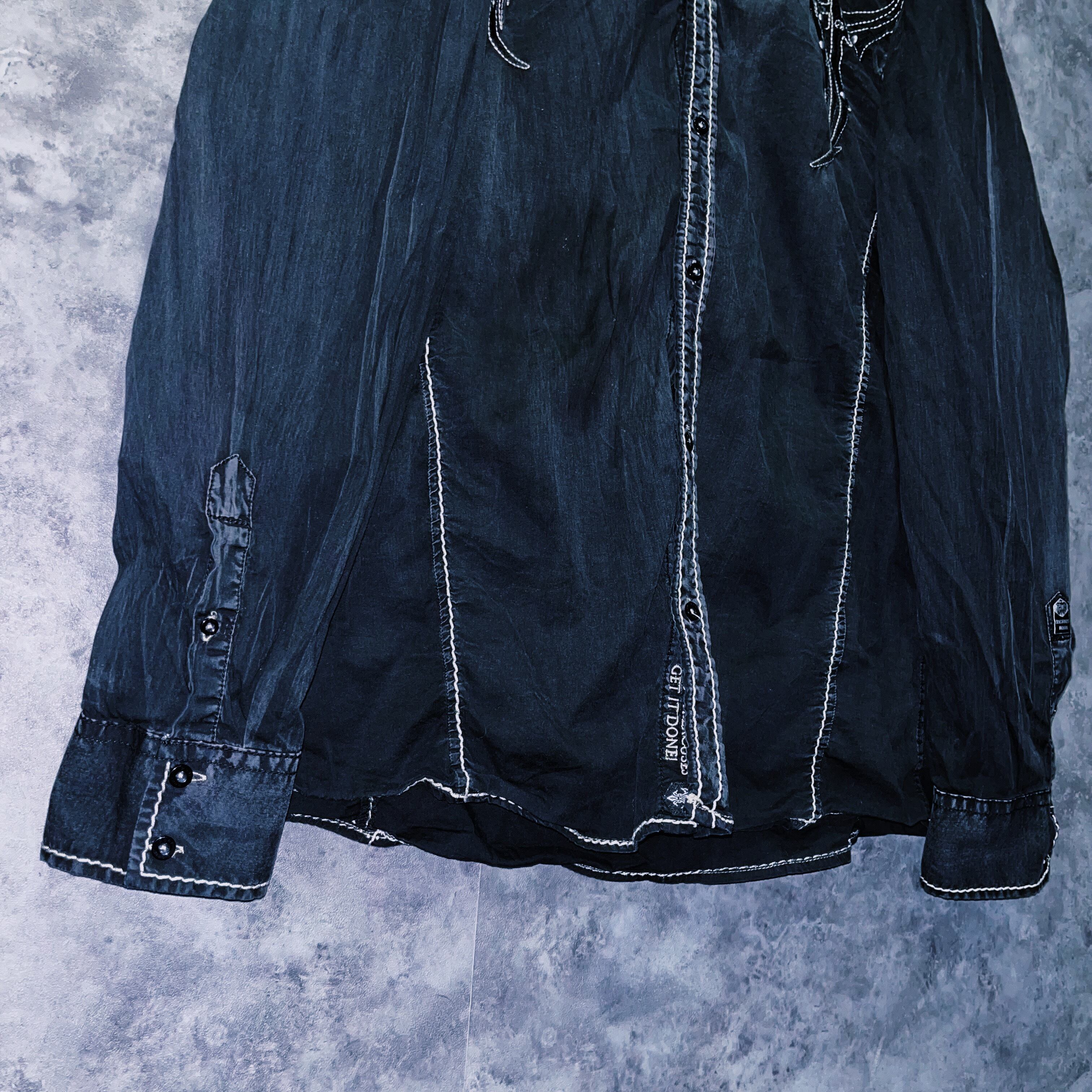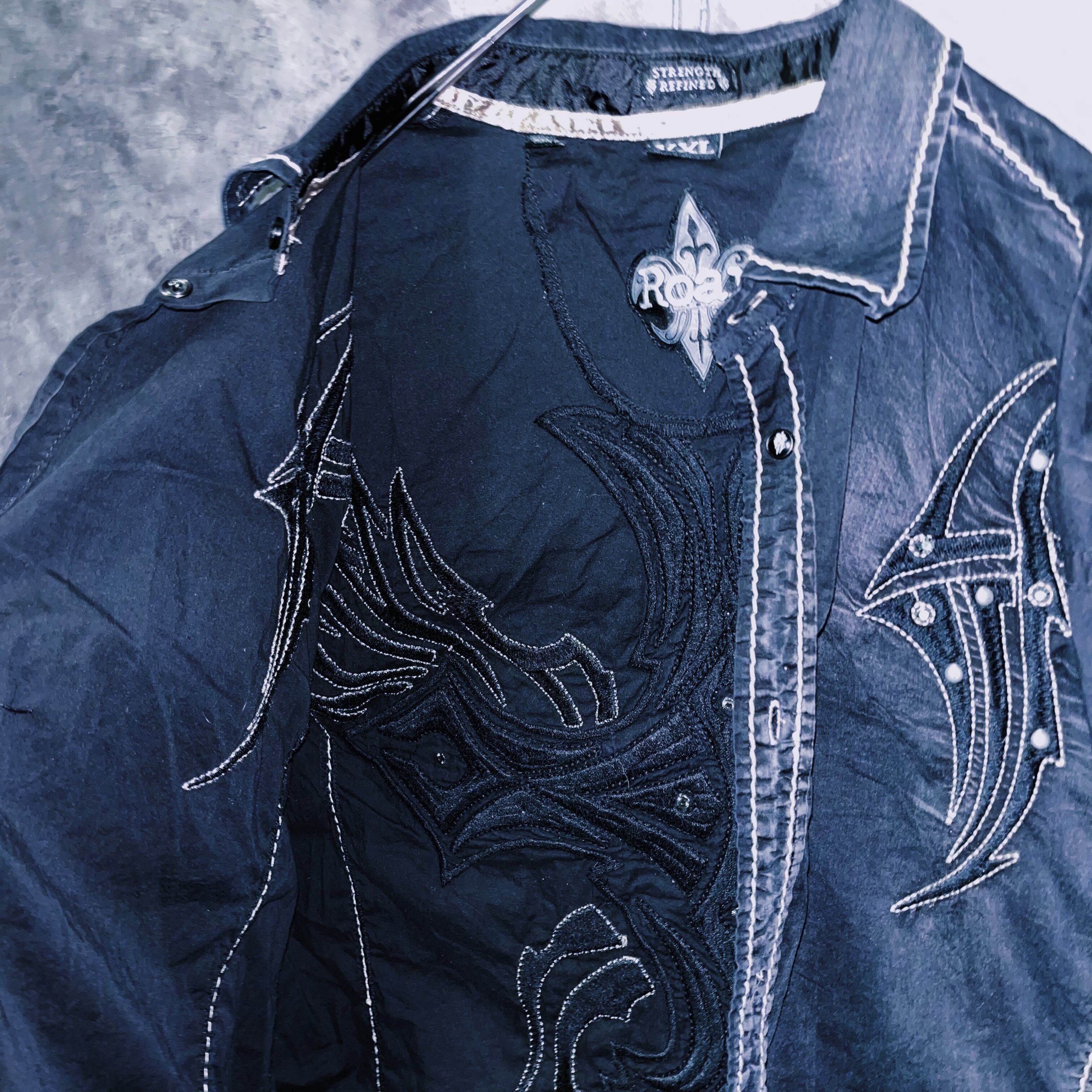 炭黒のボディ、刺繍に白のステッチが素晴らしいデザイン性とアクセントになっているシャツ。