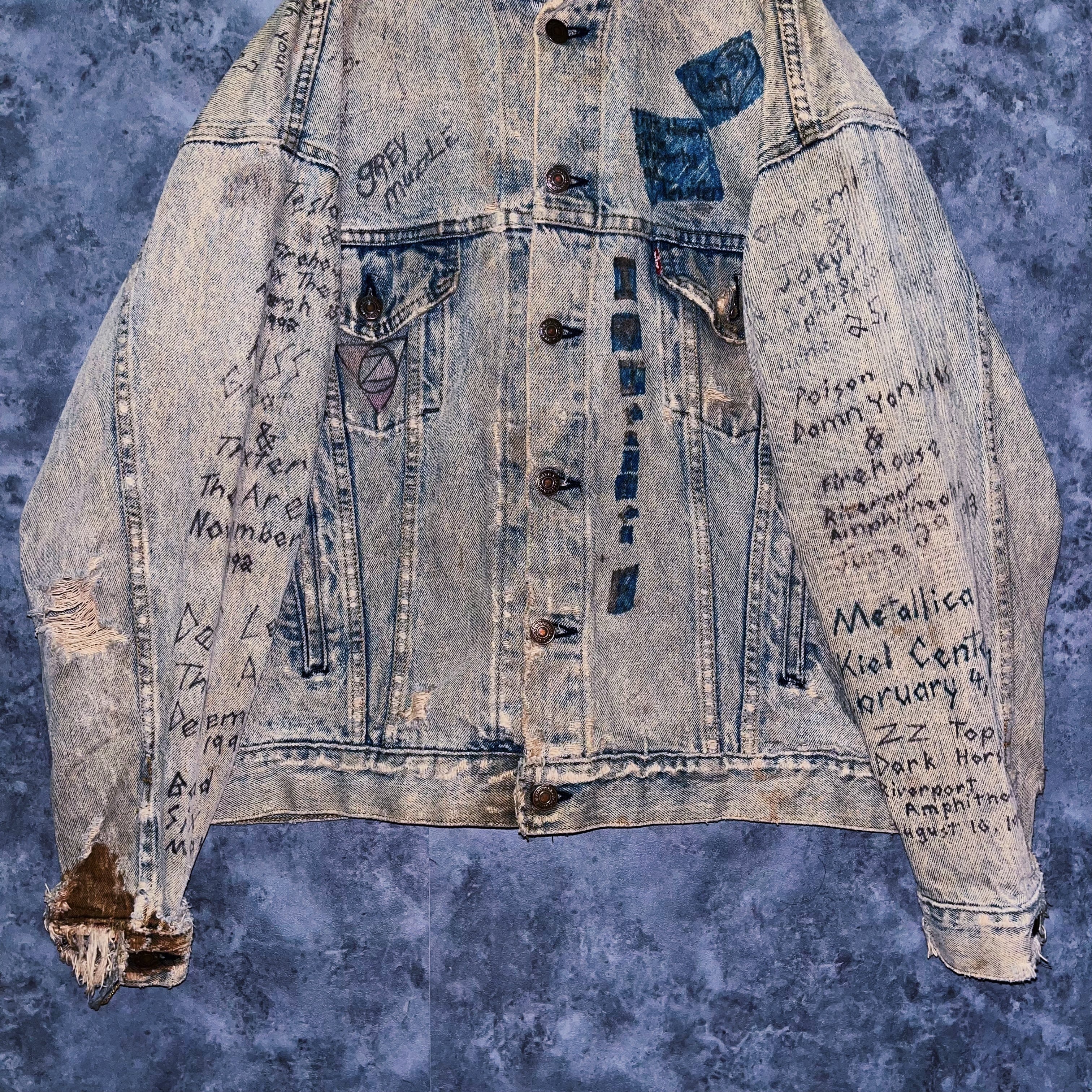 ボディ、アーム、バックと全方向に“MTTALLICA”をはじめとするバンド名や日付が描かれており、バンドのライブに行った記念の日を記入していたのかも、と想像ができるデザイン。
