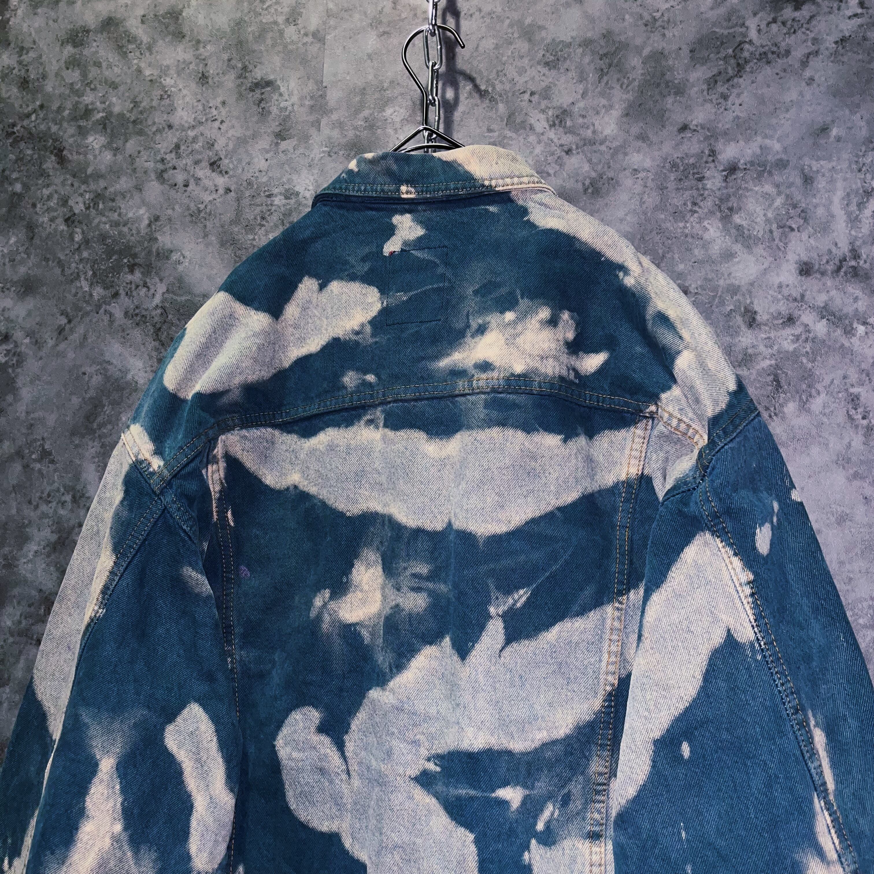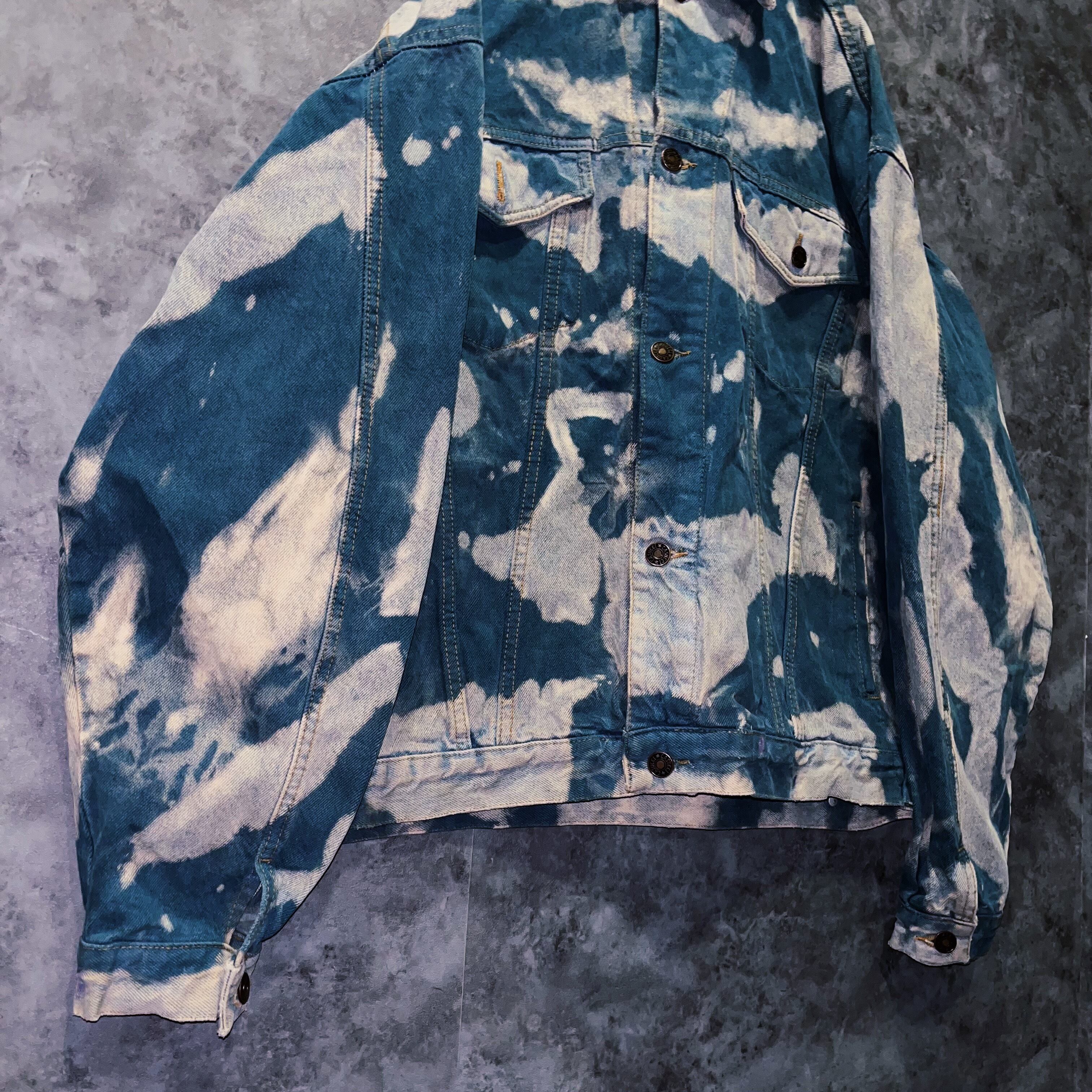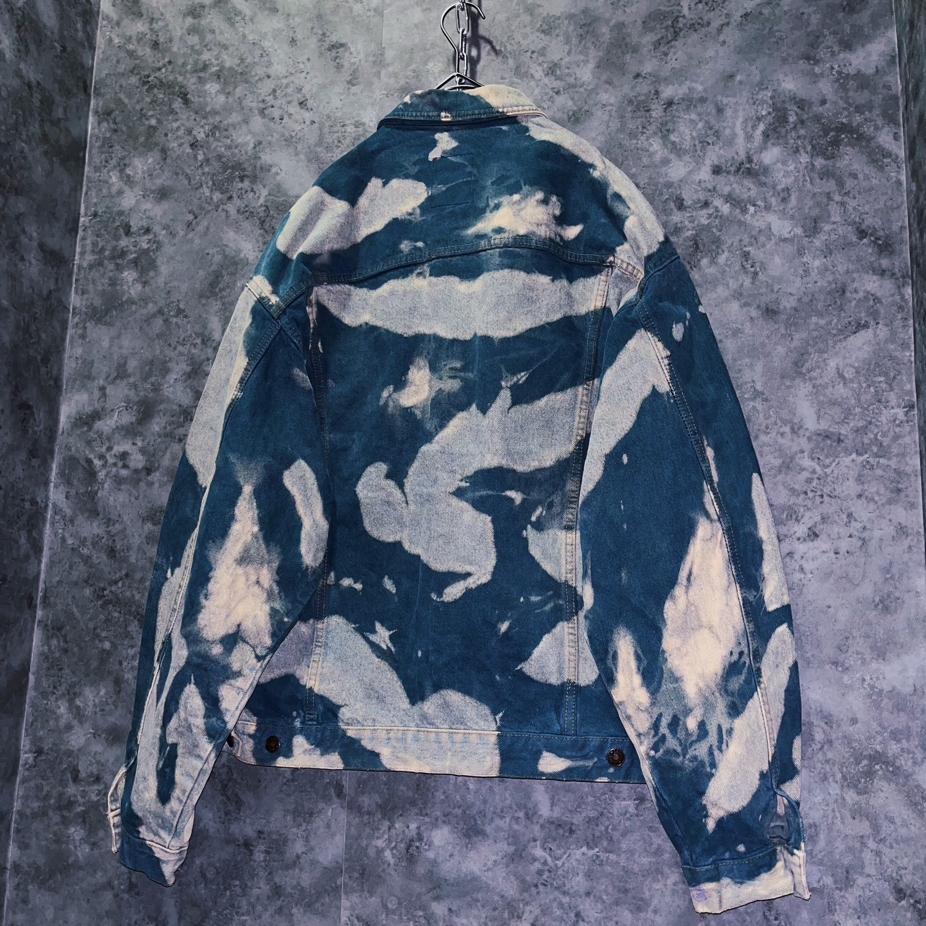深めなブルーデニムにブリーチ加工をしたような淡い白が雲のような印象を受けるデザインのデニムジャケットです。