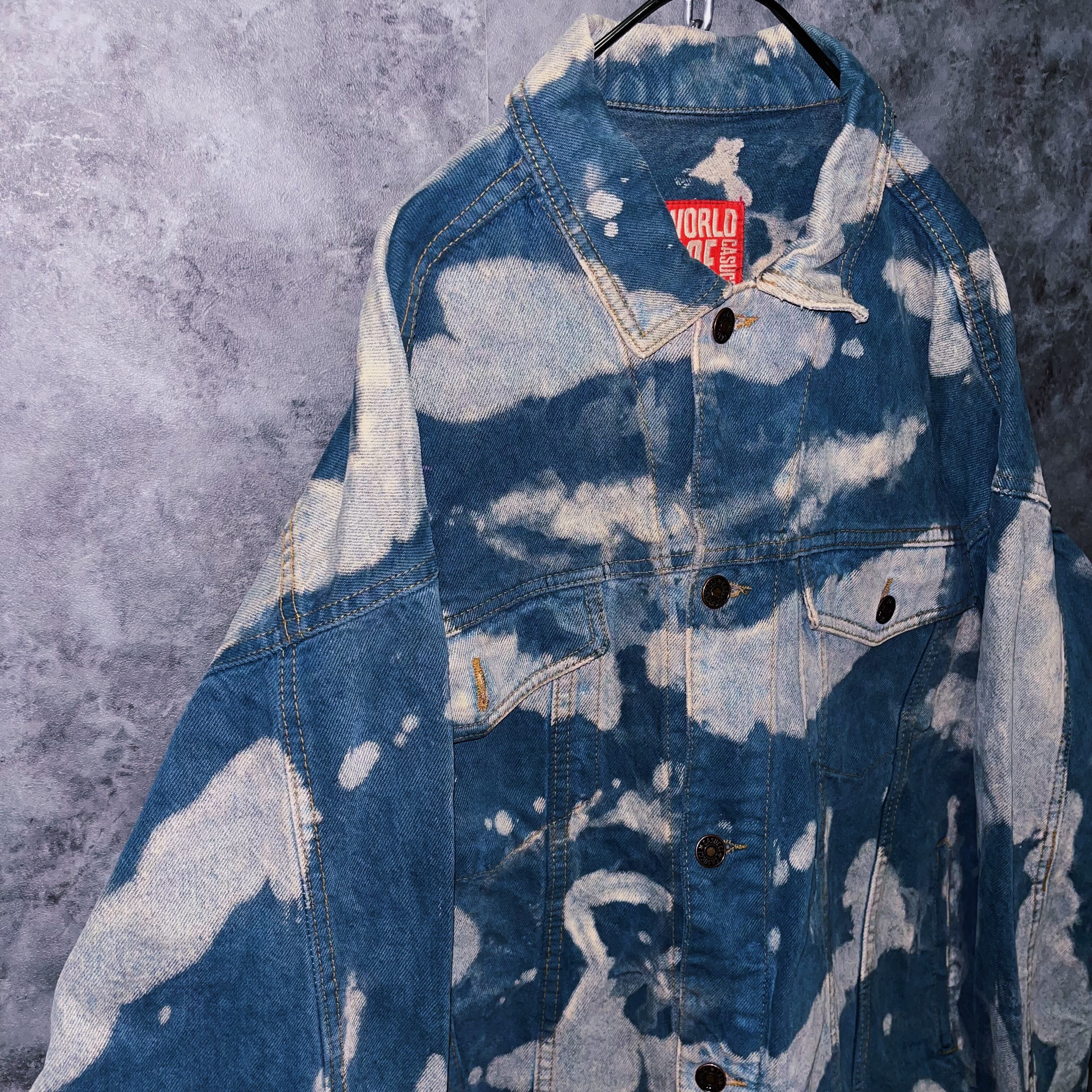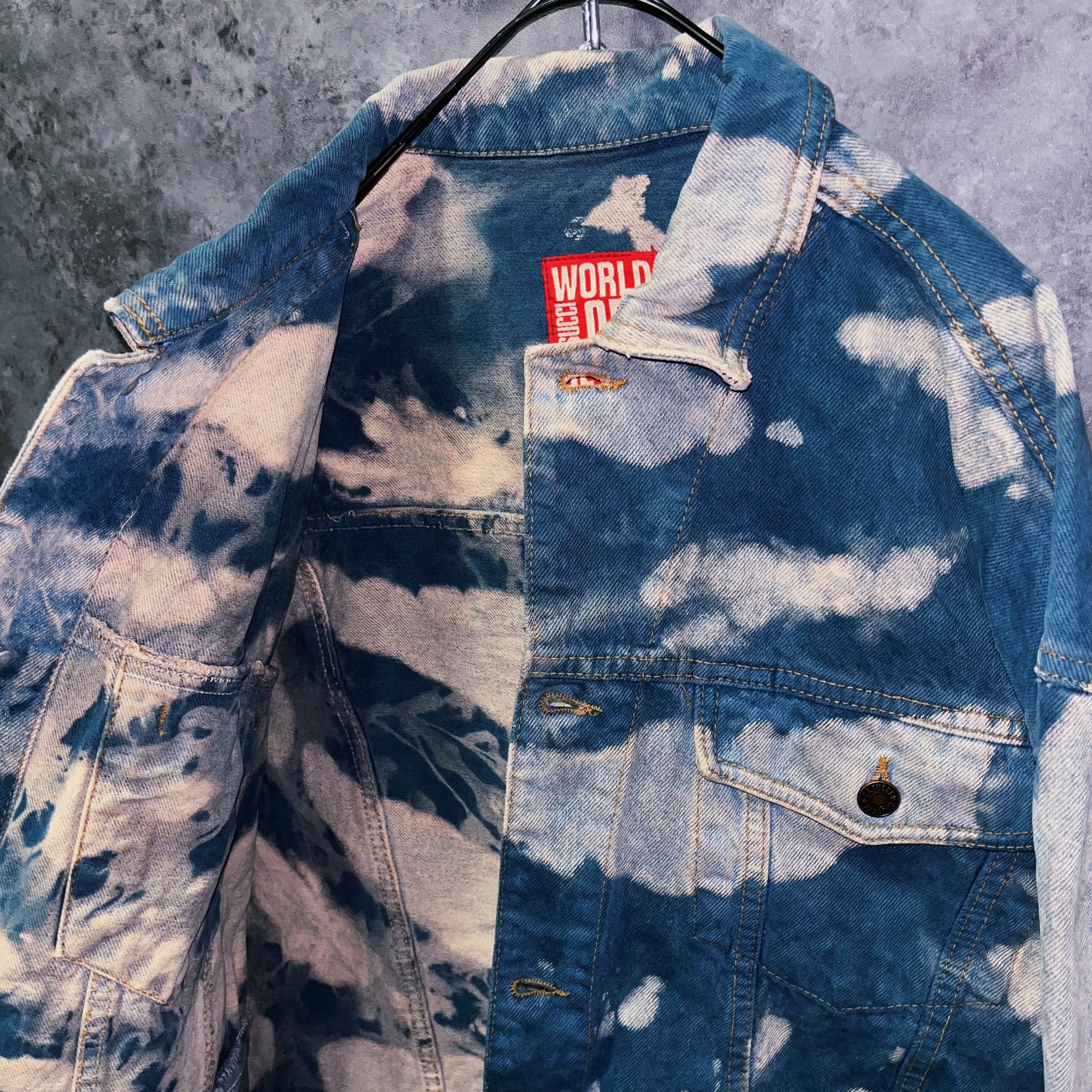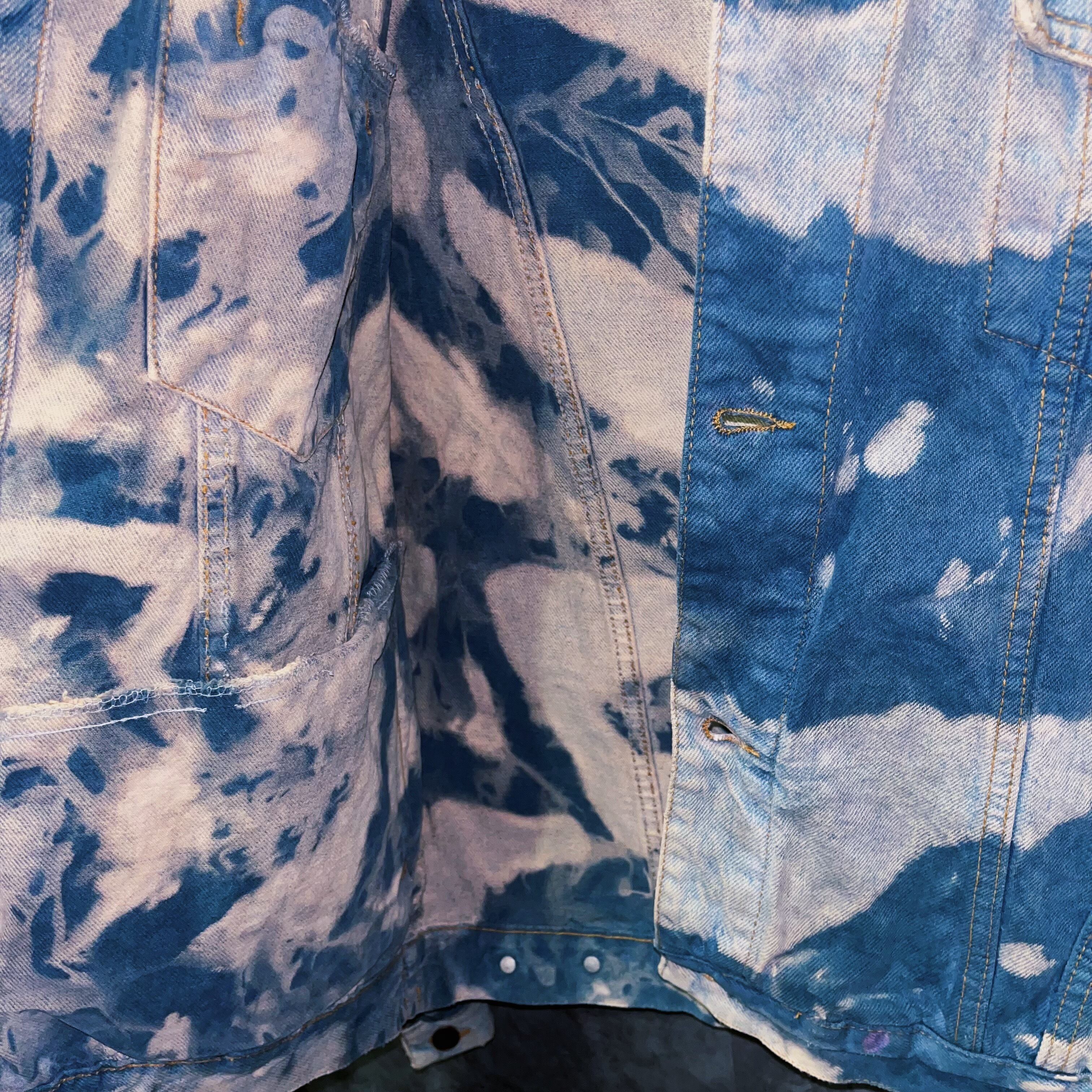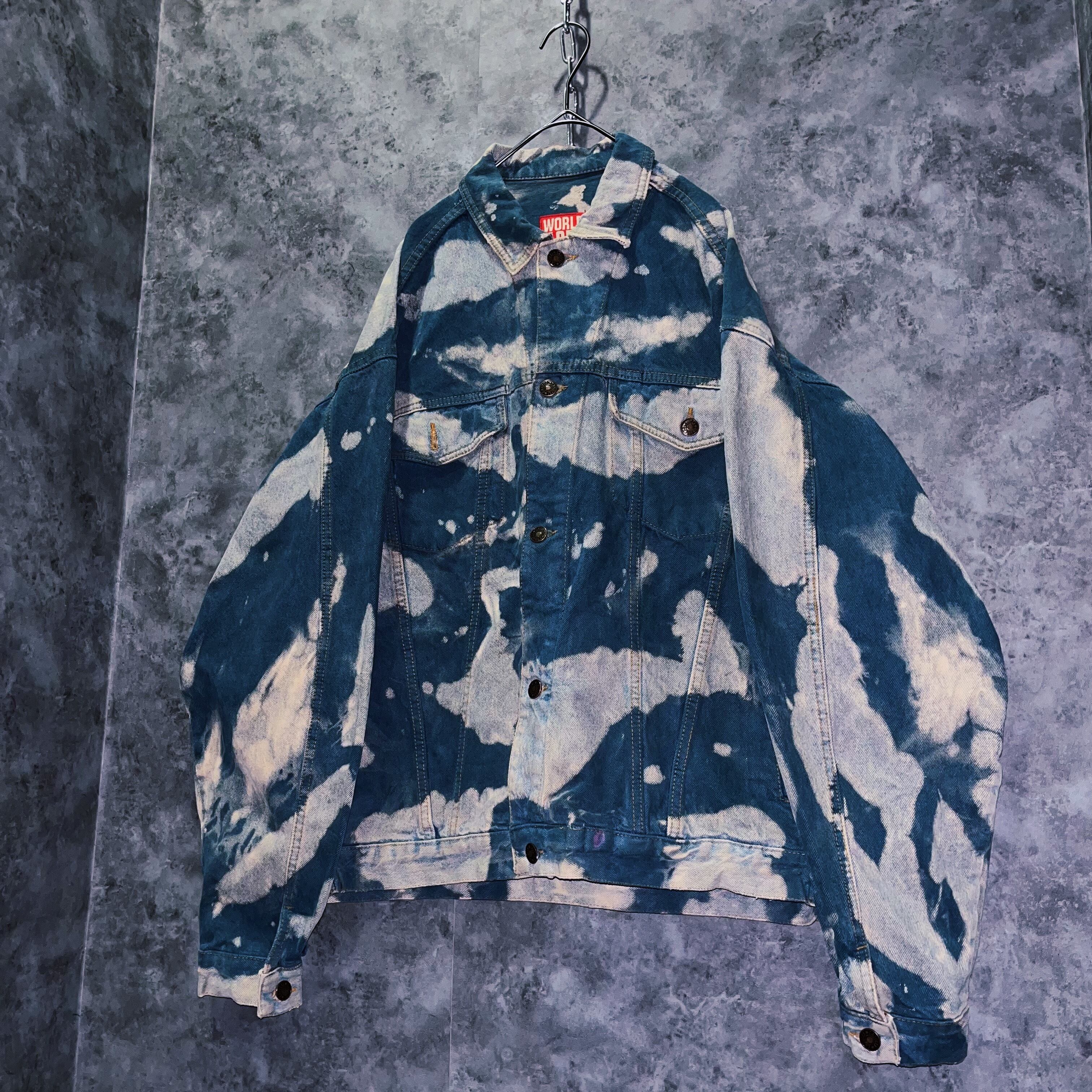 深めなブルーデニムにブリーチ加工をしたような淡い白が雲のような印象を受けるデザインのデニムジャケットです。