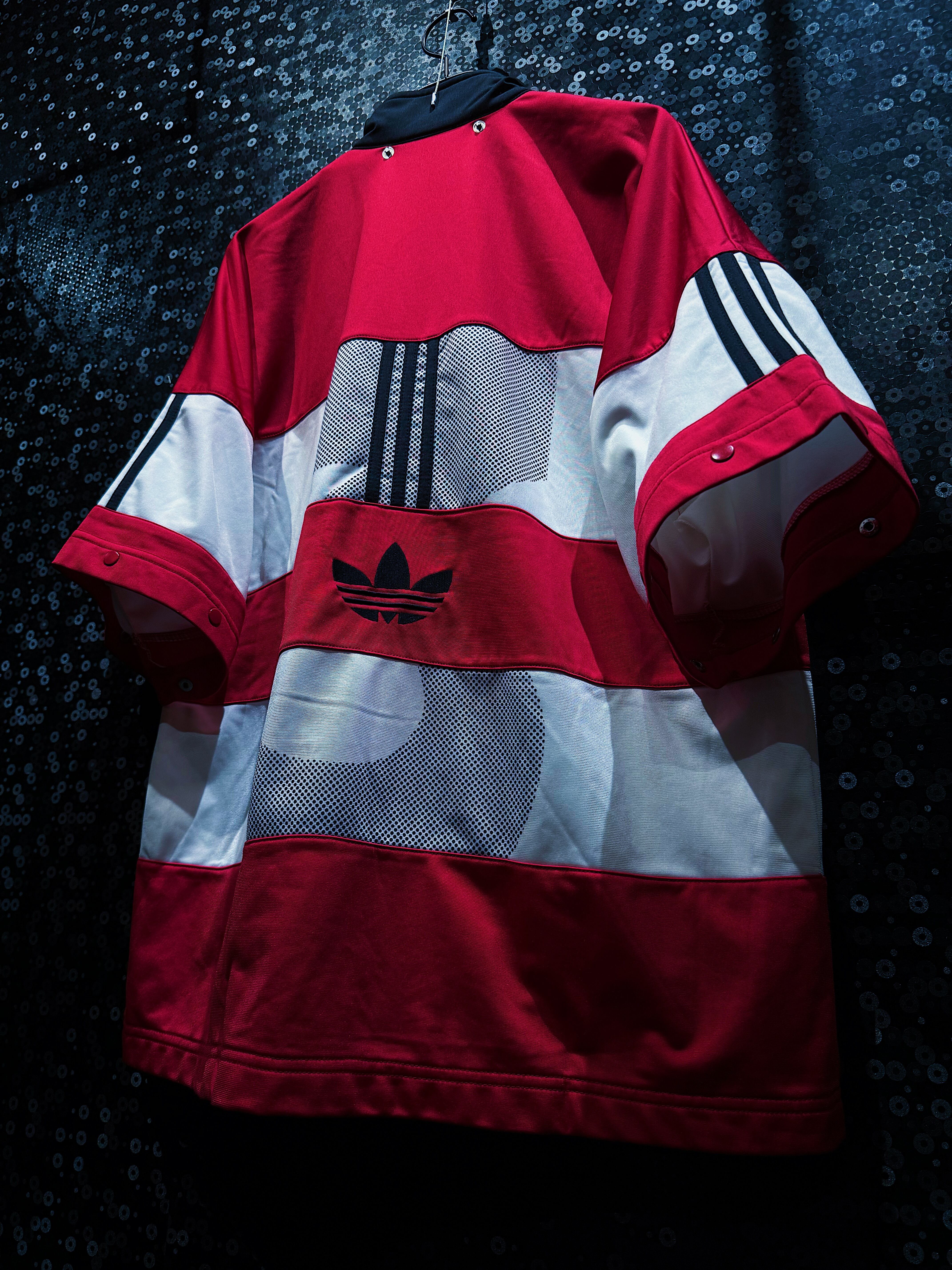 胸元にはドットで構成された「3」のナンバリングと黒のロゴ刺繍が入り、背面には大胆にスリーストライプとトレフォイルが配置されたインパクト重視のデザイン。