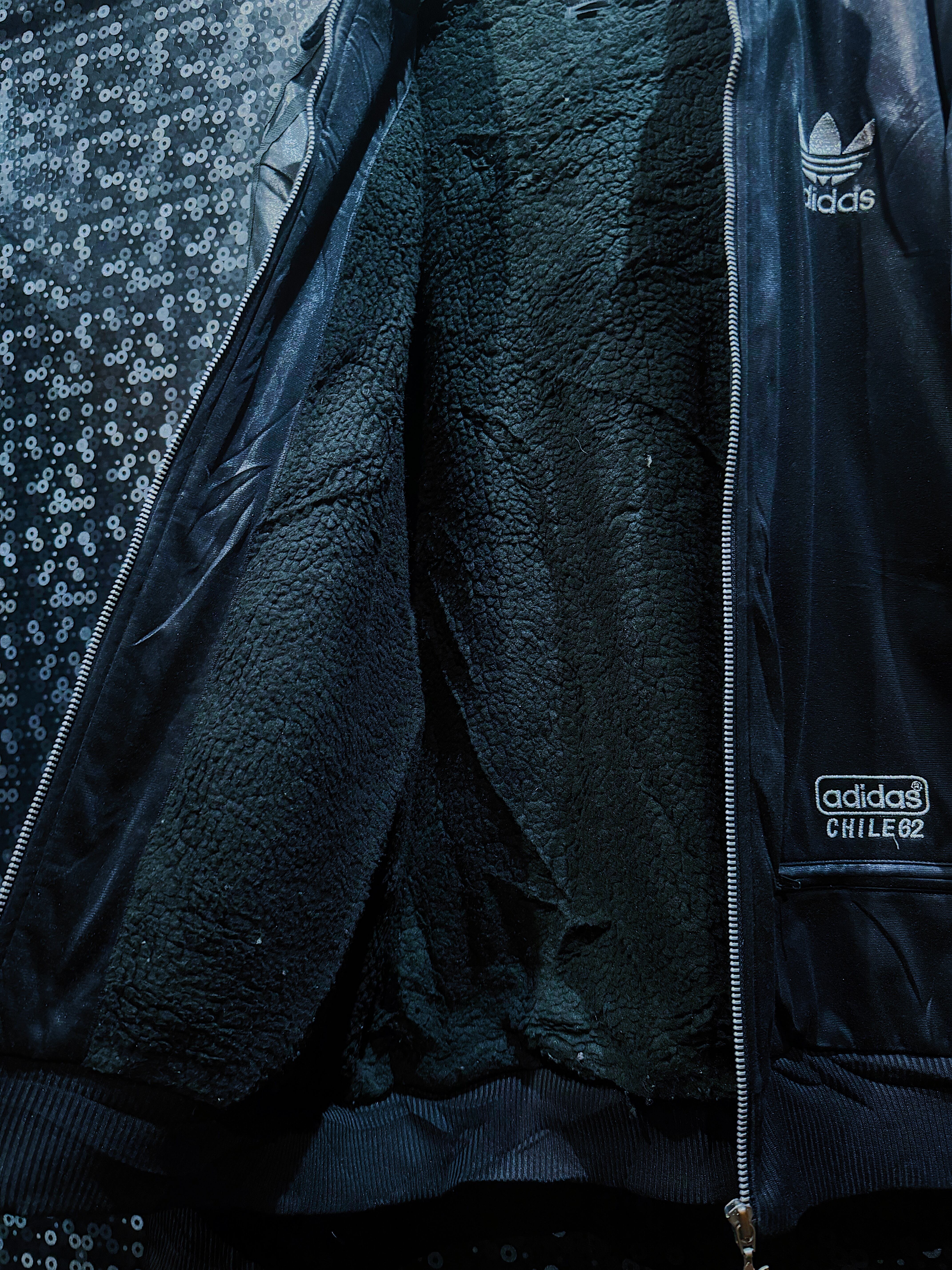 Adidasの名作「CHILE 62」シリーズのボア裏地付きジャケットで、フェイクレザーのような艶感あるシェルに、トレフォイルロゴと「adidas CHILE 62」の金糸刺繍が入った、圧倒的存在感を放つ一着です。ヴィンテージラインながらスポーツミックスにもラグジュアリーにも振れる万能さが魅力。