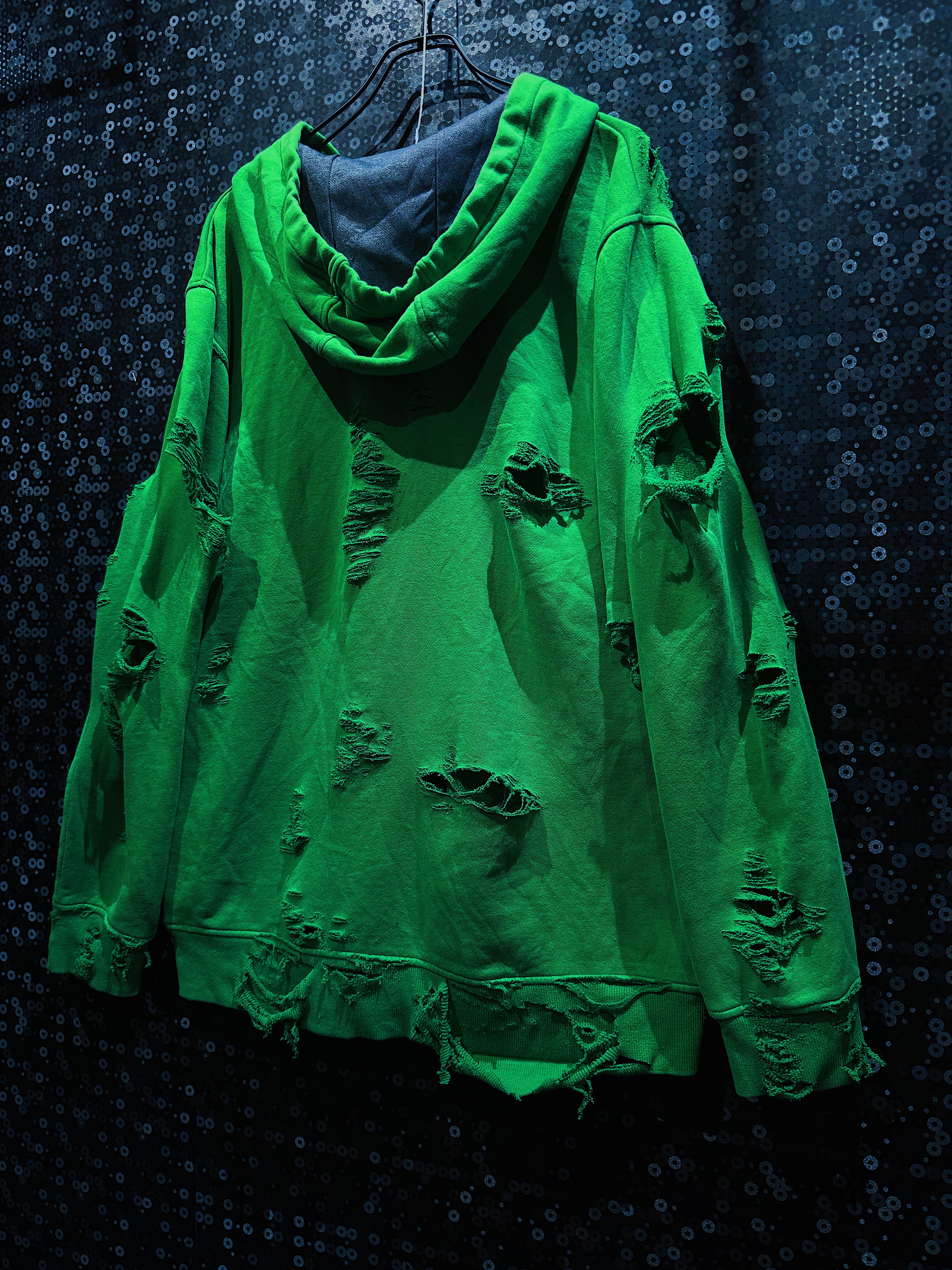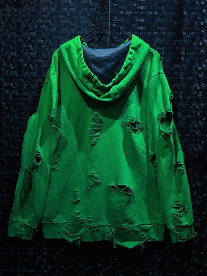 くたっとした質感と柔らかなコットンの裏起毛による着心地は、着るほどに馴染み、個性が増していく仕様。リブのダメージ感やポケットまわりのほつれも「使い込まれた美学」としてデザインに組み込まれており、ラフな装いの中に緻密なバランスが宿っています。