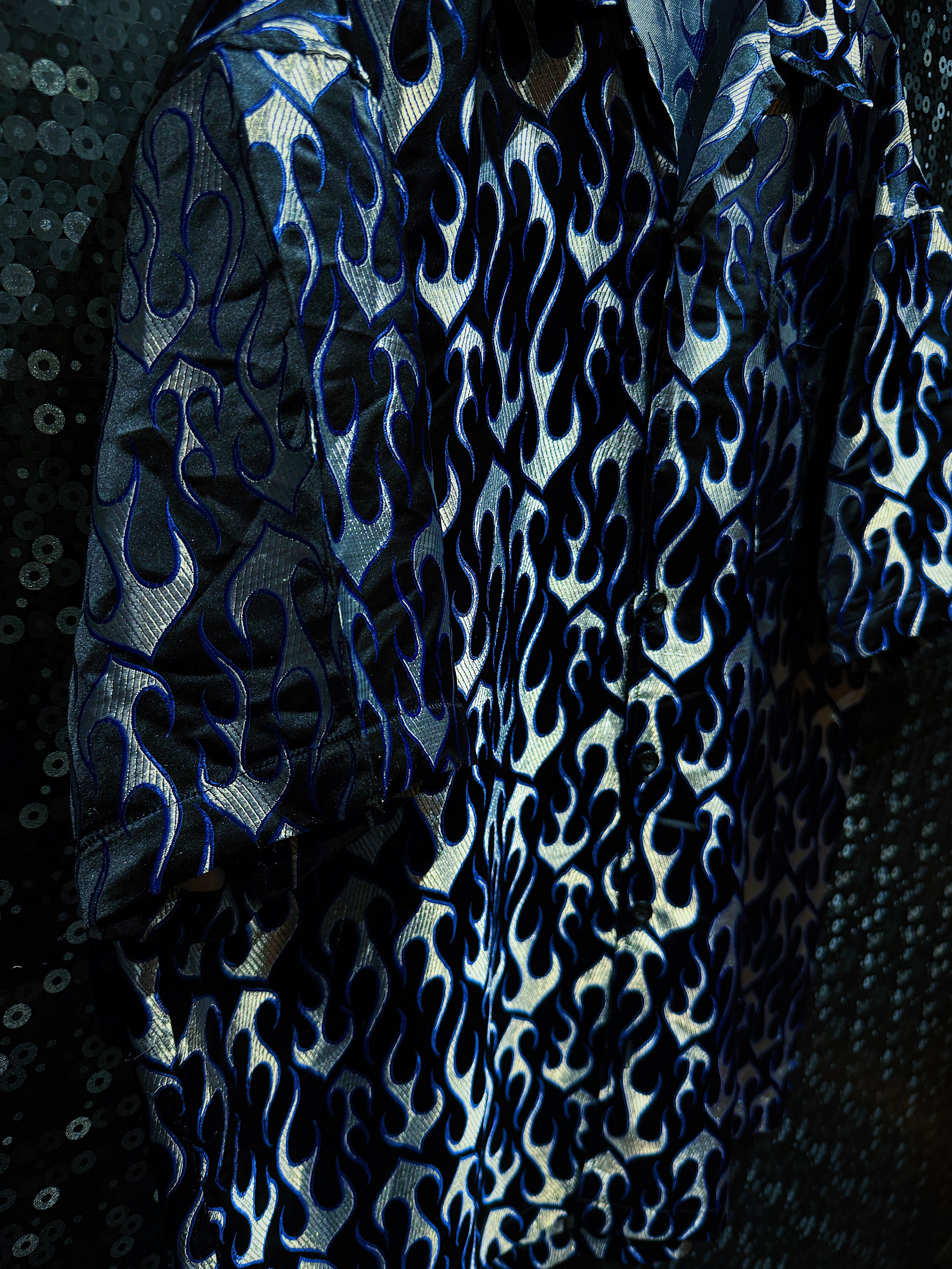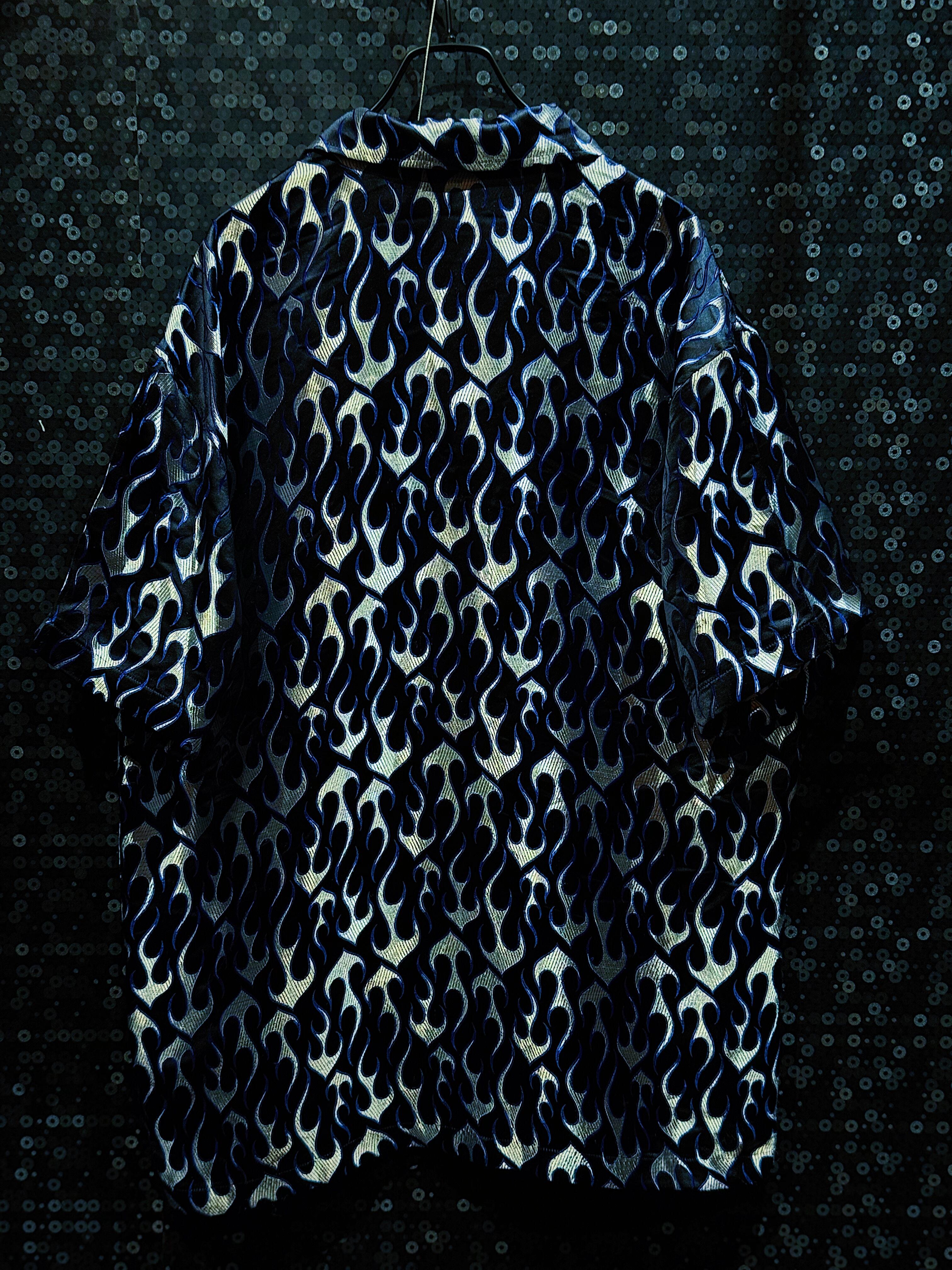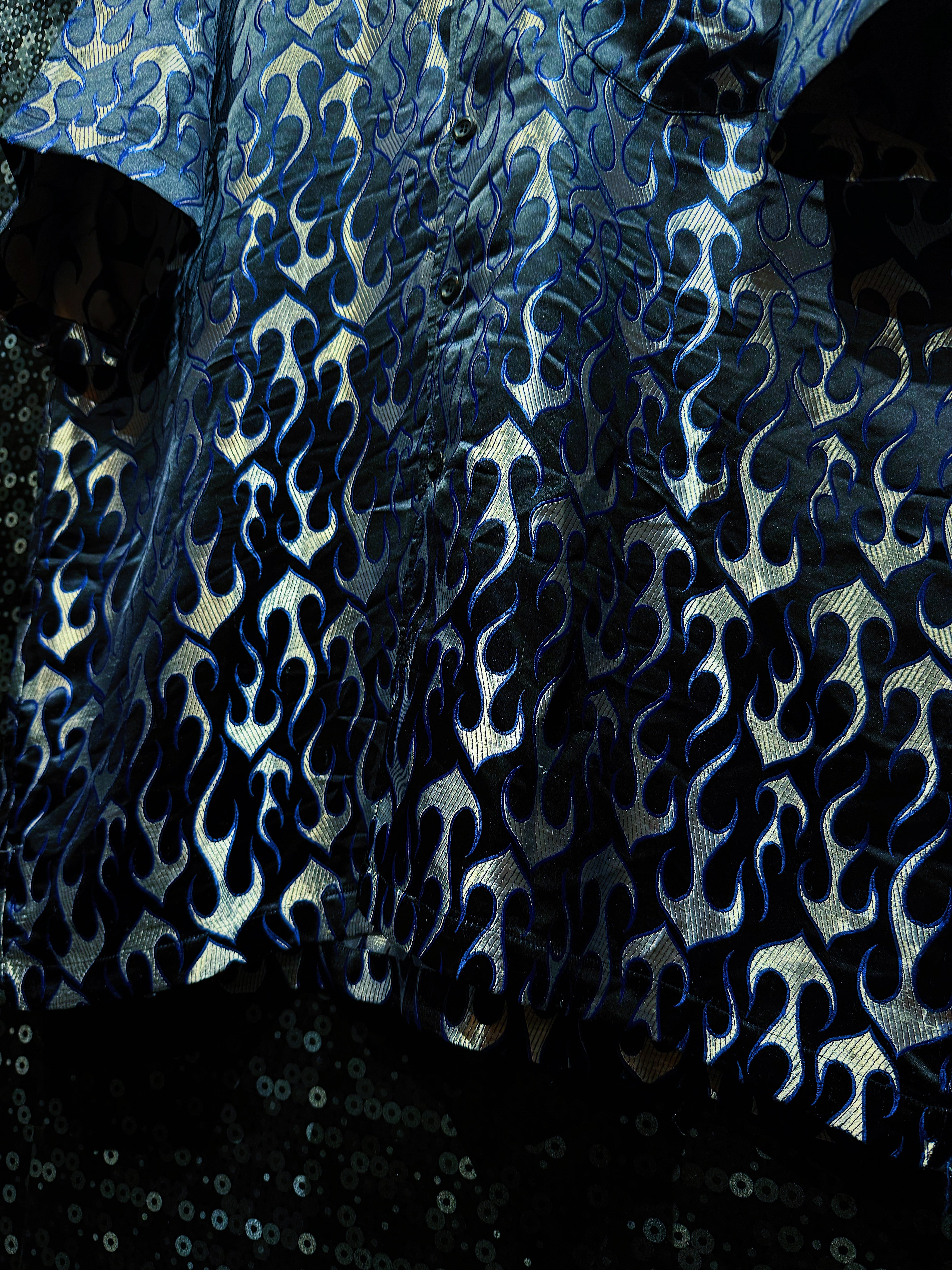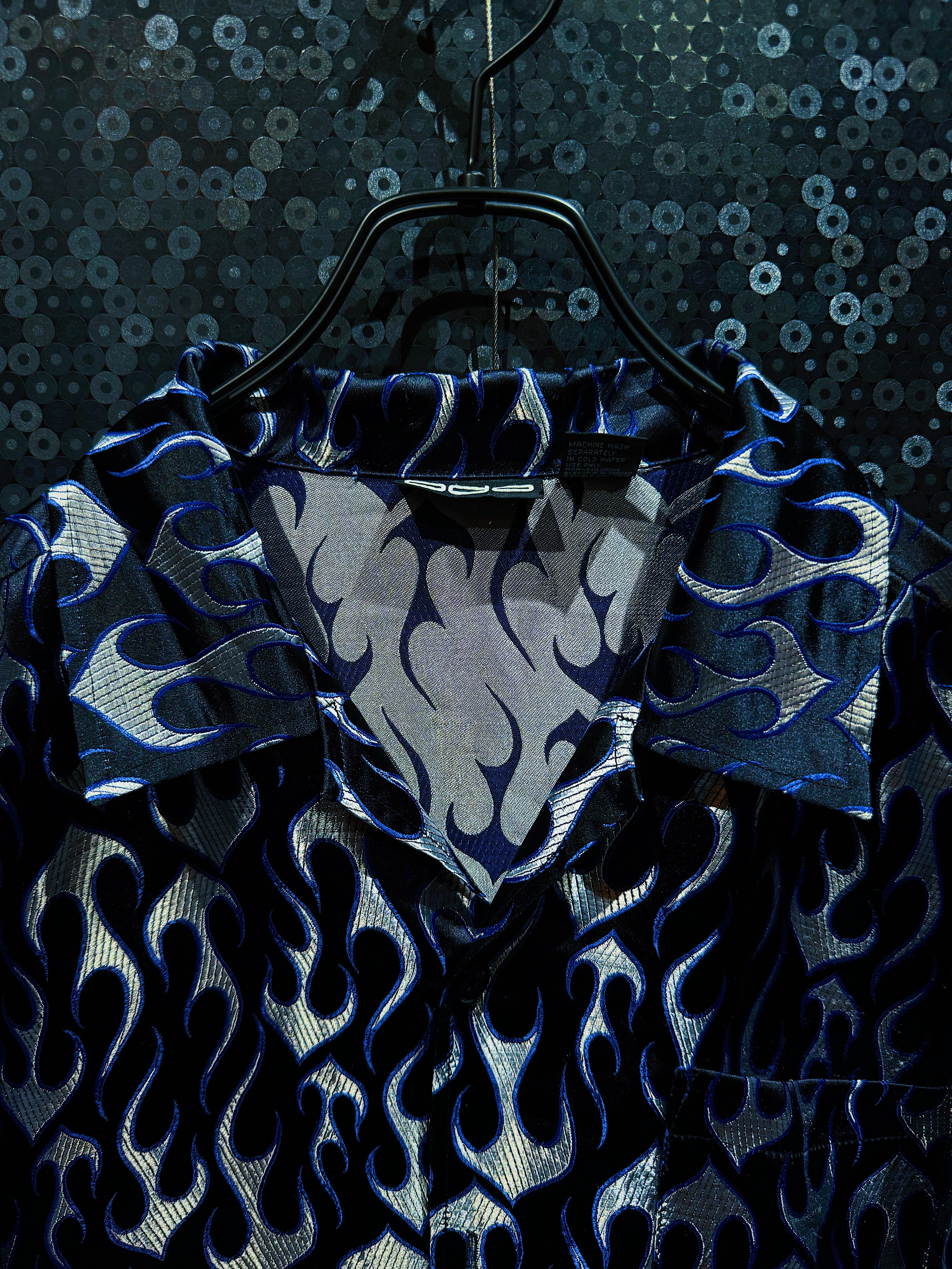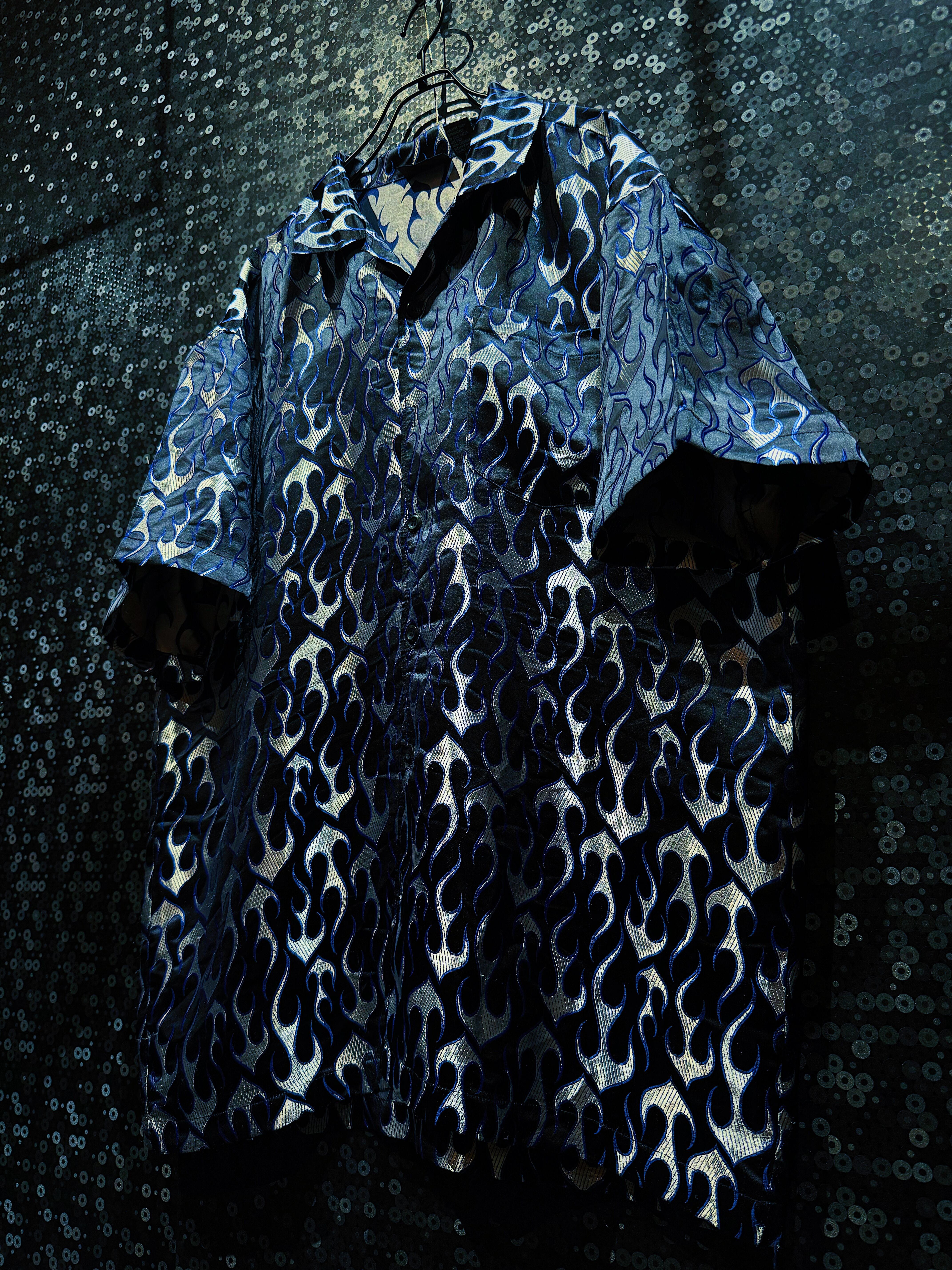 2000年代ヒップホップスタイルを色濃く残した「BBO」ブランドによるヴィンテージフレイムシャツ。全面に施された青×銀のフレイム(炎)柄が印象的で、光の角度で妖しく輝く光沢感のある生地が特徴です。