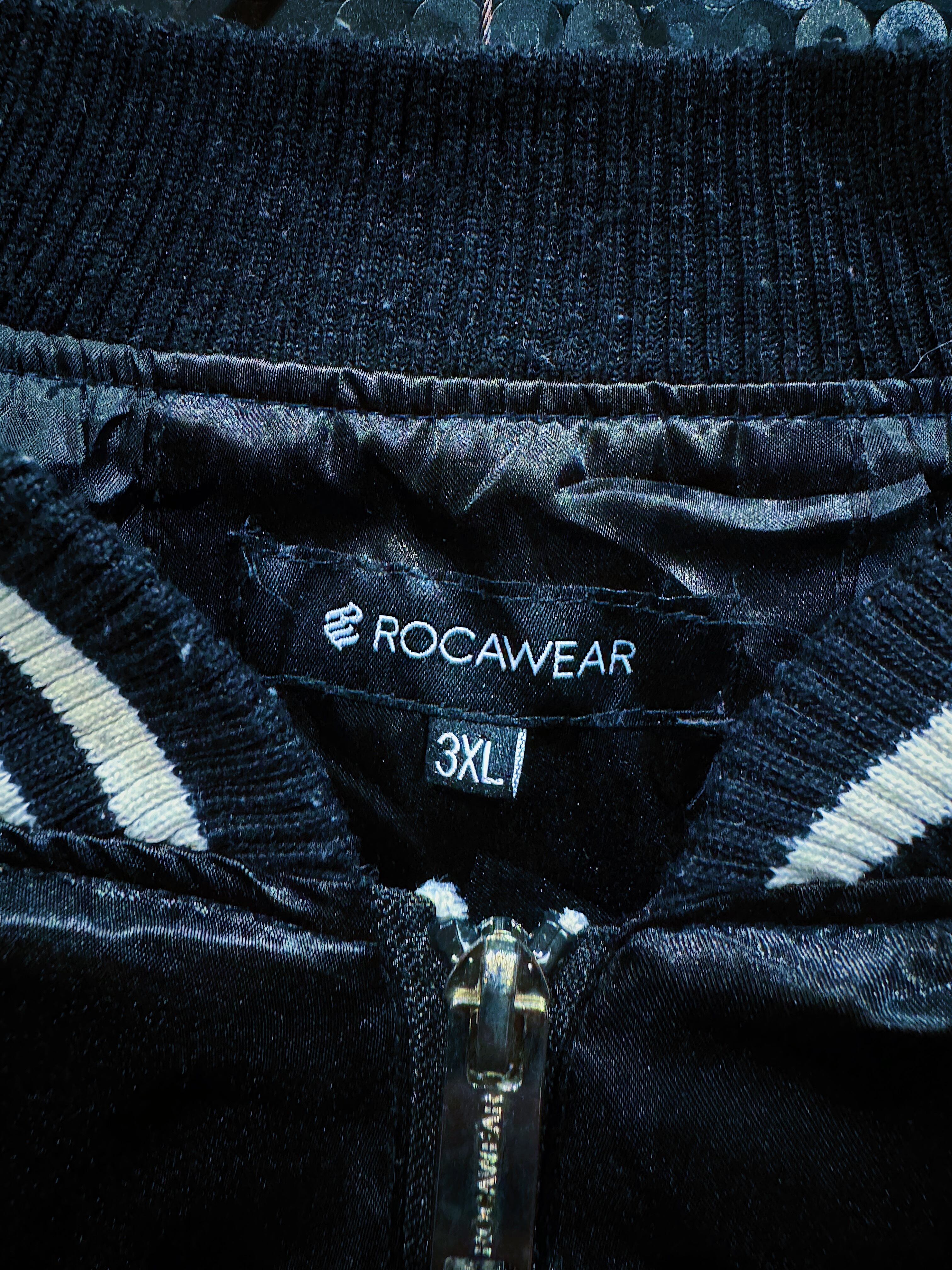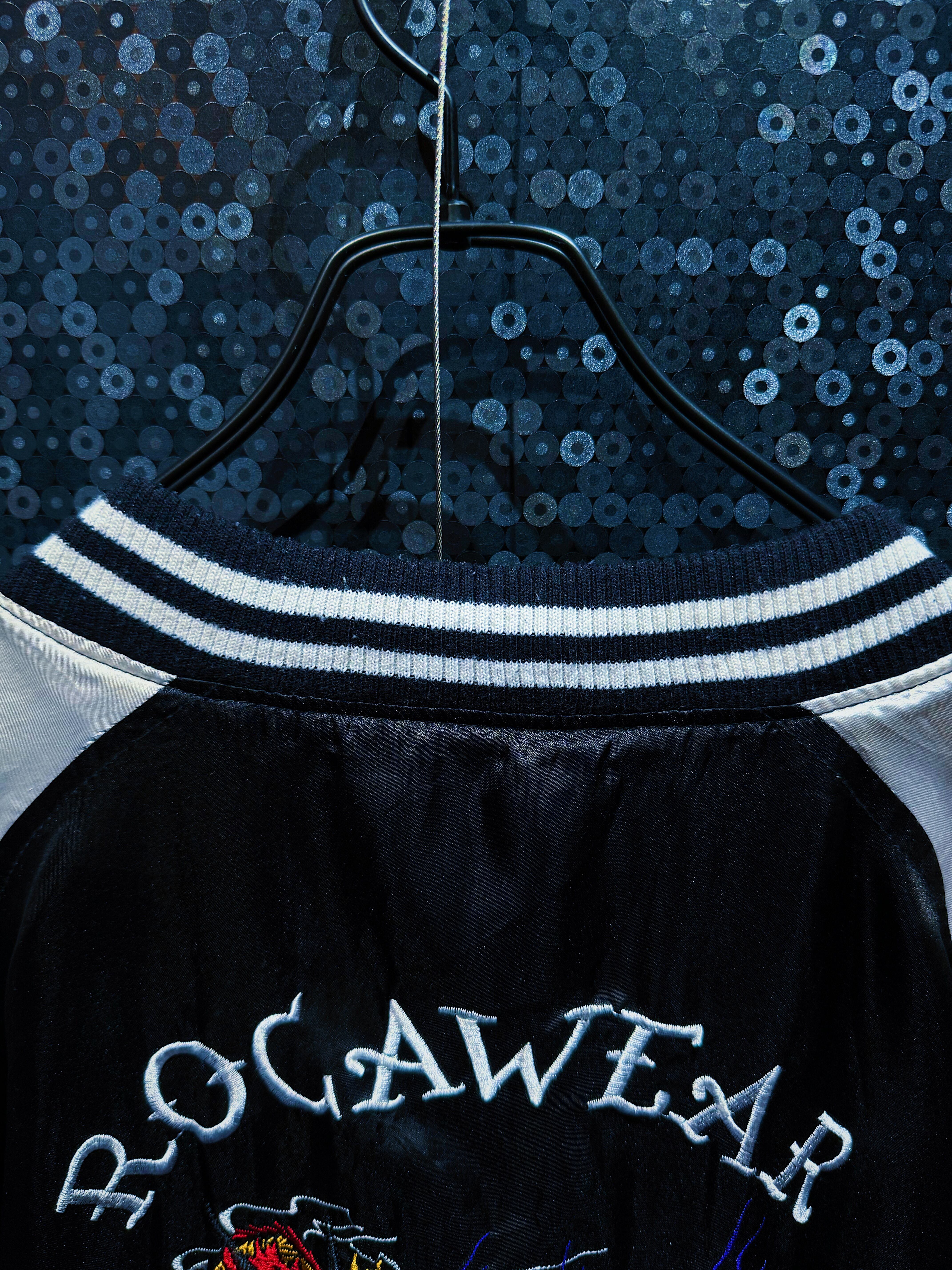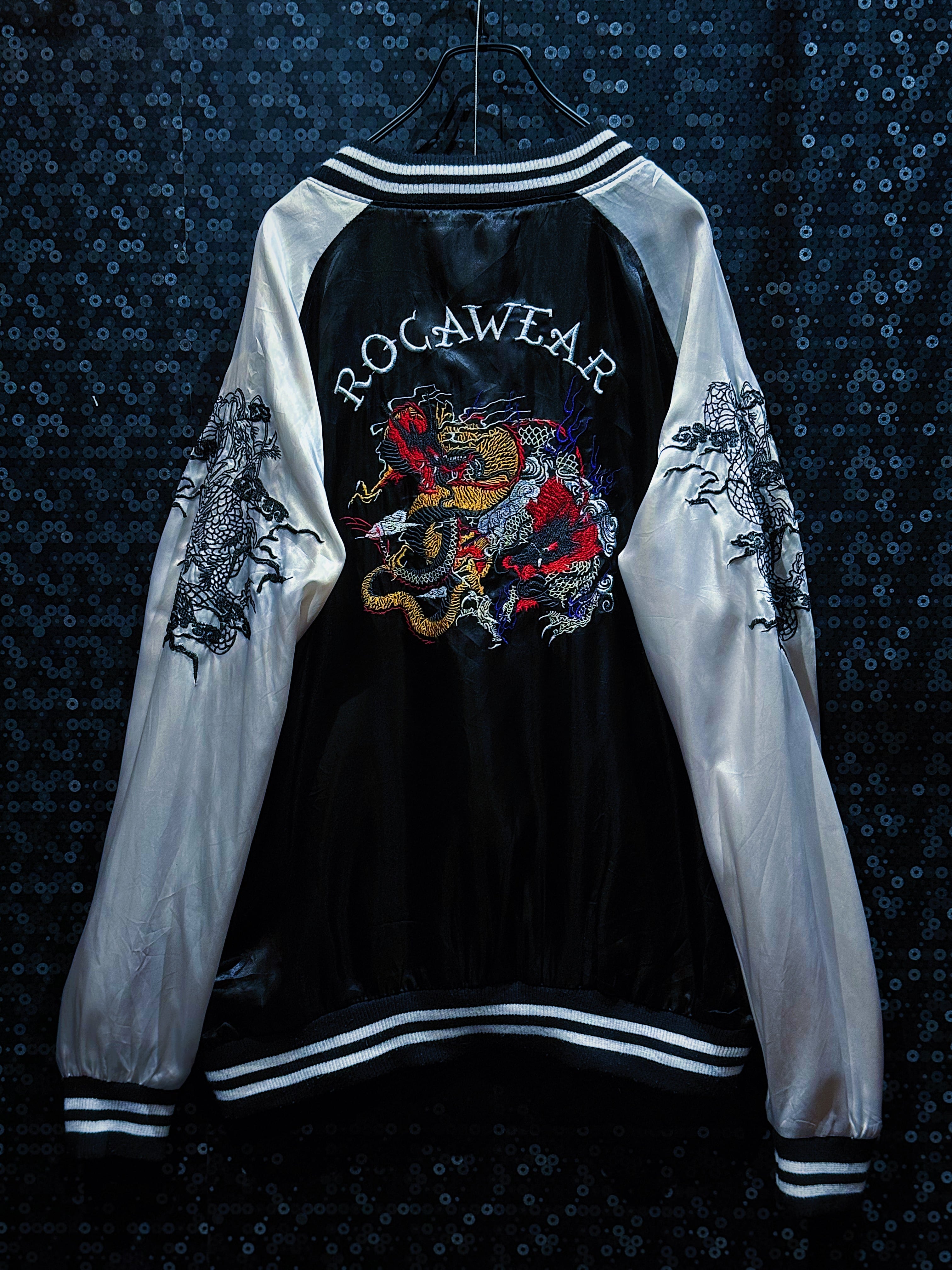 ROCAWEAR(ロカウェア)のヴィンテージスカジャンジャケット。黒×白の王道ツートンカラーをベースに、全面には黒豹の刺繍、袖には龍の姿が絡む大胆なアートワークが走り、背中にはROCAWEARのロゴとともに、火を噴く龍と虎が激突する豪華な刺繍が施された圧巻の一着です。
