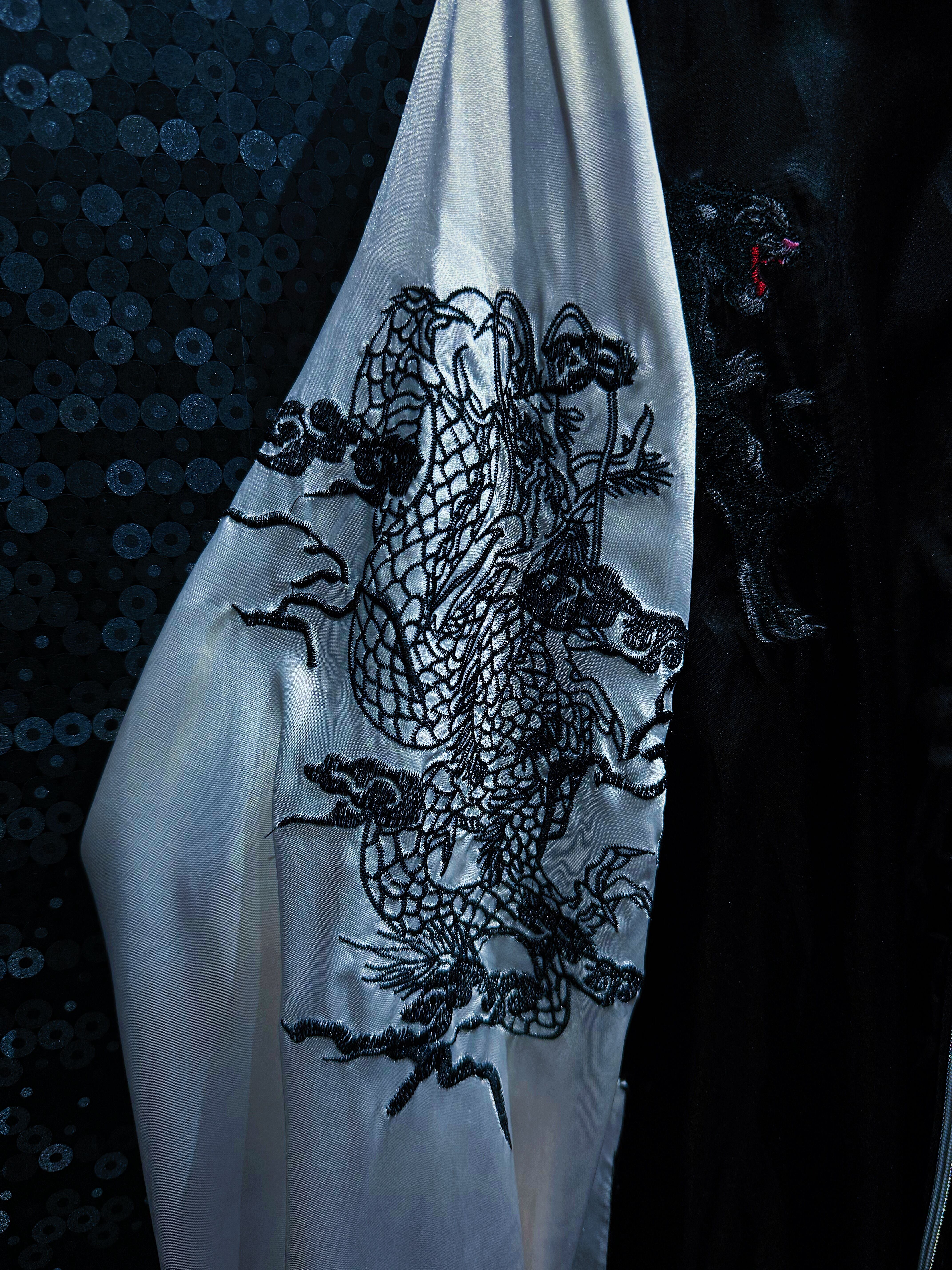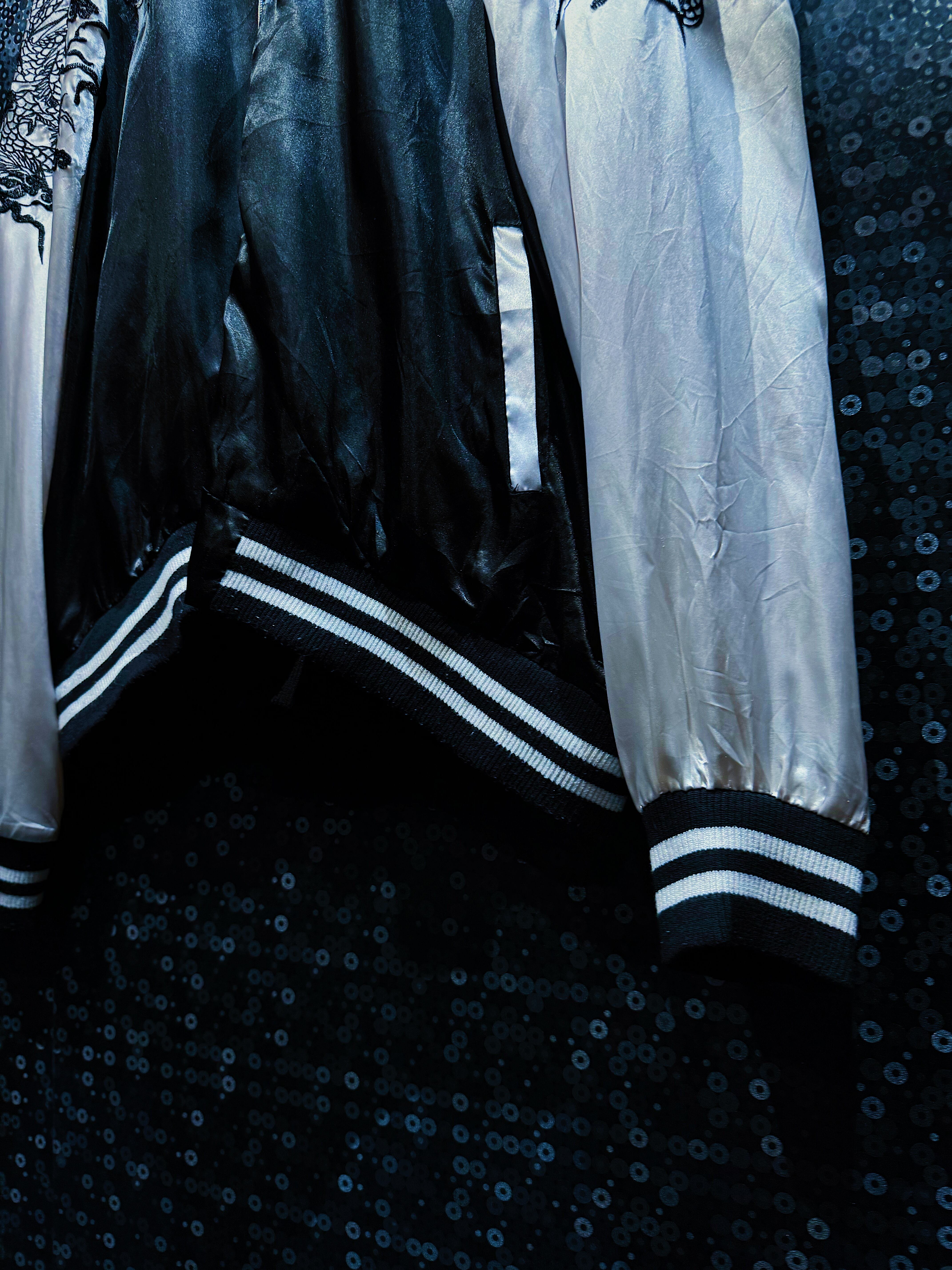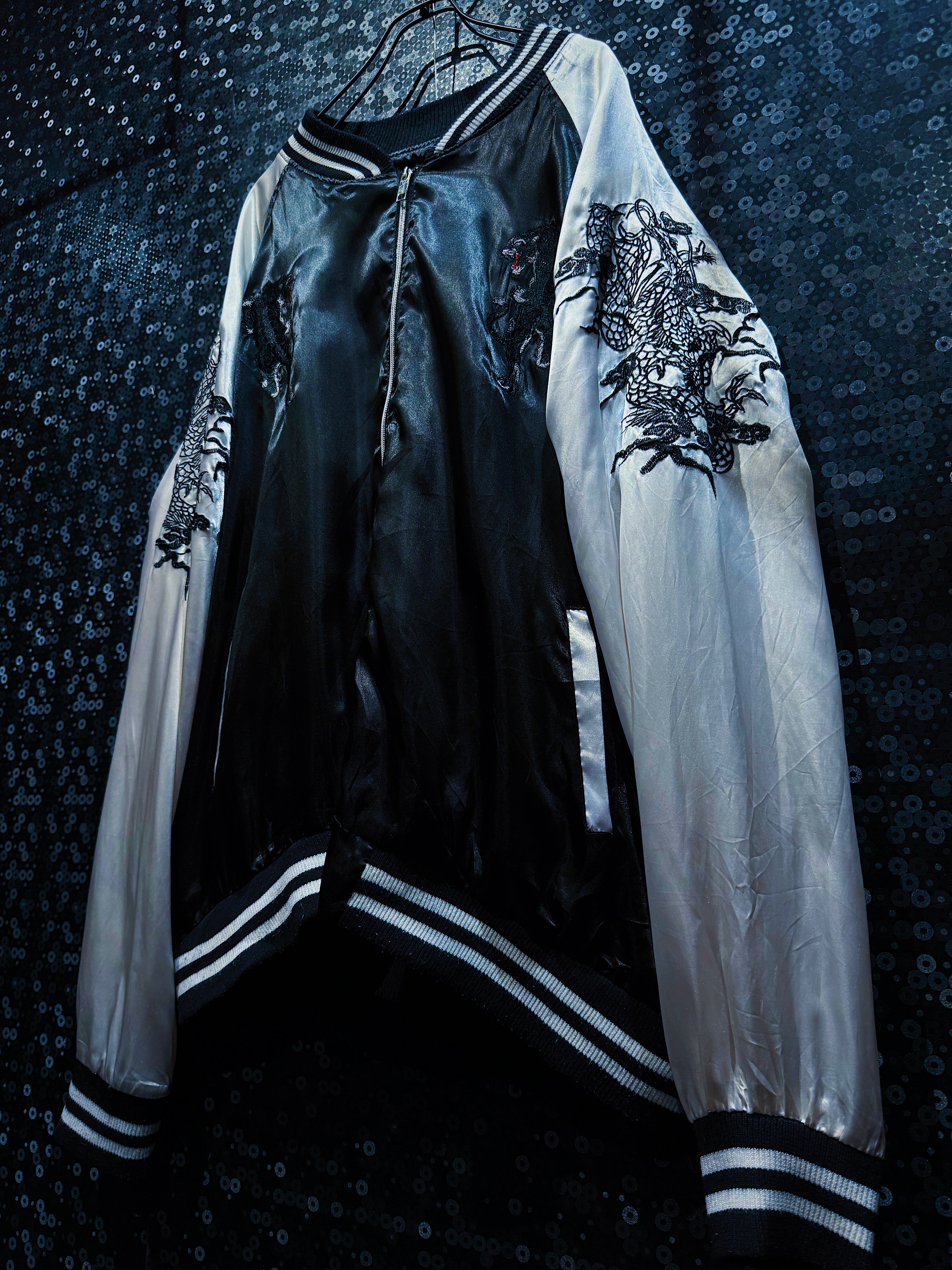 ボディには光沢感のあるサテン生地が使用されており、見る角度や照明によって妖しく輝く質感が魅力。着るだけで“主役”になるこのジャケットは、ヒップホップカルチャーと和風リスペクトの融合といえるデザイン。