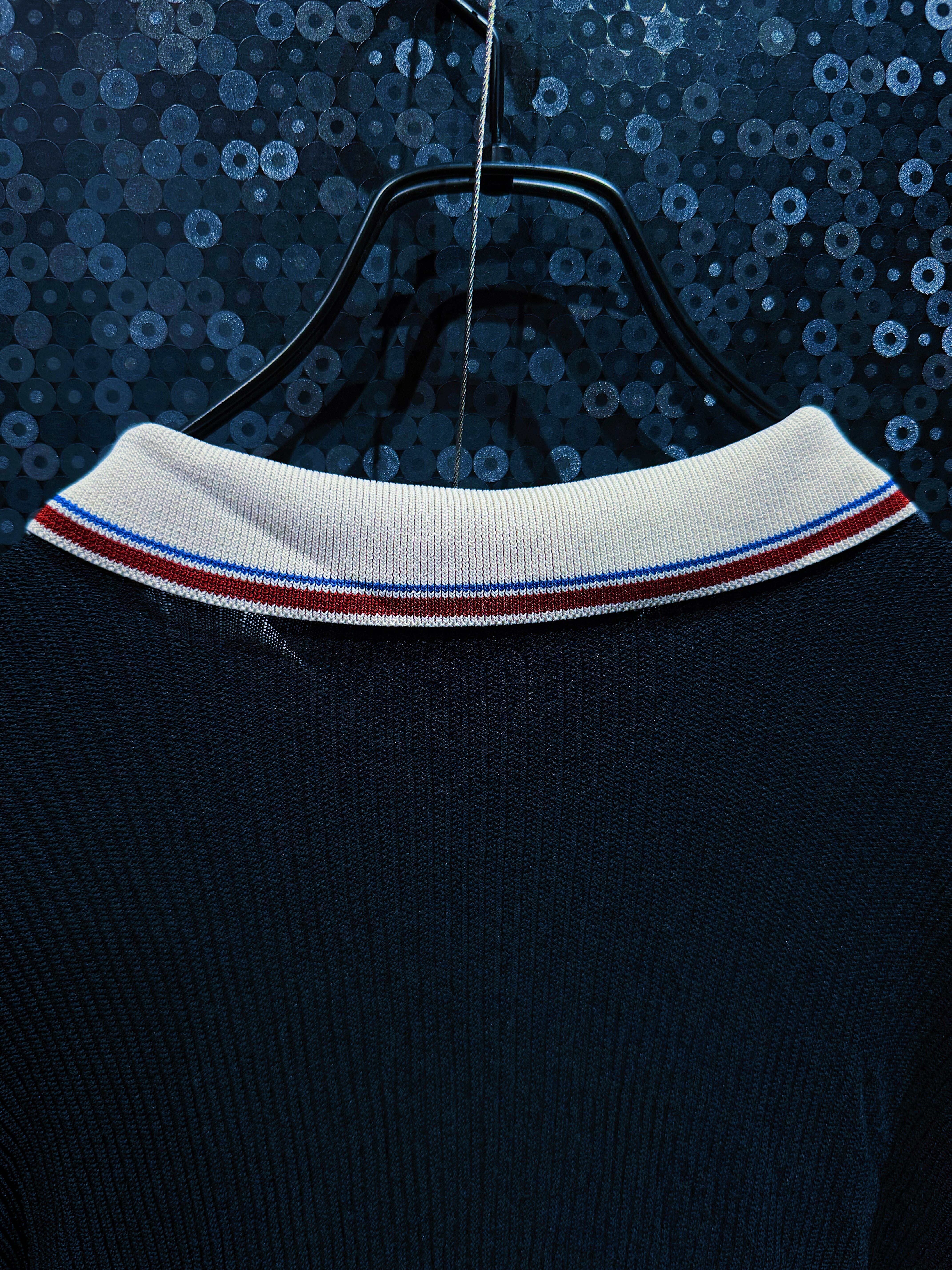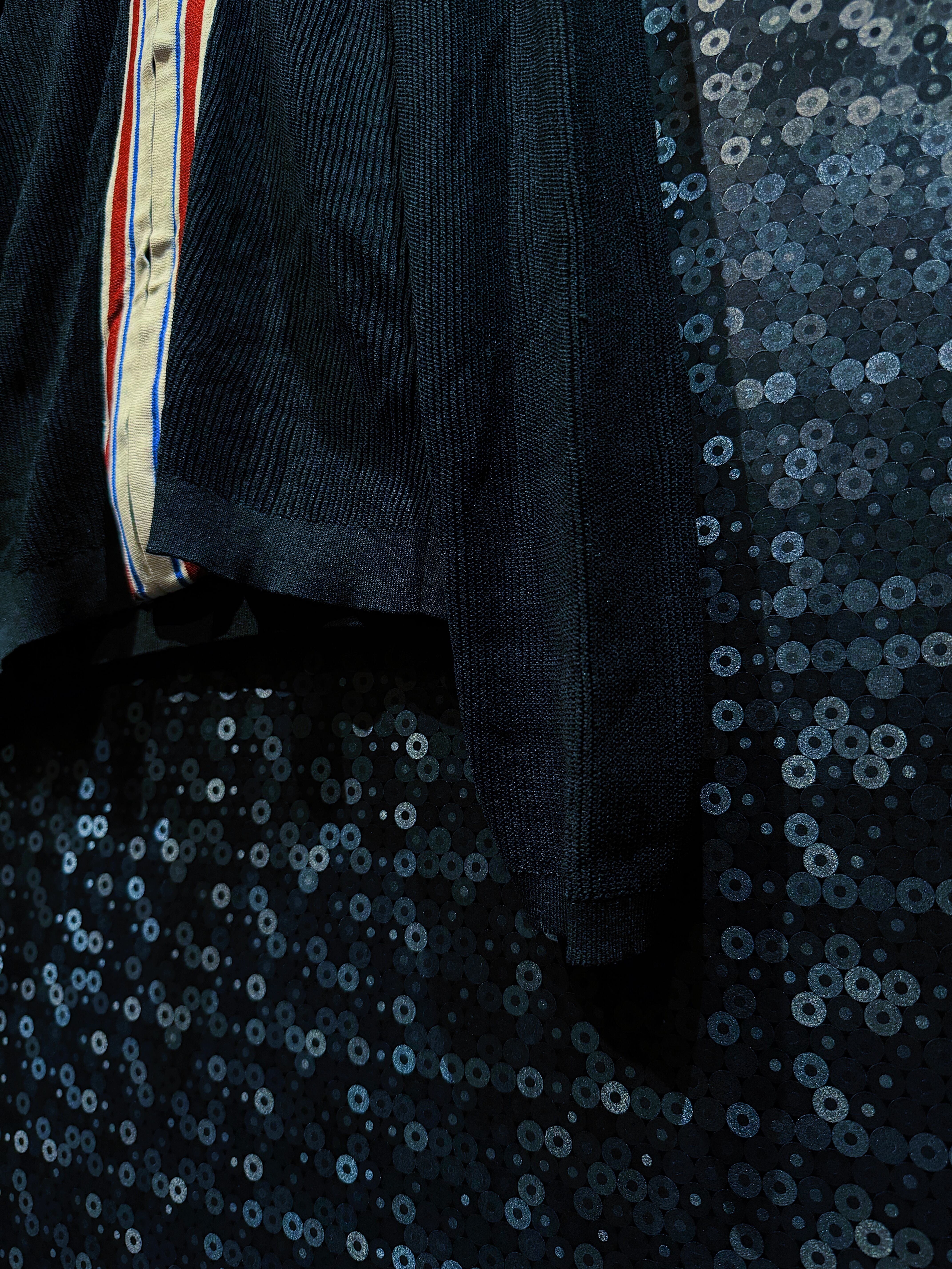 「PLAYBOY by PACSUN」のジップアップカーディガンです。全体はリブ状の編み込みが施されたブラックニットで構成されており、ボディの中央には目を惹くレトロ調のトリコロールストライプが縦に走っています。このラインが全体の印象をクラシカルかつスポーティにまとめあげており、プレッピーな雰囲気も漂わせています。