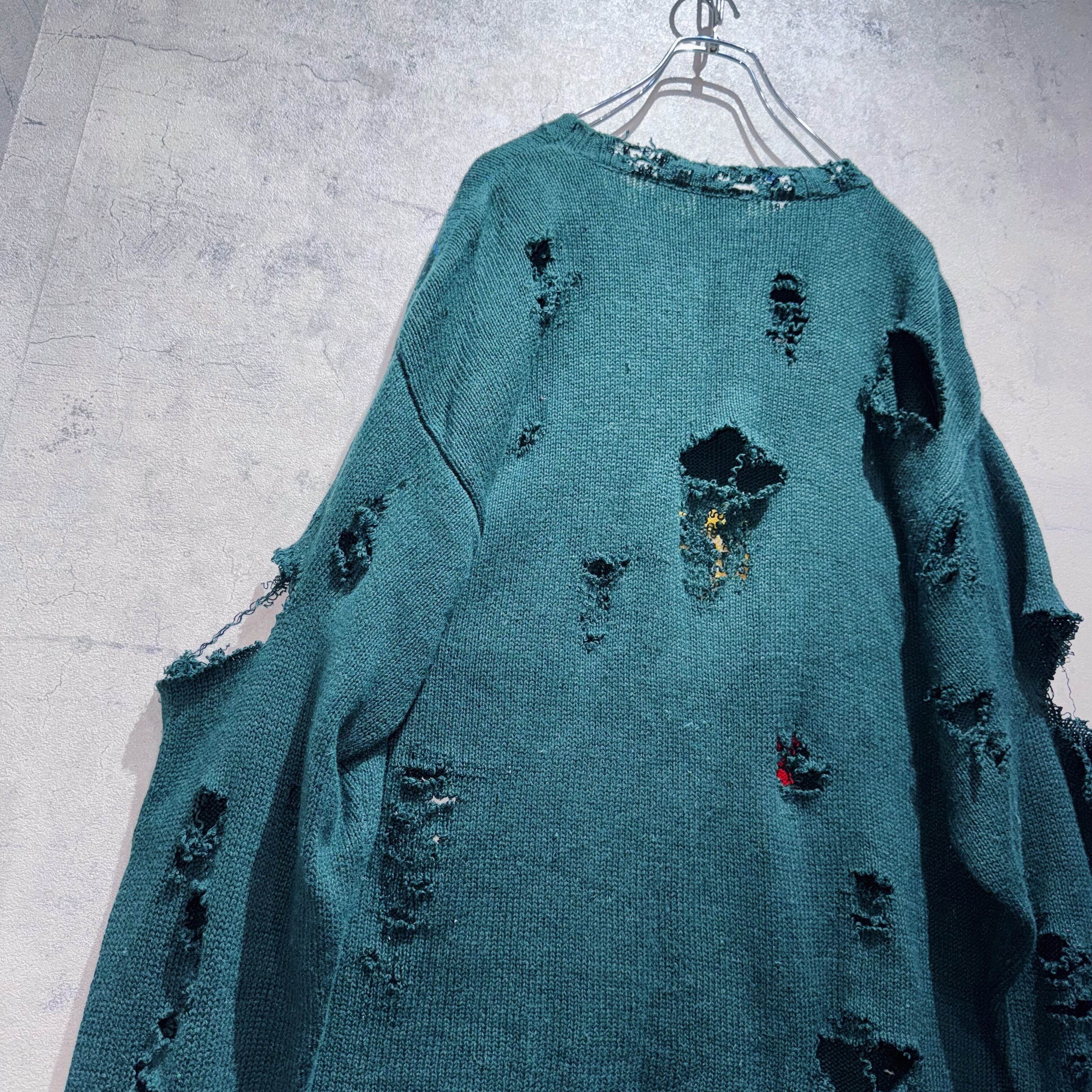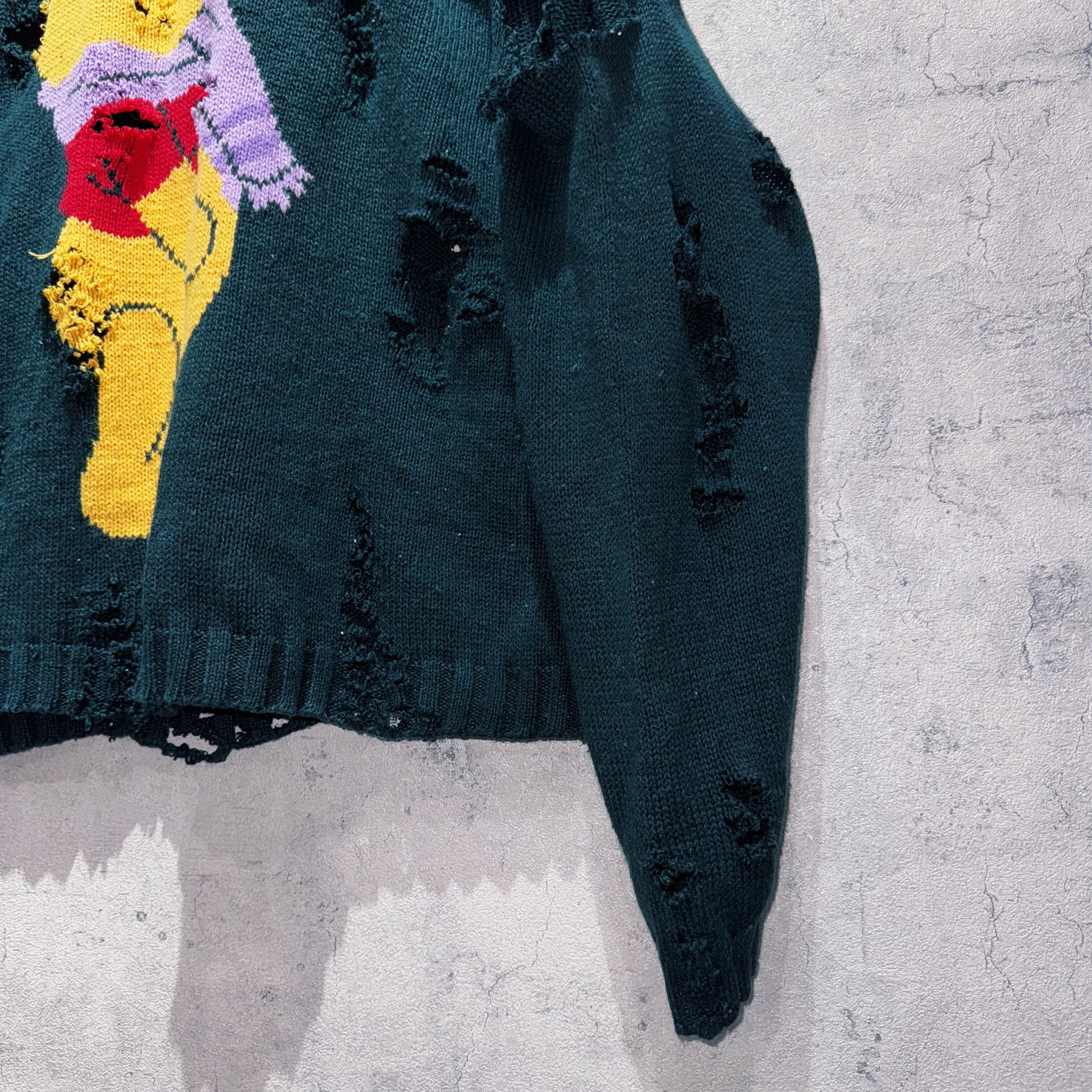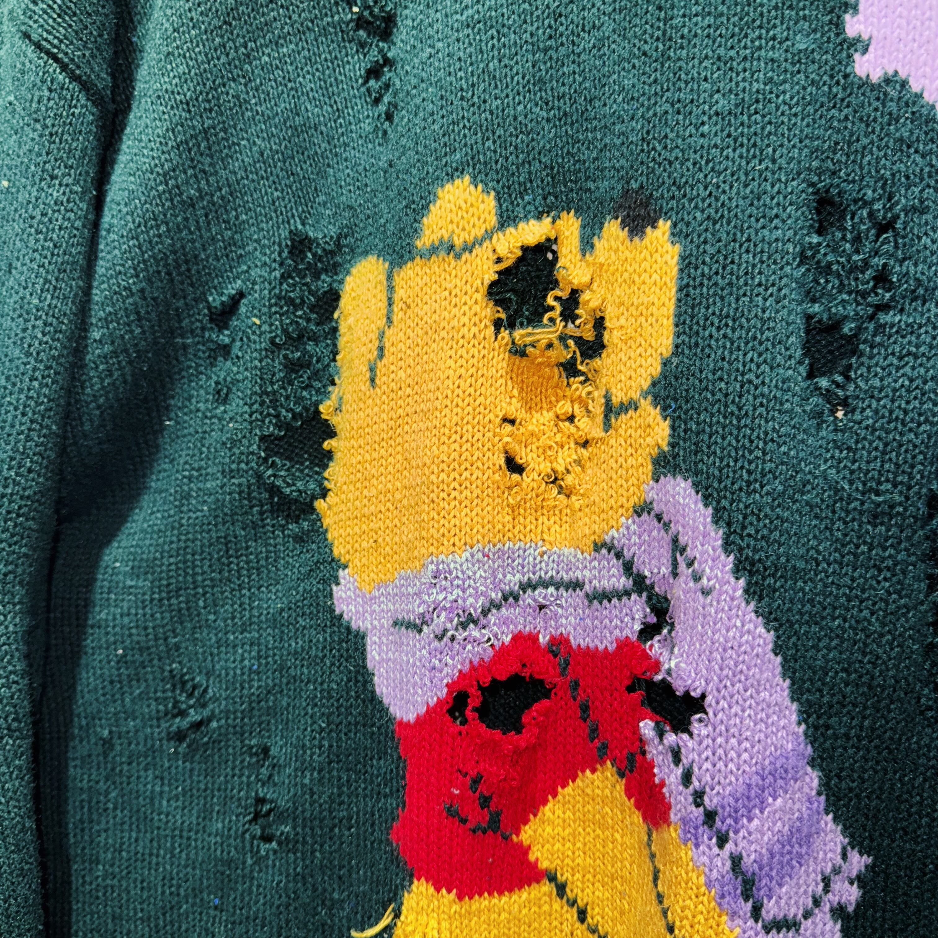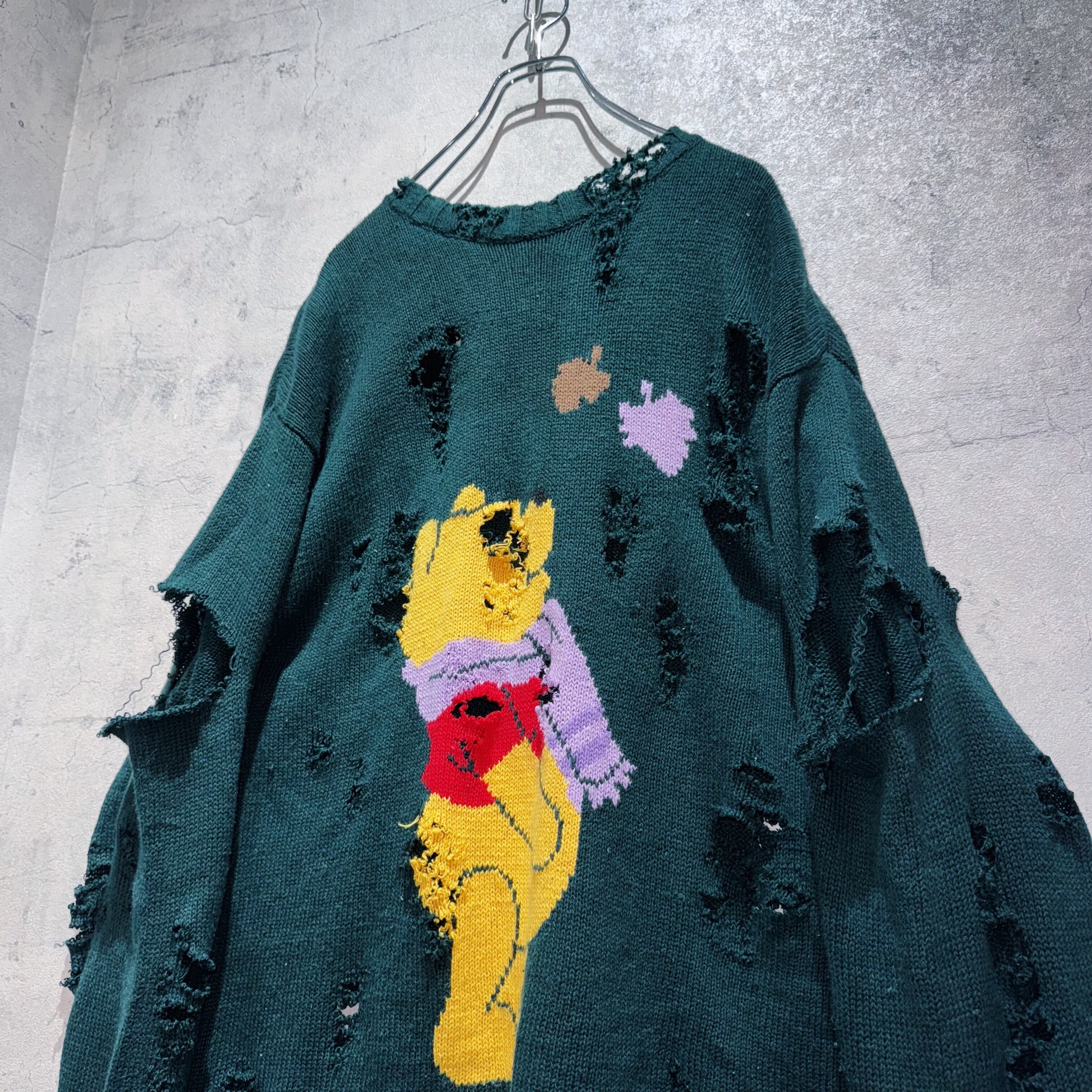 マフラーをしているプーさんのニットを大胆にボロアレンジ。敢えて目などにダメージを加えることでサイコ感がありユーモアラスな仕上がりに。