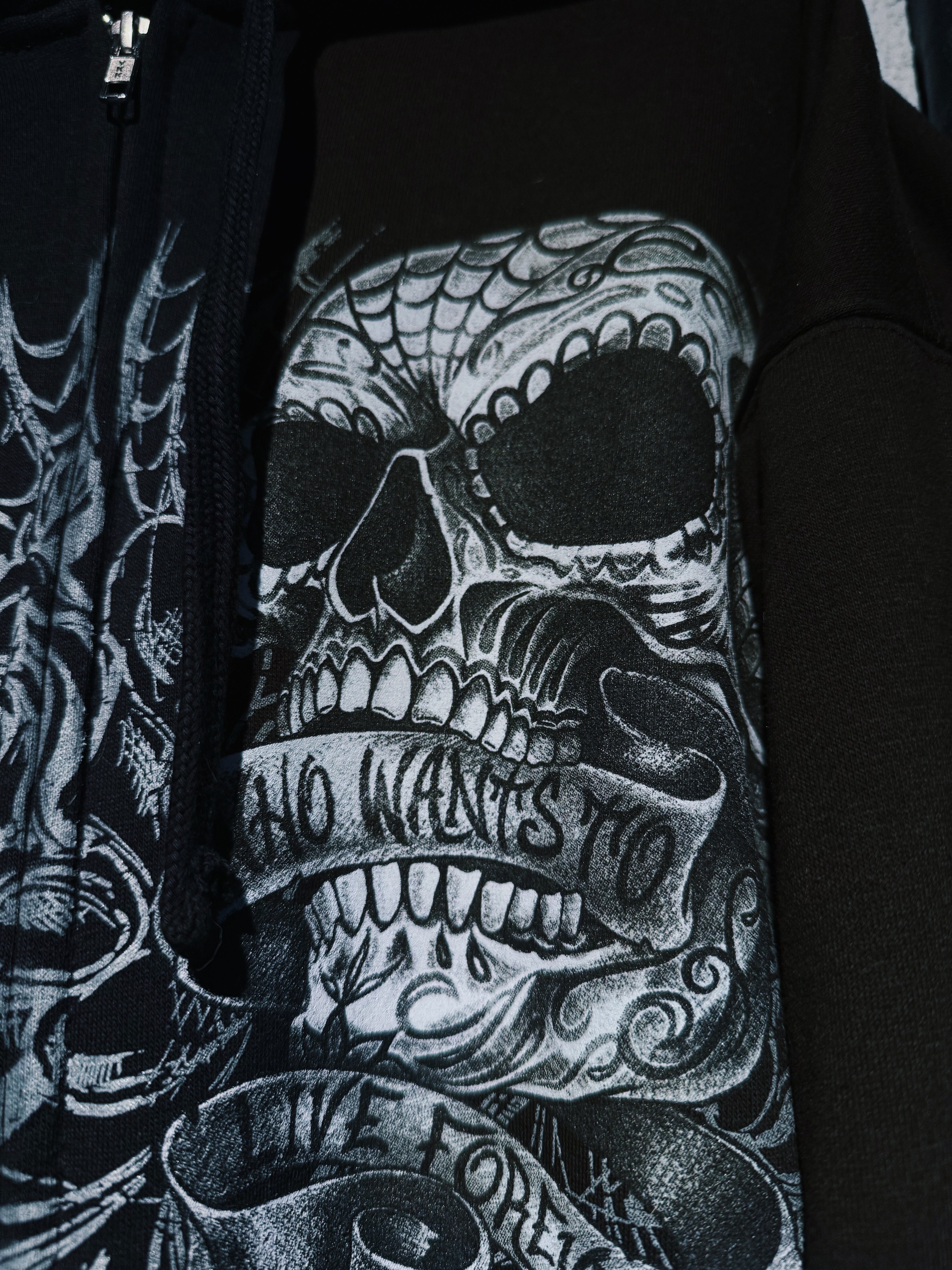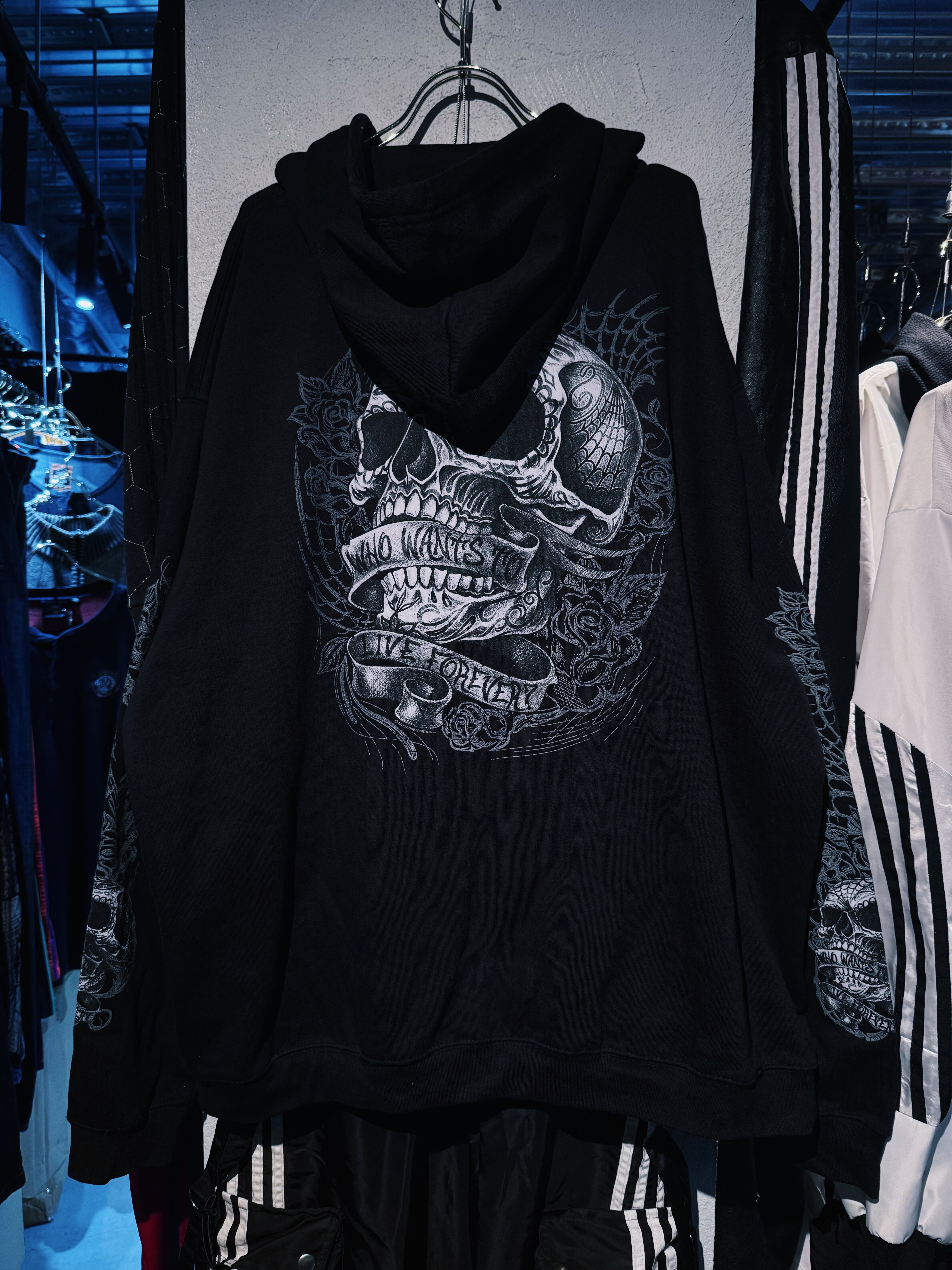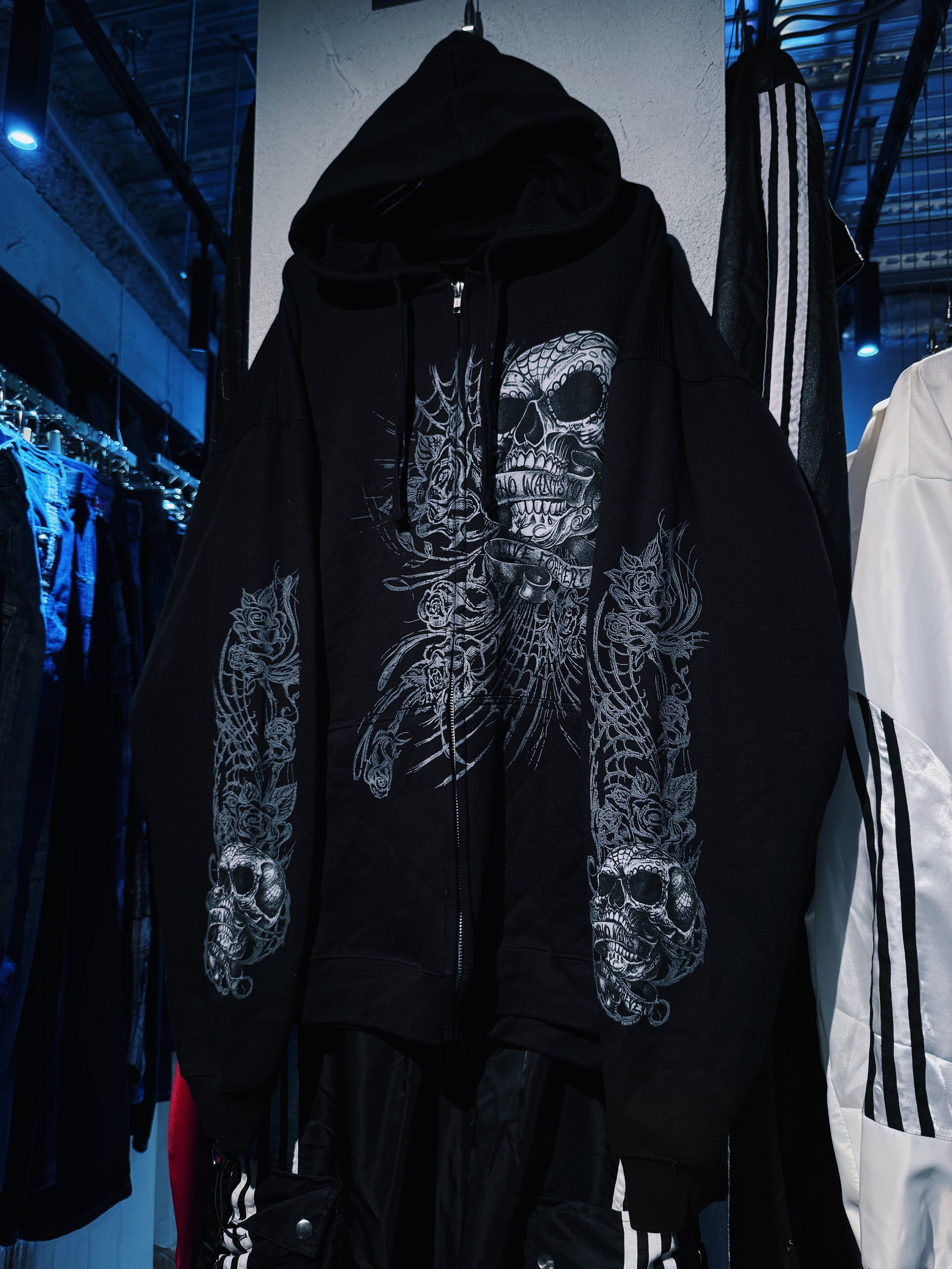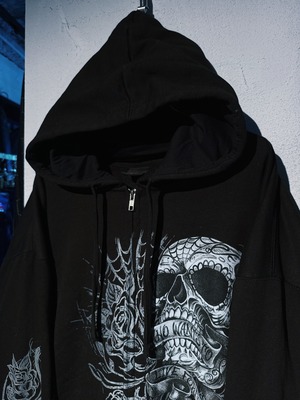 【D4C】vintage full pattern skull & rose tatoo print design zip up hoodie