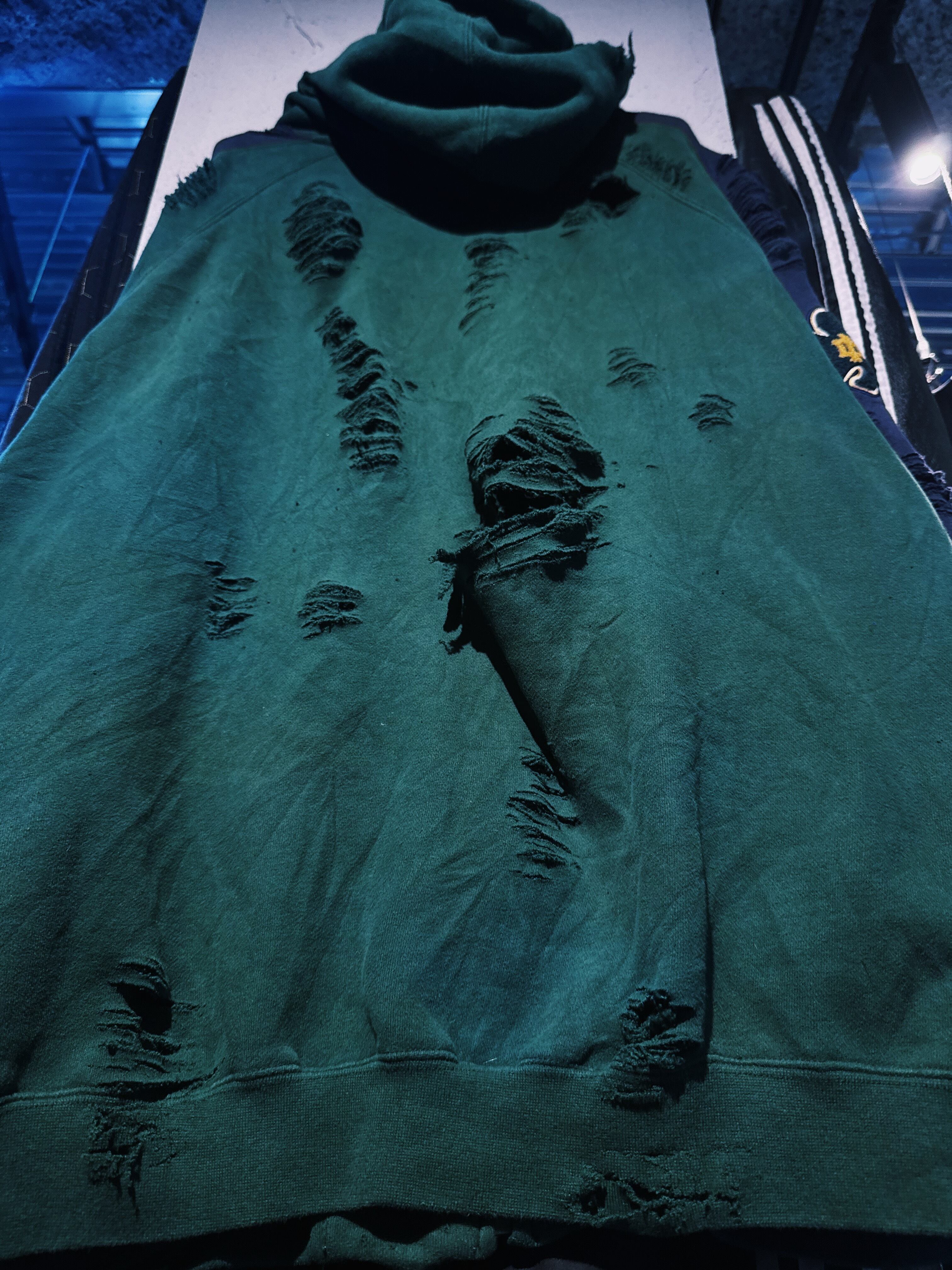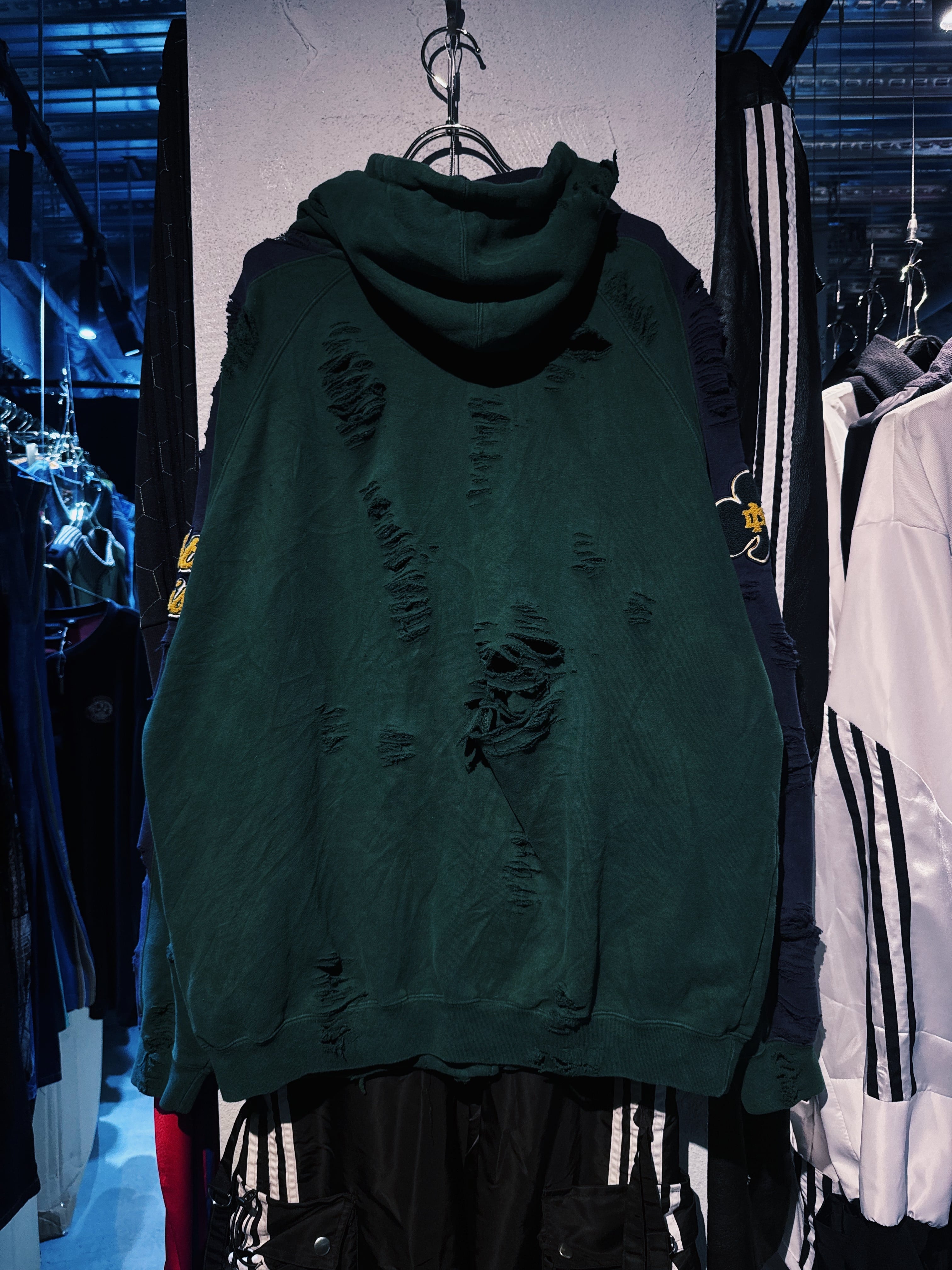 “ノートルダム”のデザインがパッチワークされたパーカーを大胆にボロカスタムし、唯一無二の存在へと変貌を遂げたリメイクアイテム。