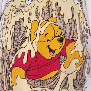 プーさんがハチミツの木にハマってしまい、ピグレットがプーさんのオケツに座りながら「やれやれだぜ」って感じをしている、デザインTシャツ。