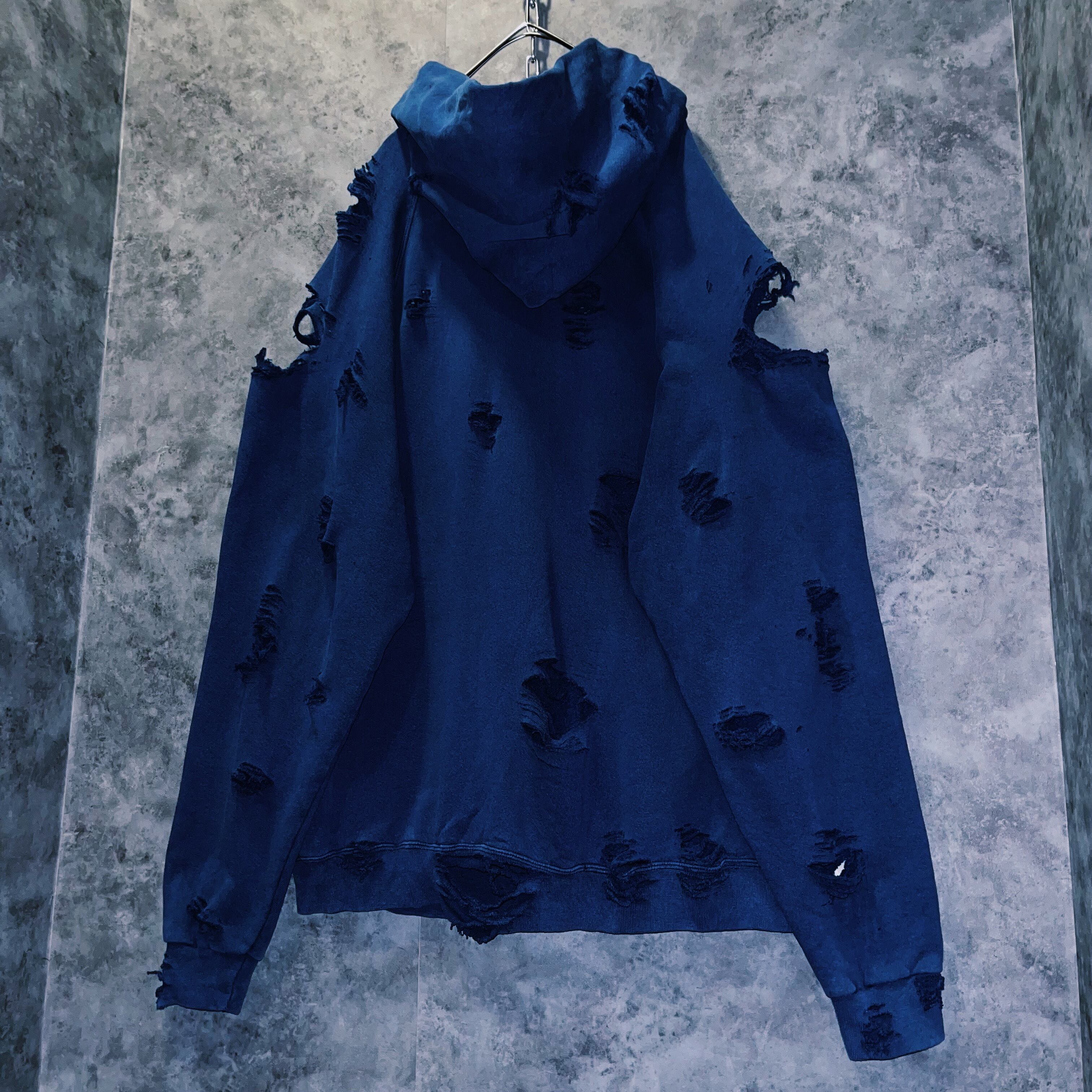 ボディ、アーム、バック、もちろんフロントにもダメージ加工が施されておりどの角度から見ても死角無しの主役級の一品。インナーに襟付きのシャツやネクタイを忍ばせれば絶妙に首周りのデザインで遊べる万能性。