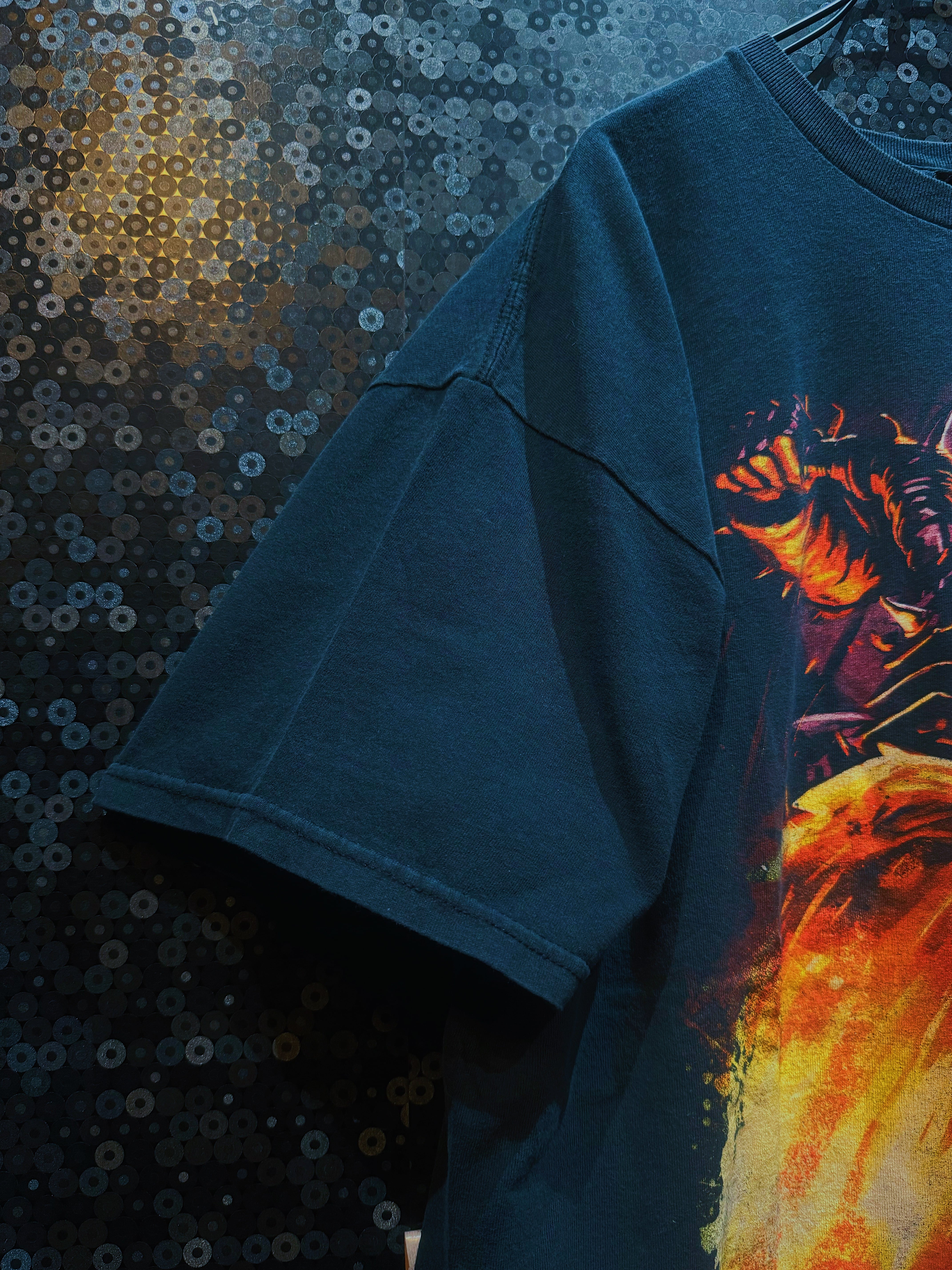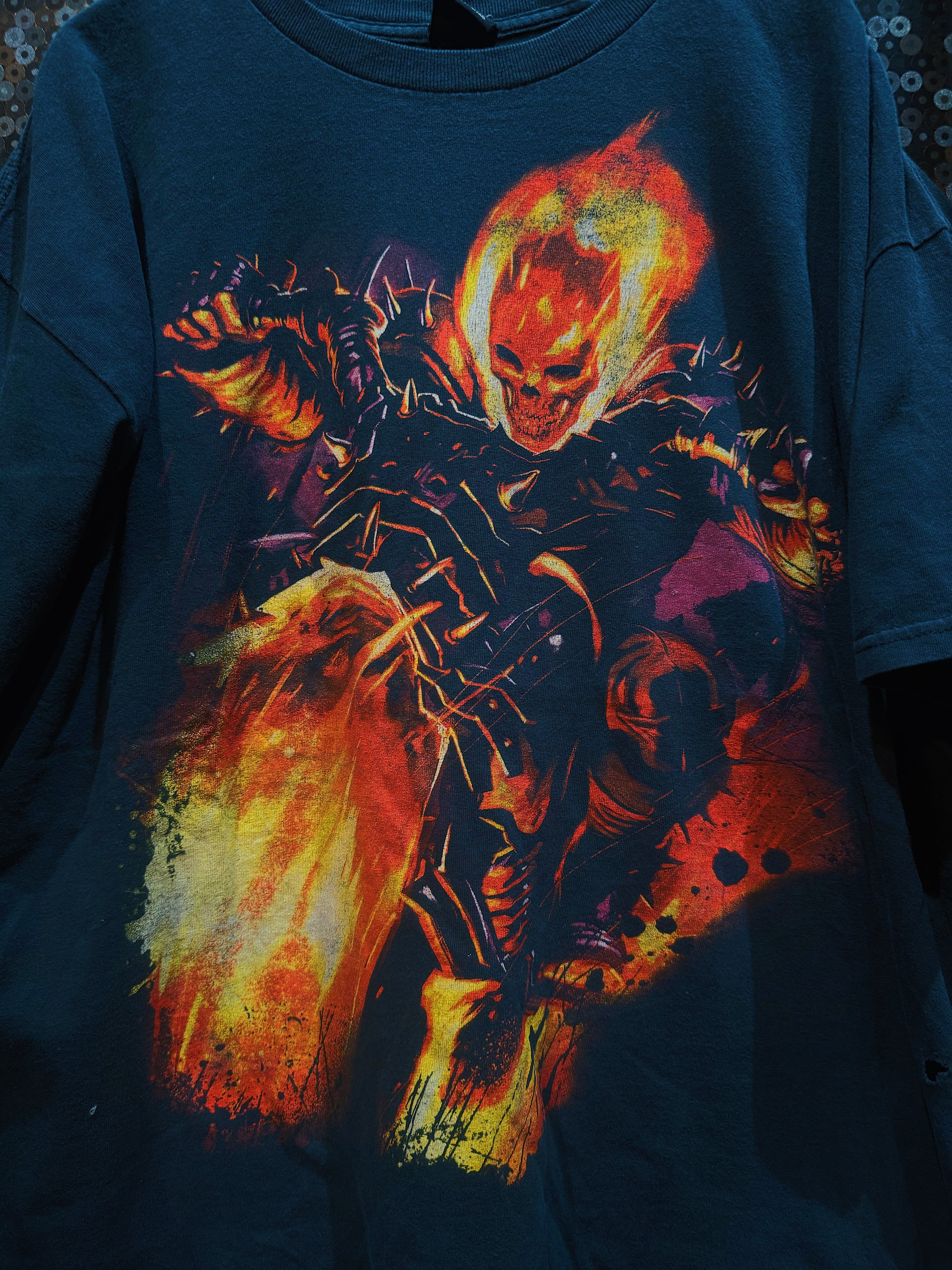 炎に包まれた骸骨の顔、トゲのついたレザージャケット、そして燃えさかるチェーンを携えた姿が、彼の呪われた正義の在り方を象徴しています。タグは信頼の「MAD ENGINE」製で、MARVEL公式ライセンス入りの貴重なヴィンテージ。アメリカンコミックの中でも異彩を放つキャラクター、ジョニー・ブレイズやダニー・ケッチといった歴代ゴーストライダーの魂を感じさせるこの一枚は、ただのTシャツに収まらない、まさに“地獄の美学”を纏うアートピースです。