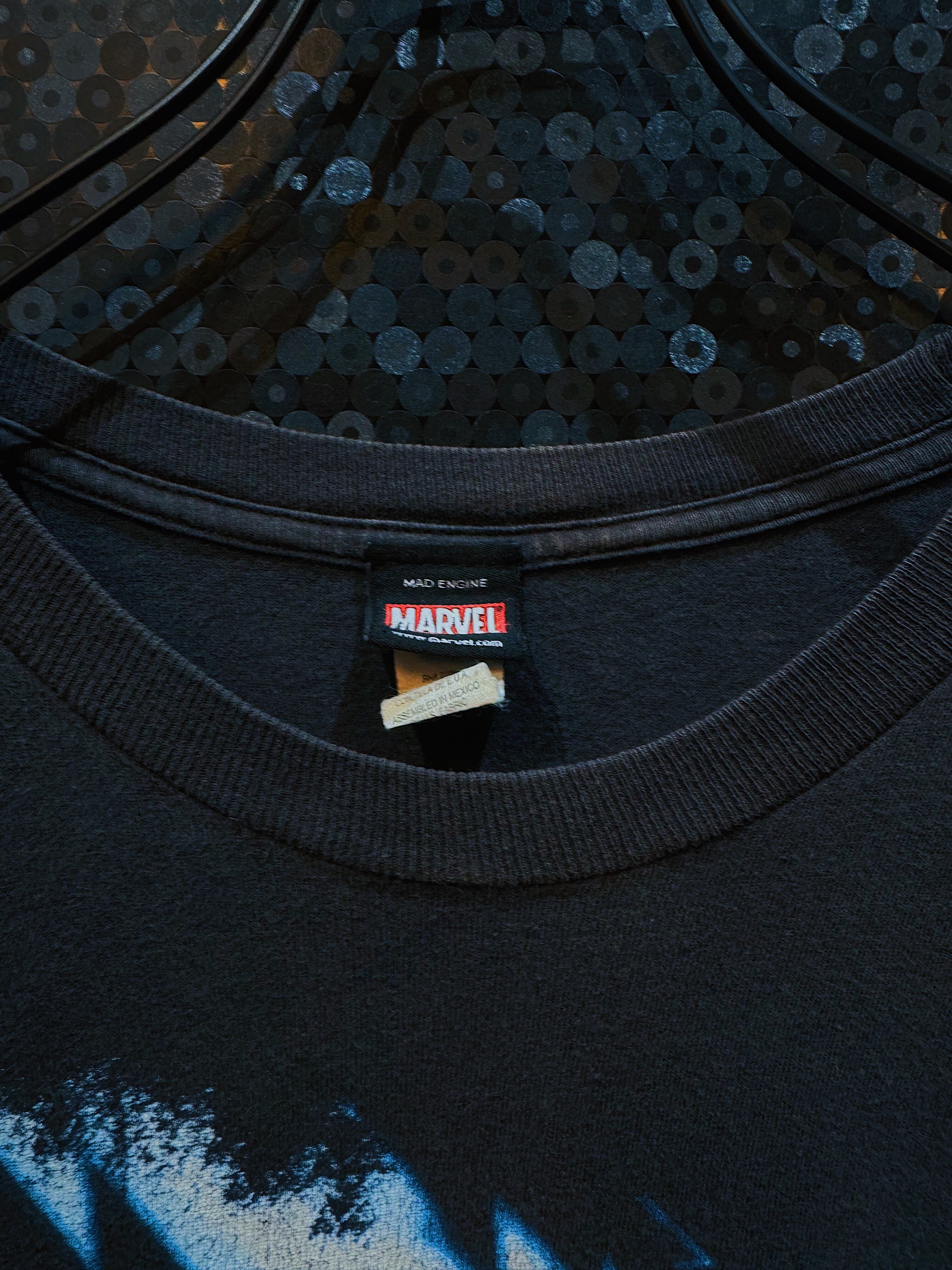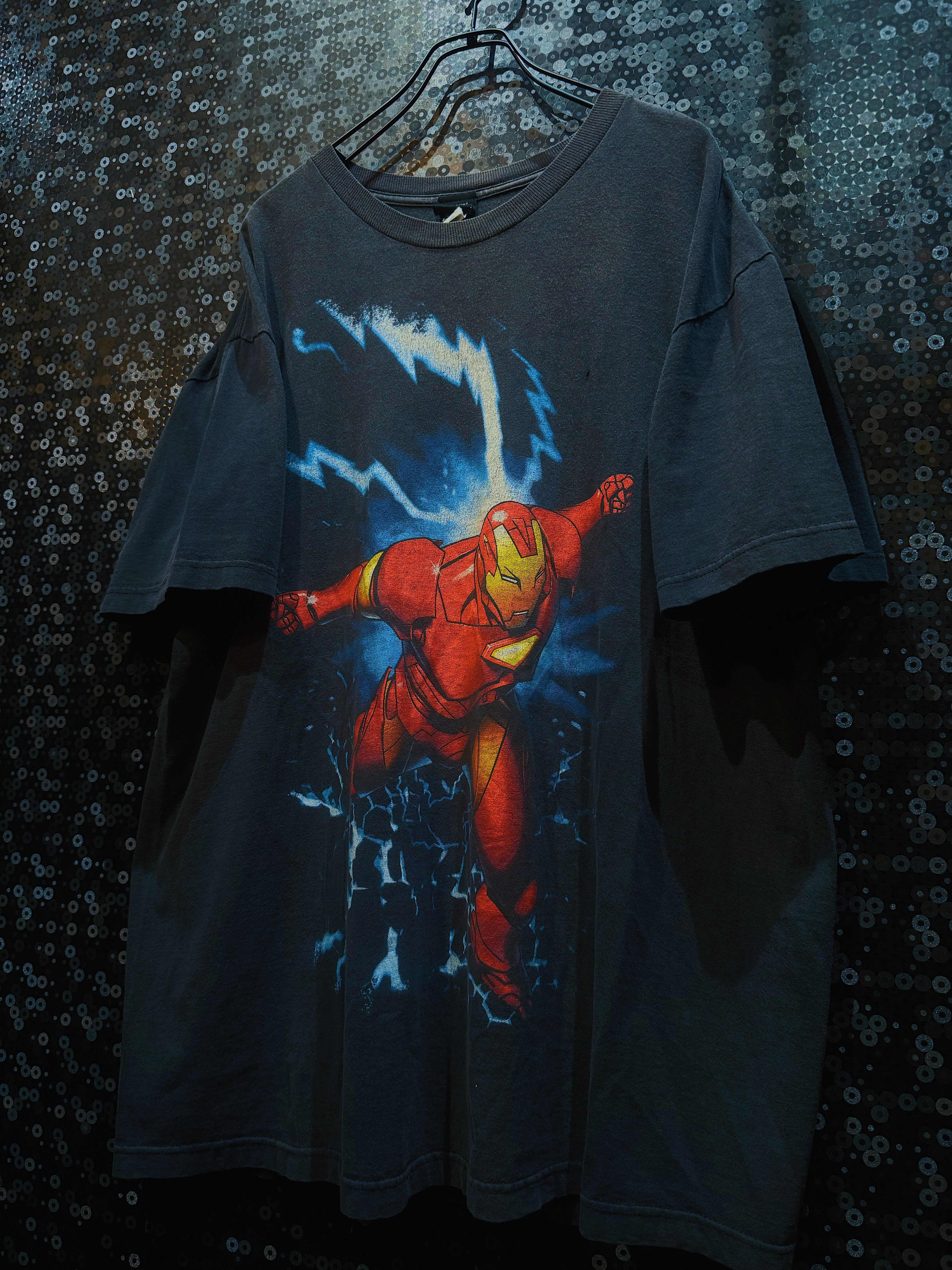 力強く前傾姿勢で突き進むアイアンマンが全面に描かれた、ヴィンテージならではの圧巻グラフィックTシャツ。