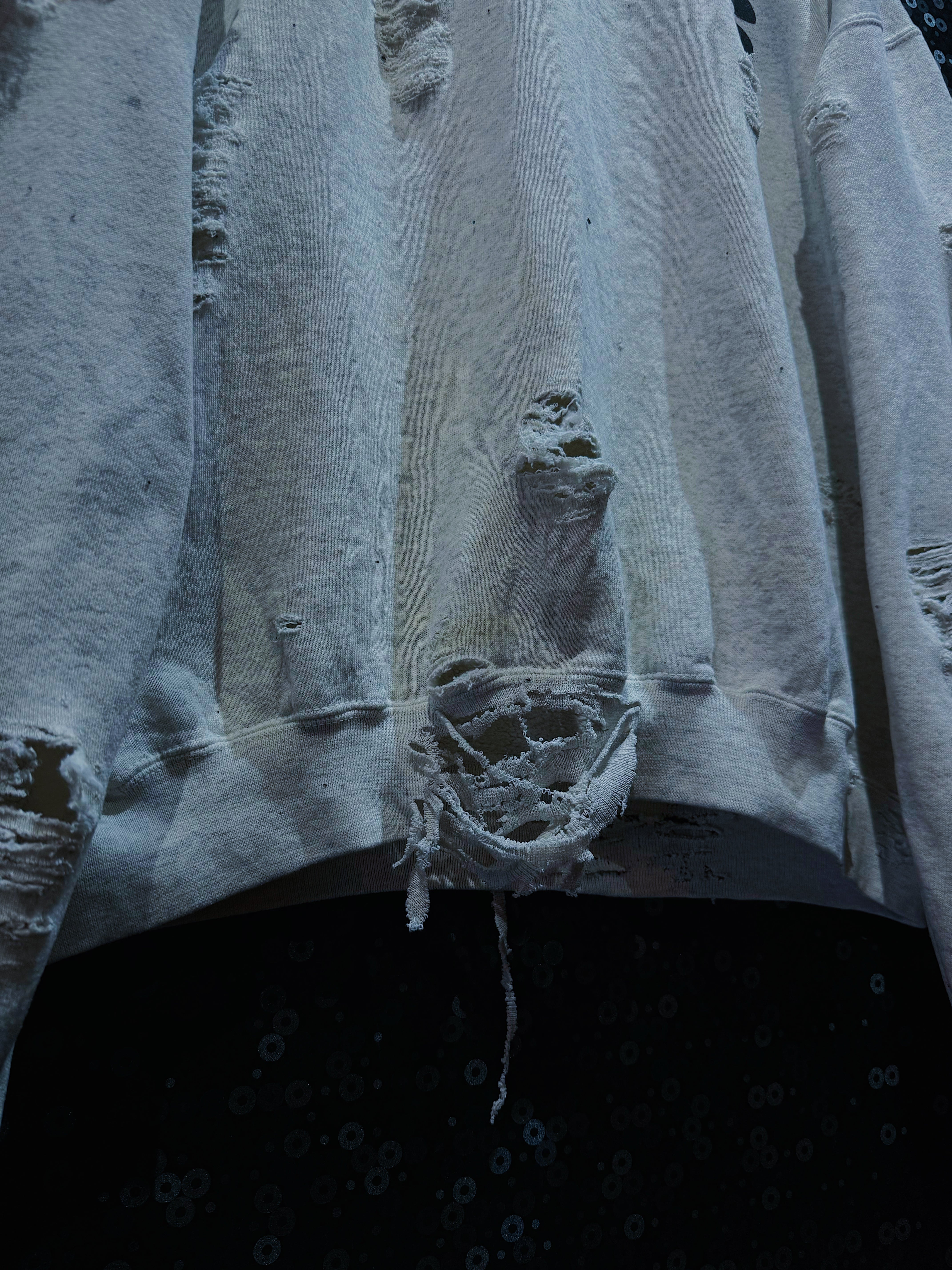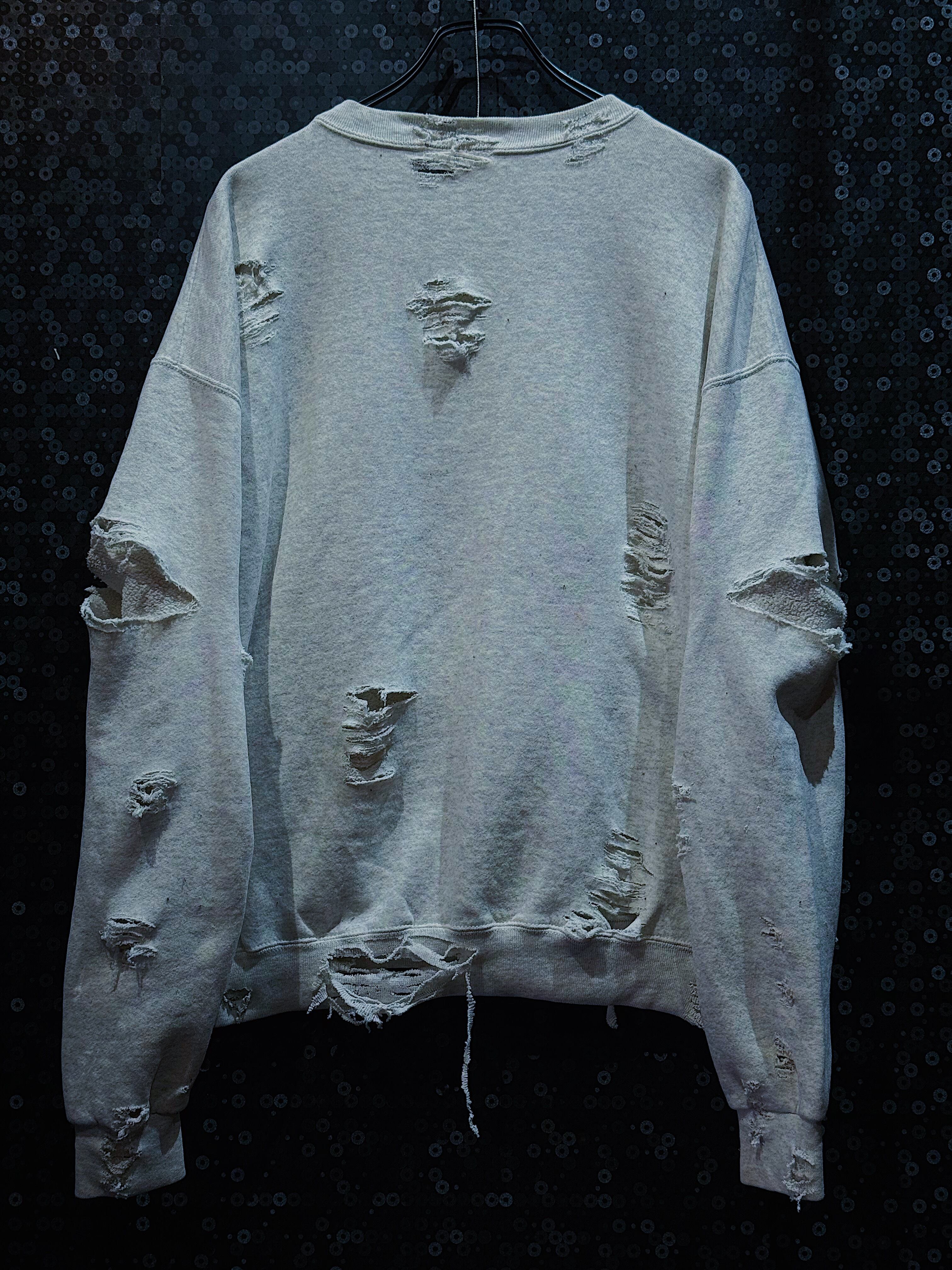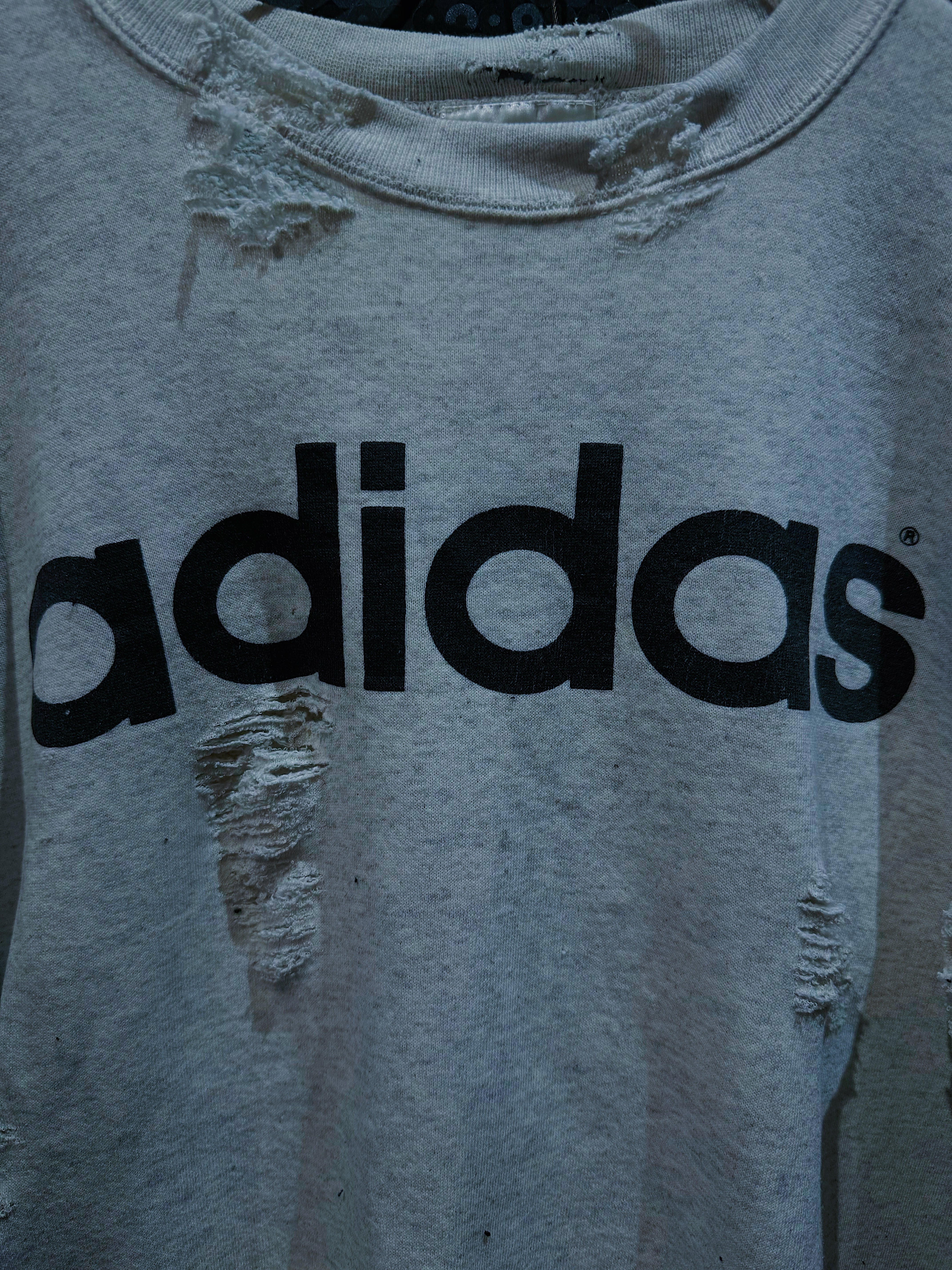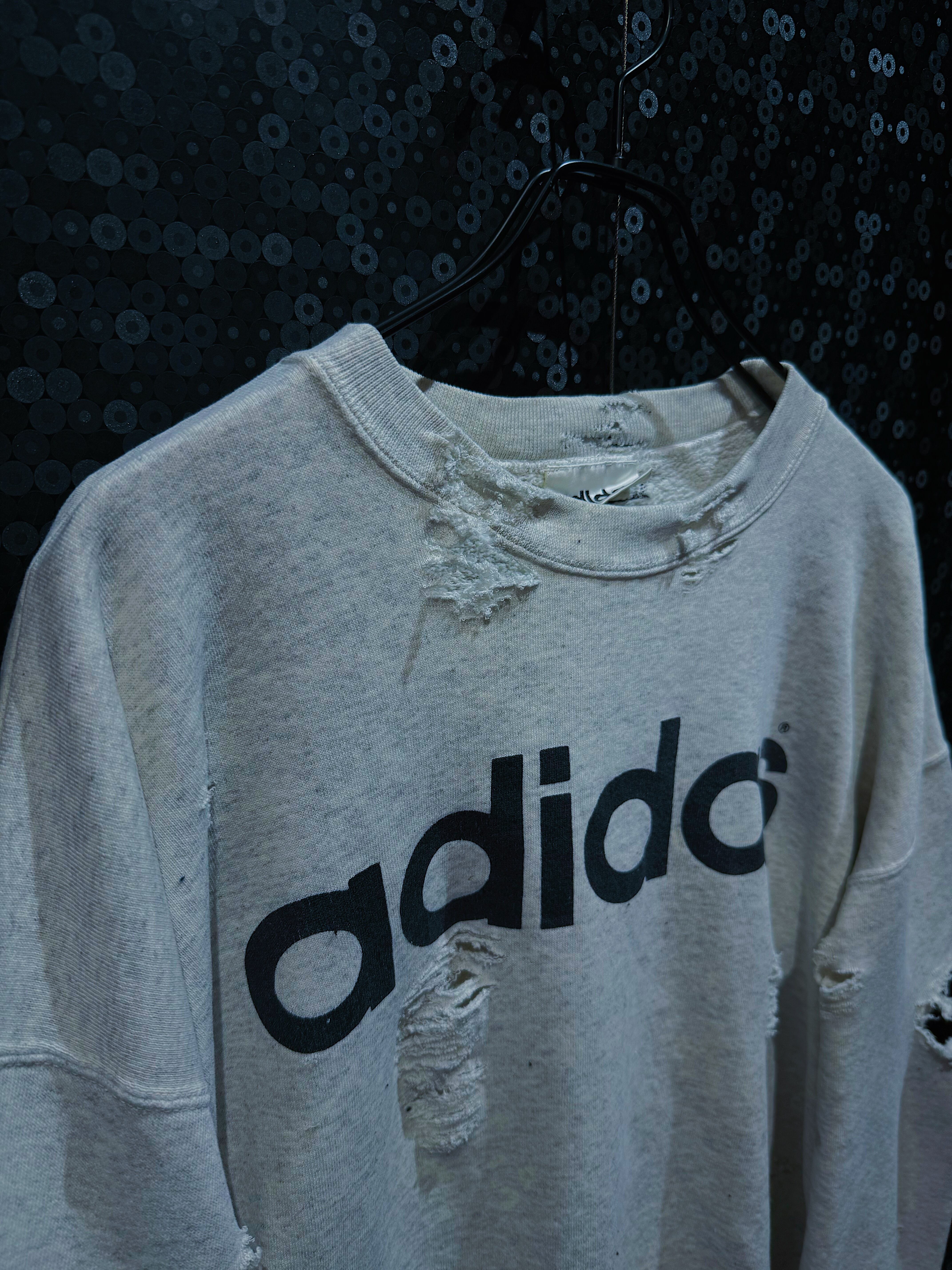 adidasのブランドロゴをセンターに大胆に刺繍したブラックスウェットを、全身に渡るボロ加工で再解釈した一着。