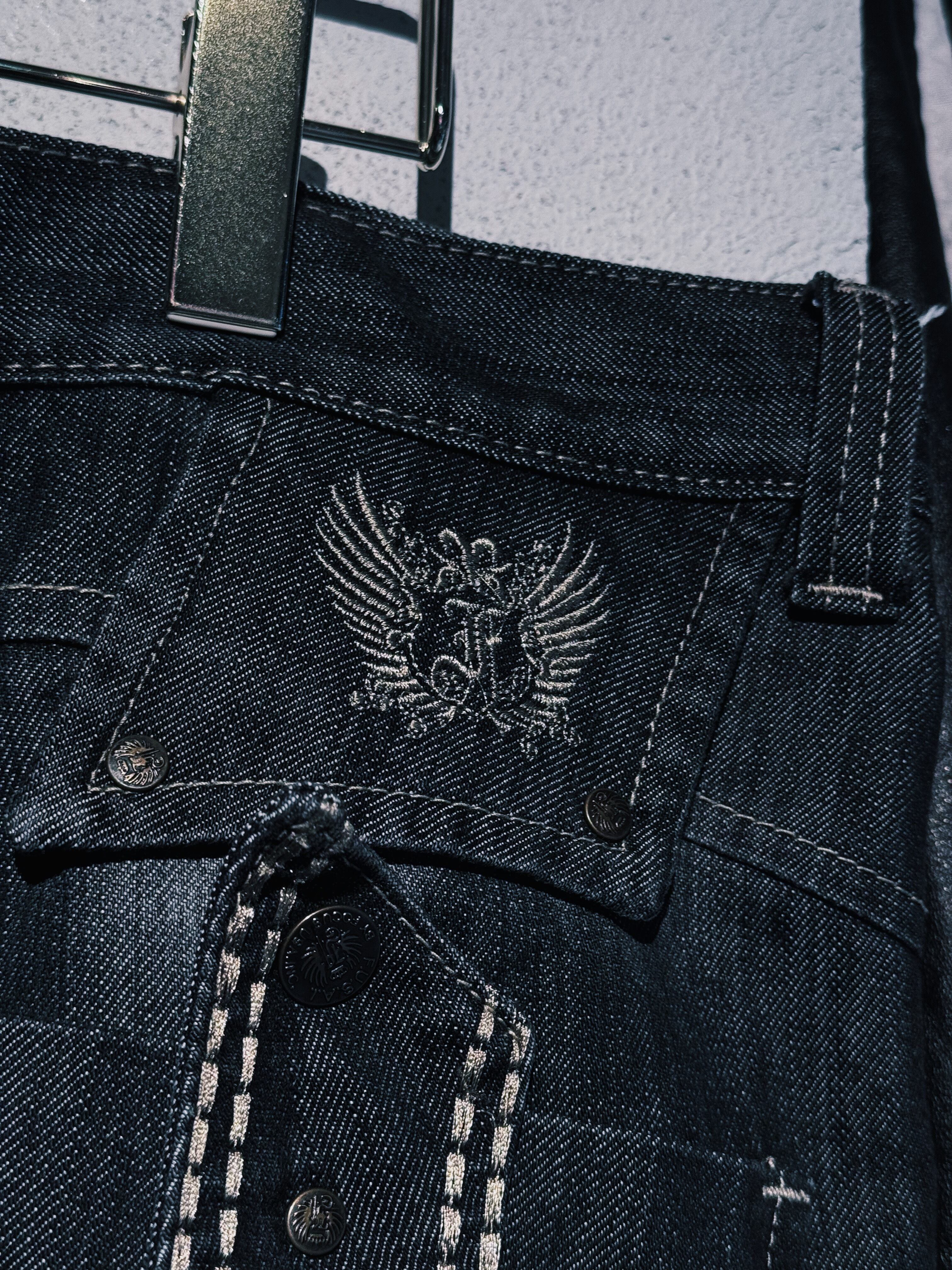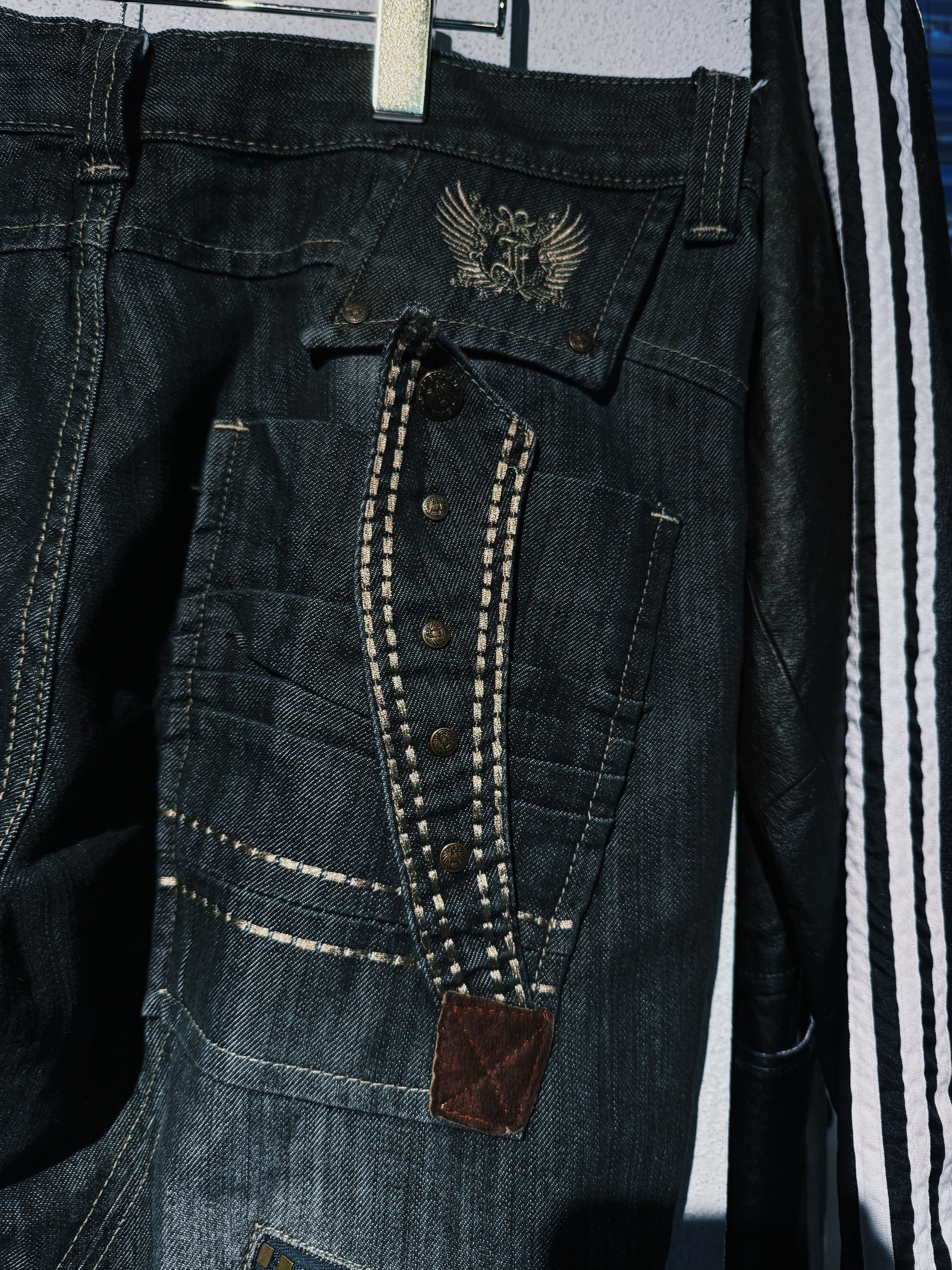 ヴィンテージレザーパッチ&ZIPデザインホワイトステッチストレートデニムパンツ