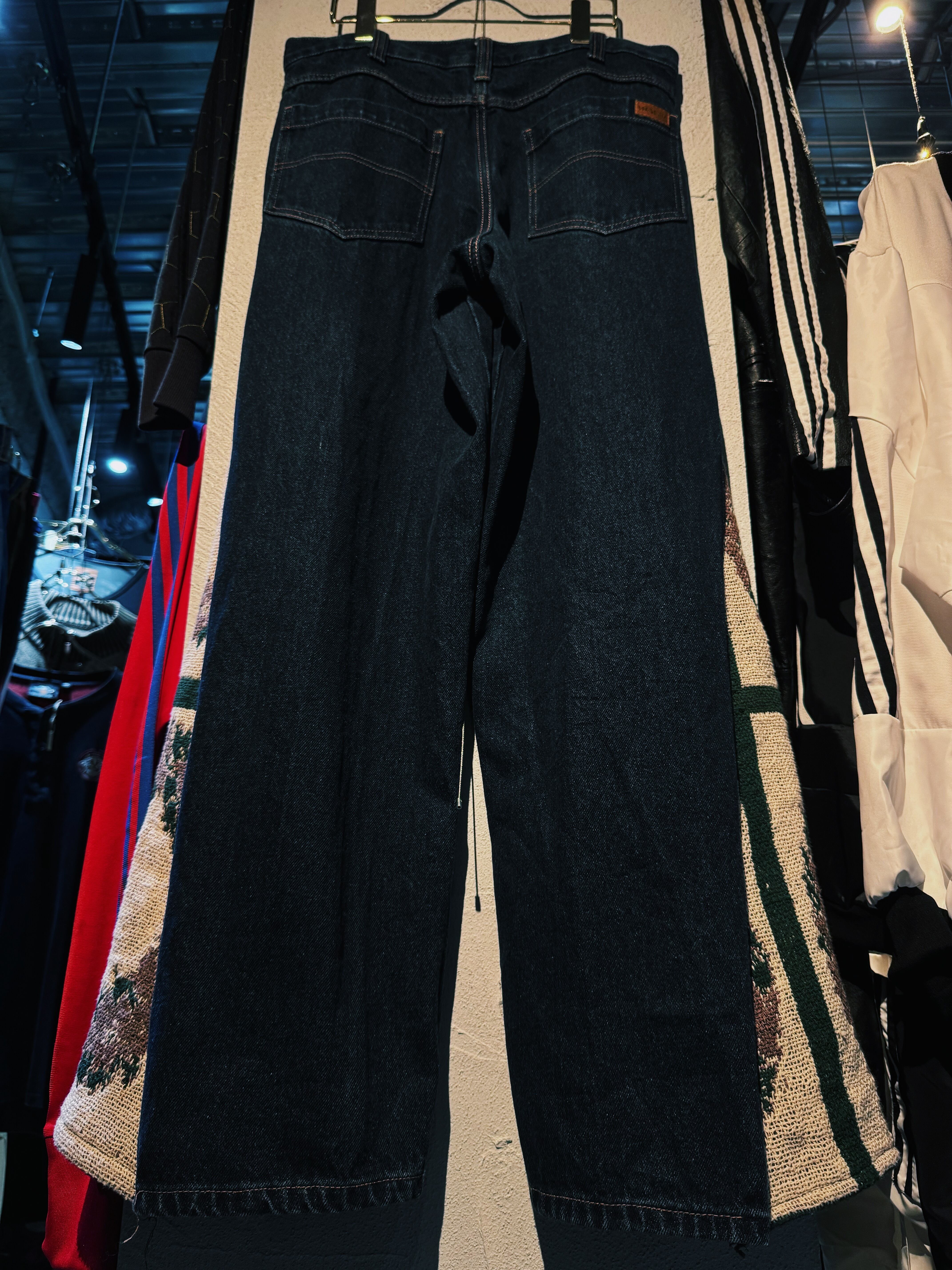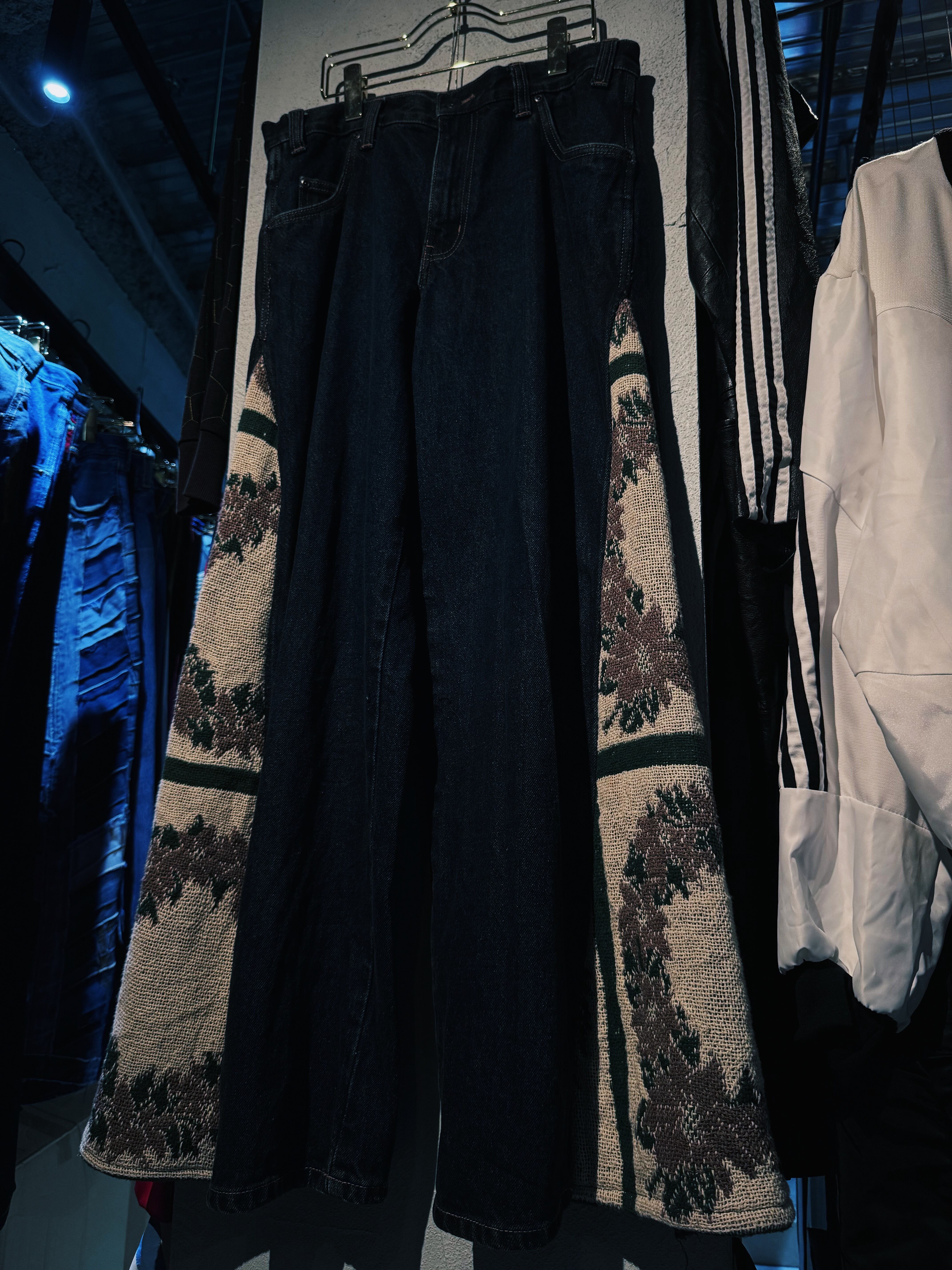 ローライズのデニムをベースに裾から新たにアンティークのユーロラグをパネル状に取り入れ極上のかつ美しいフレアシルエットに変えたフレアデニム。