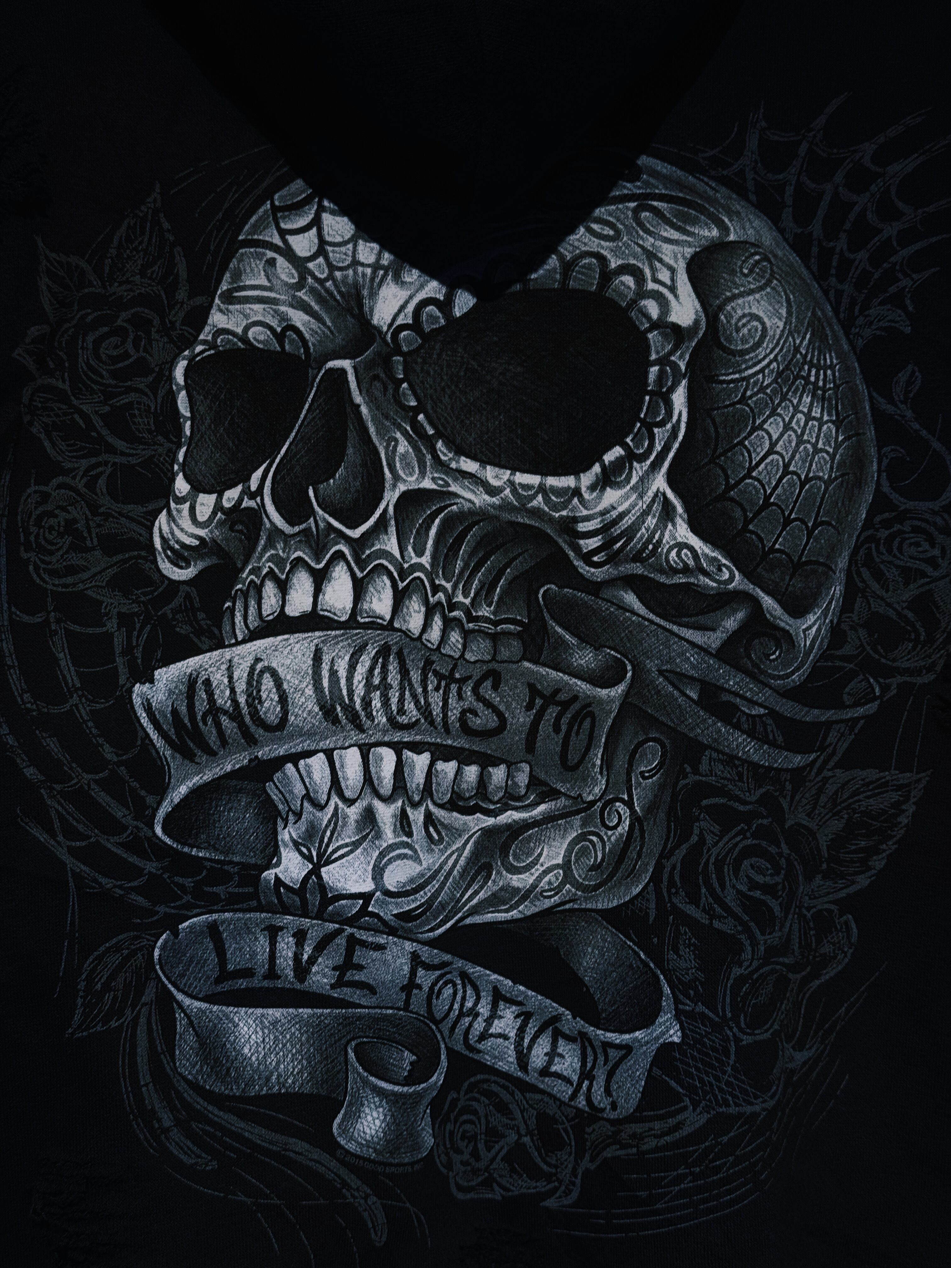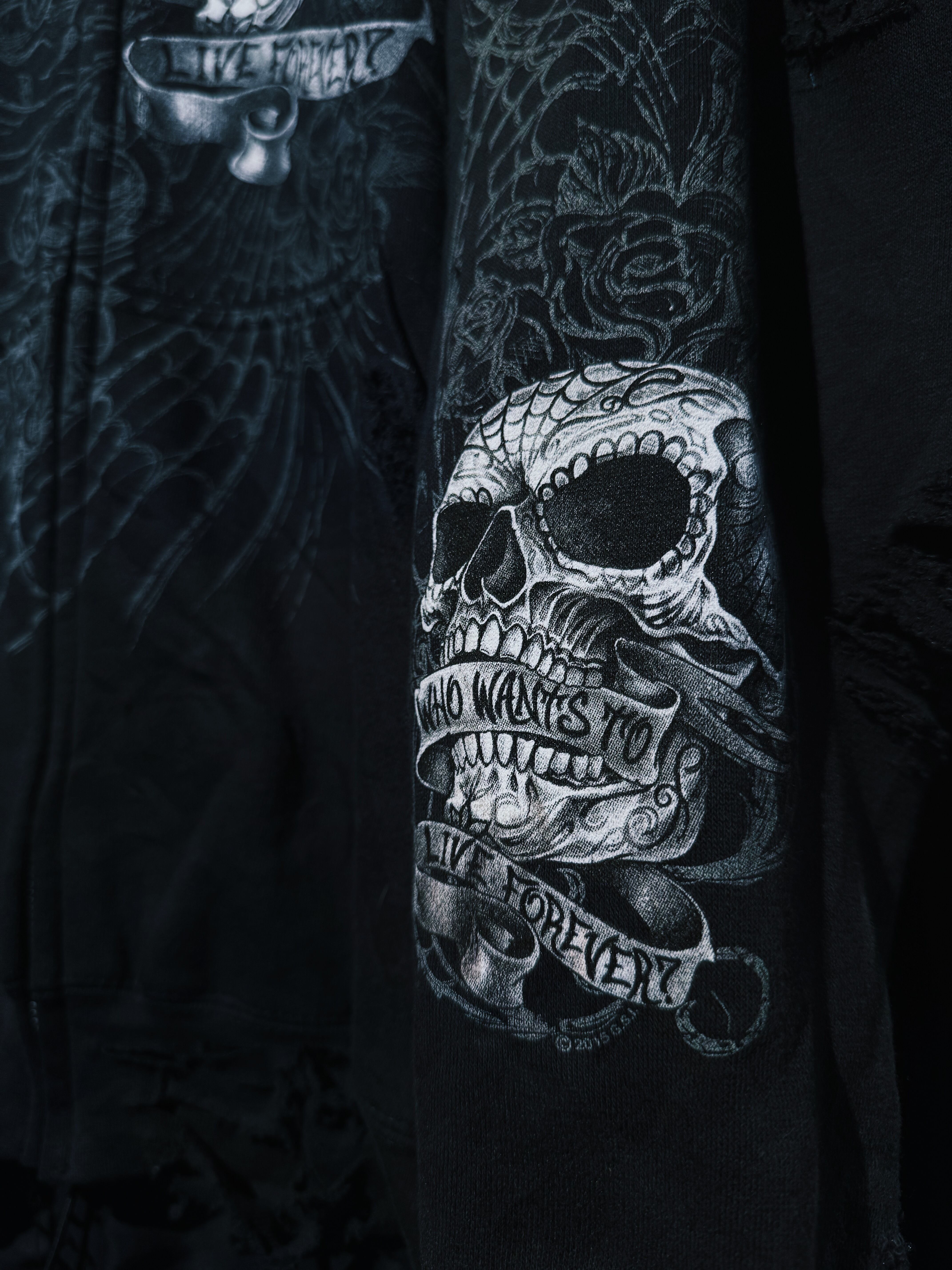 ヴィンテージフルパターンスカル&ローズタトゥープリントデザインジップアップボロカスタムフーディ