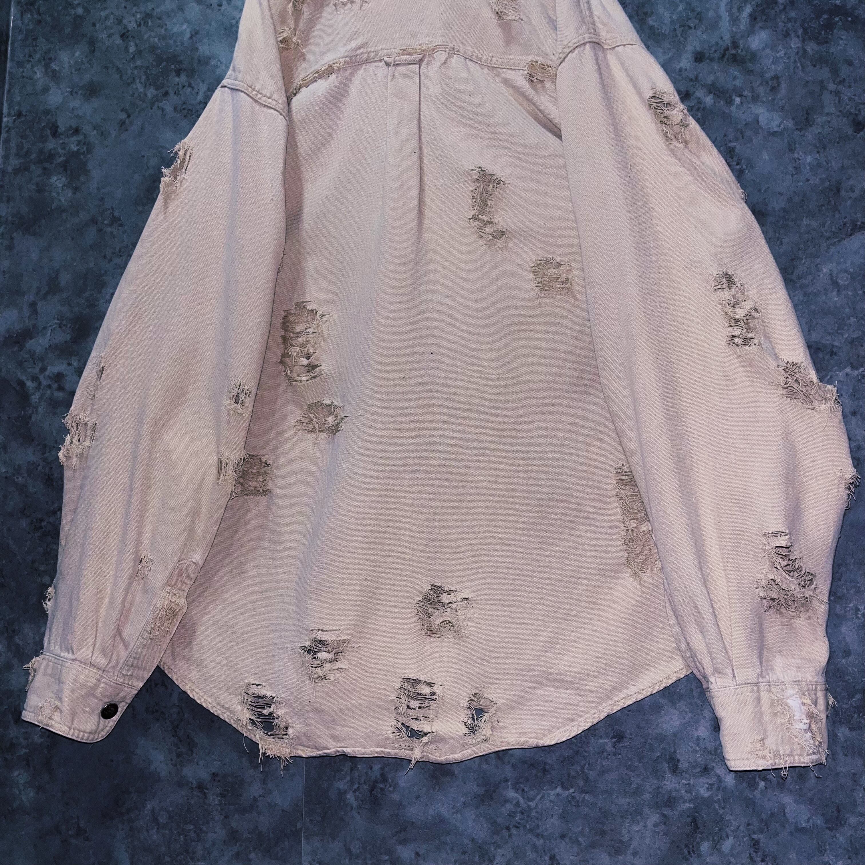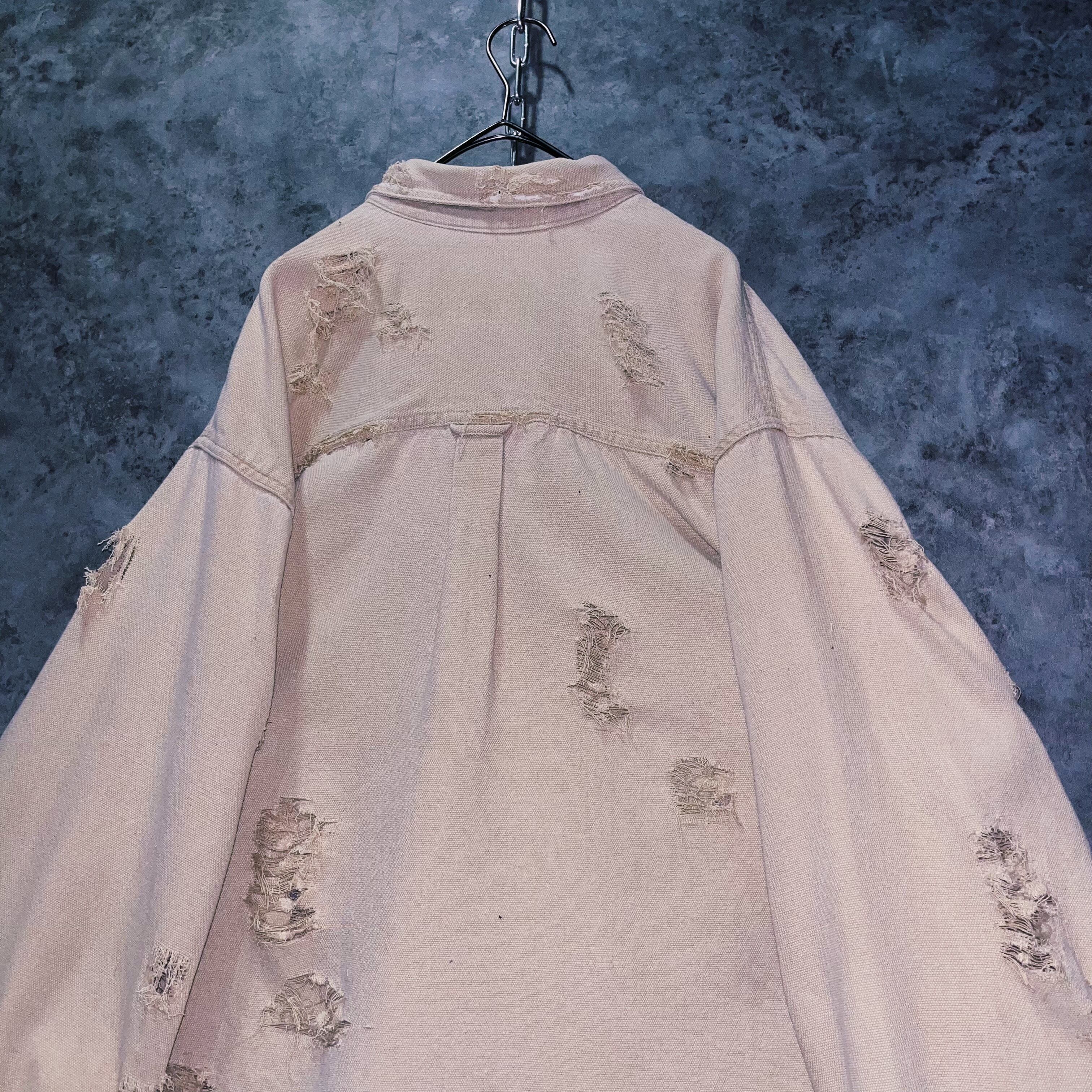 薄手ながらしっかりとした生地感はボロにしたことでより重厚感ある印象に。アイボリーカラーのシンプルなアイテムのため他のアイテムと馴染みがよく、どんなコーデにも合わせられる万能性を持ちます。