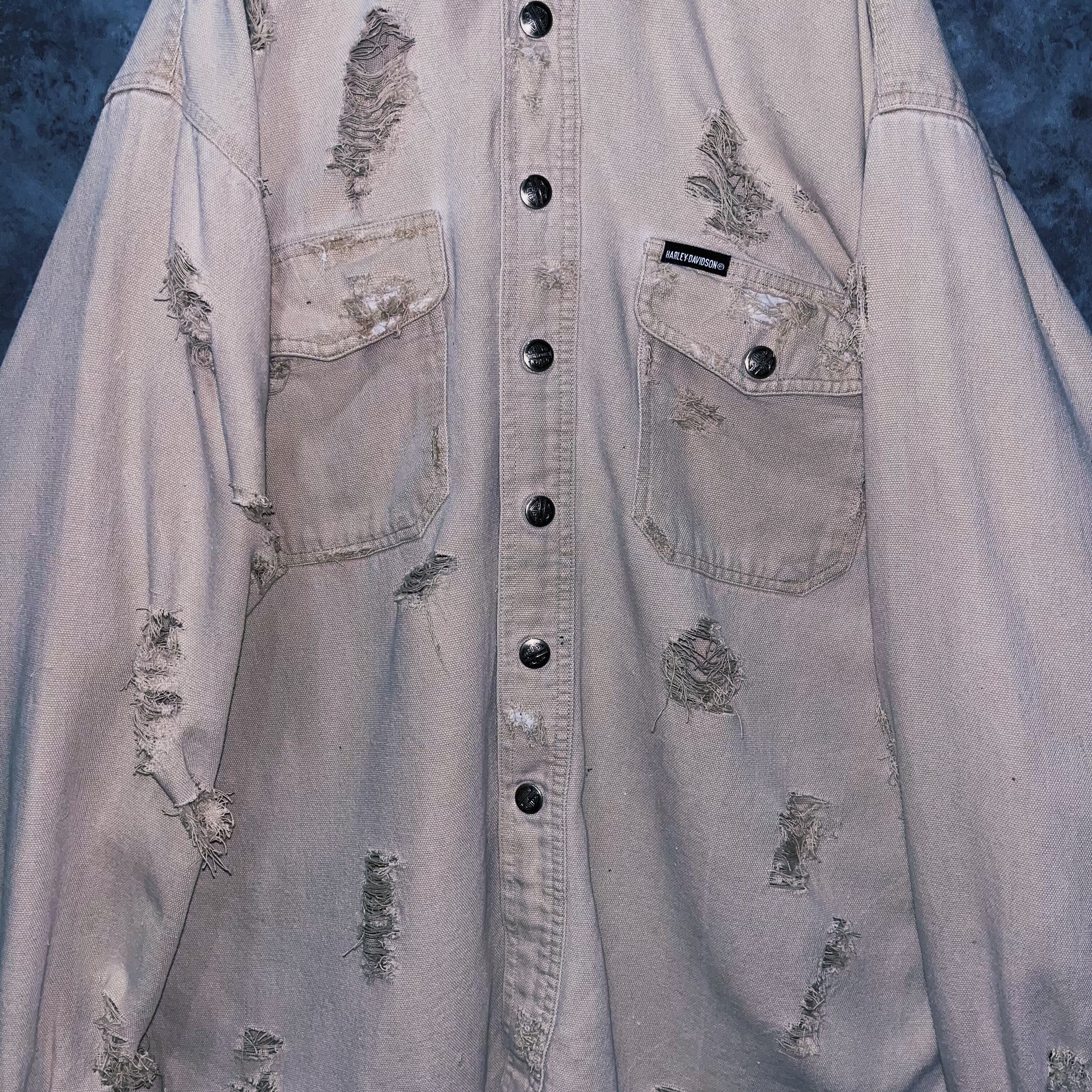 毎回大好評をいただきオンライン掲載前に旅立つことも多いボロカスタムシャツ。今回は“Harley-Davidson”のデニムシャツが我々自慢のボロ加工を施して登場いたしました。