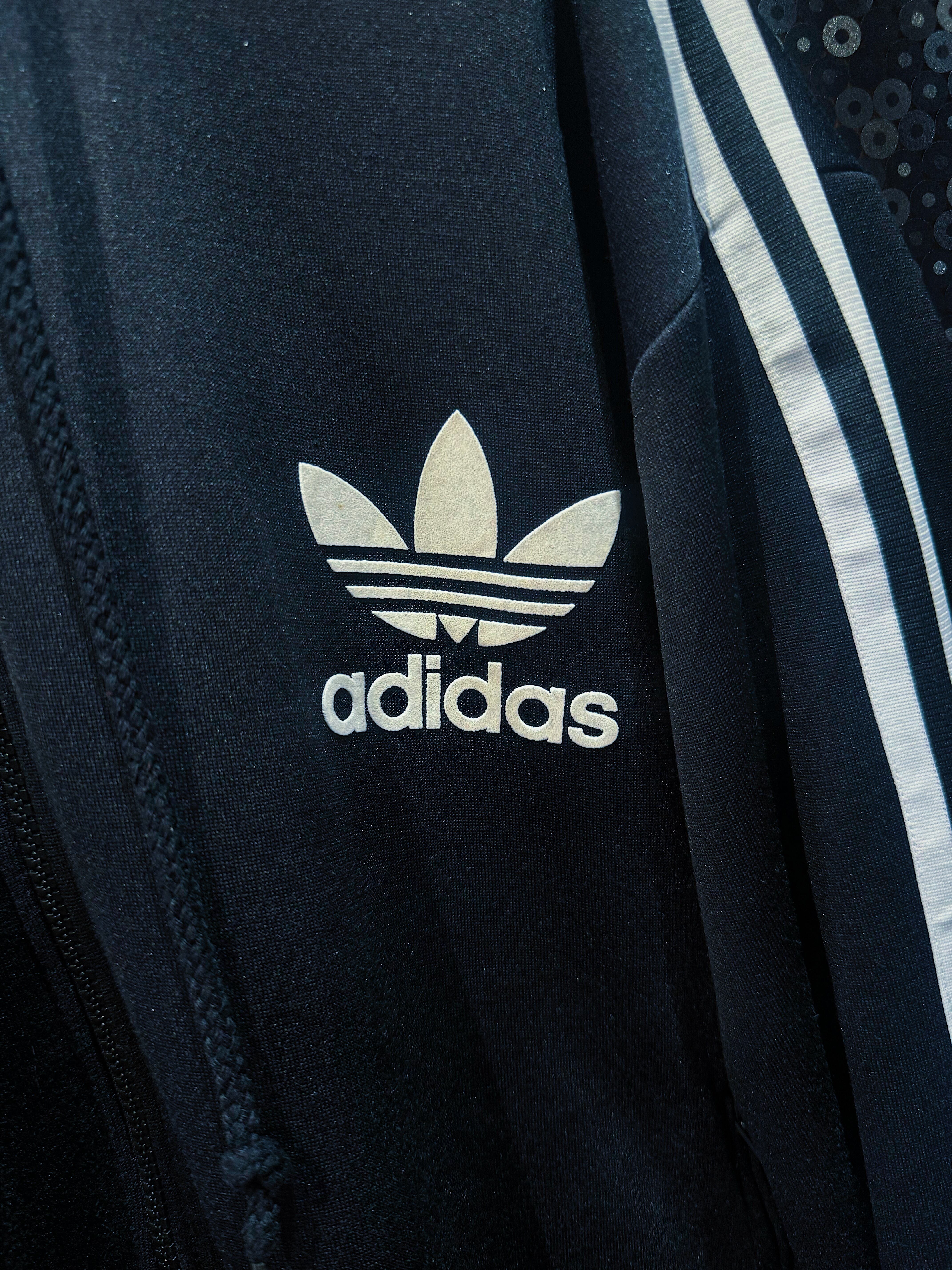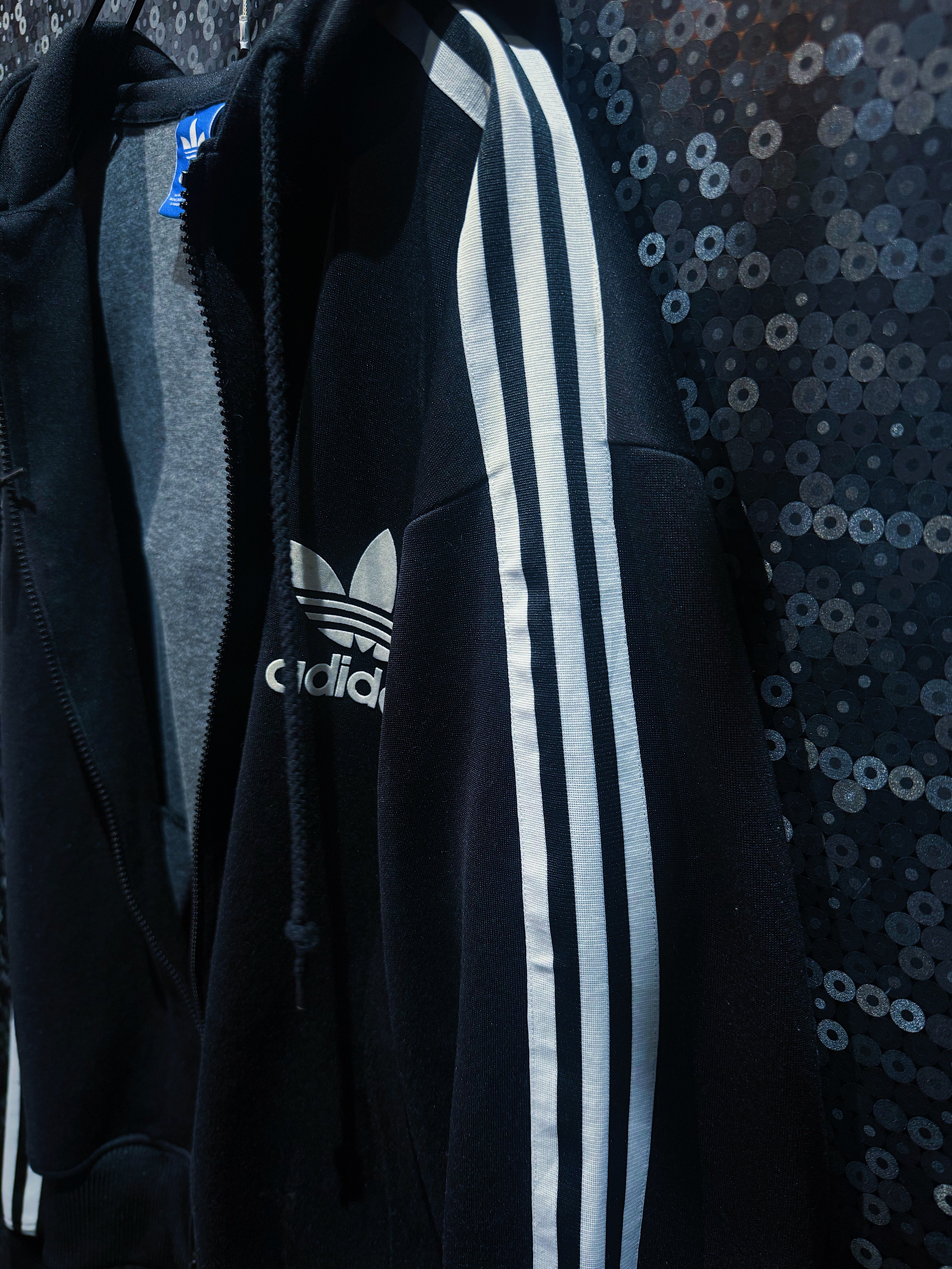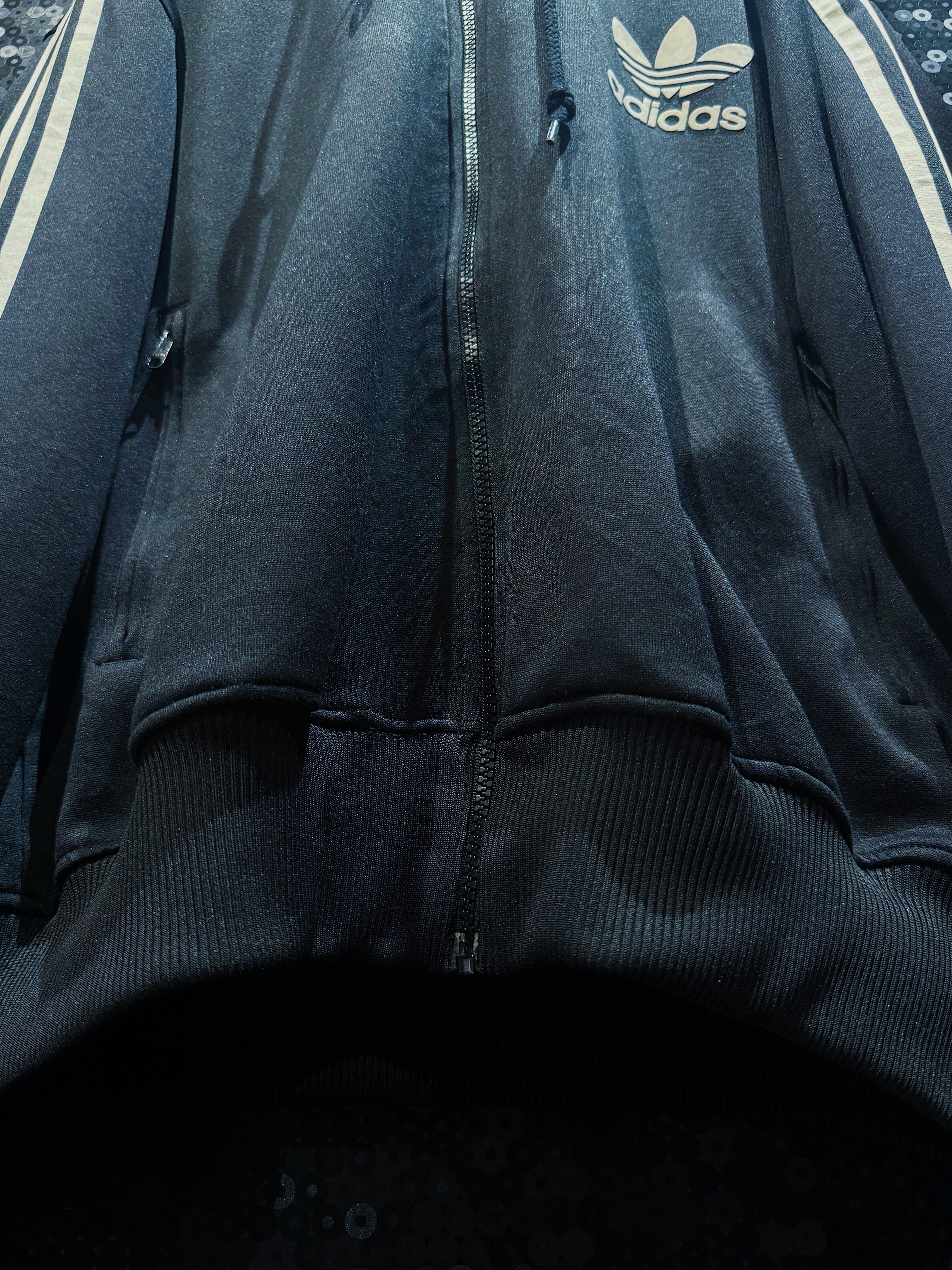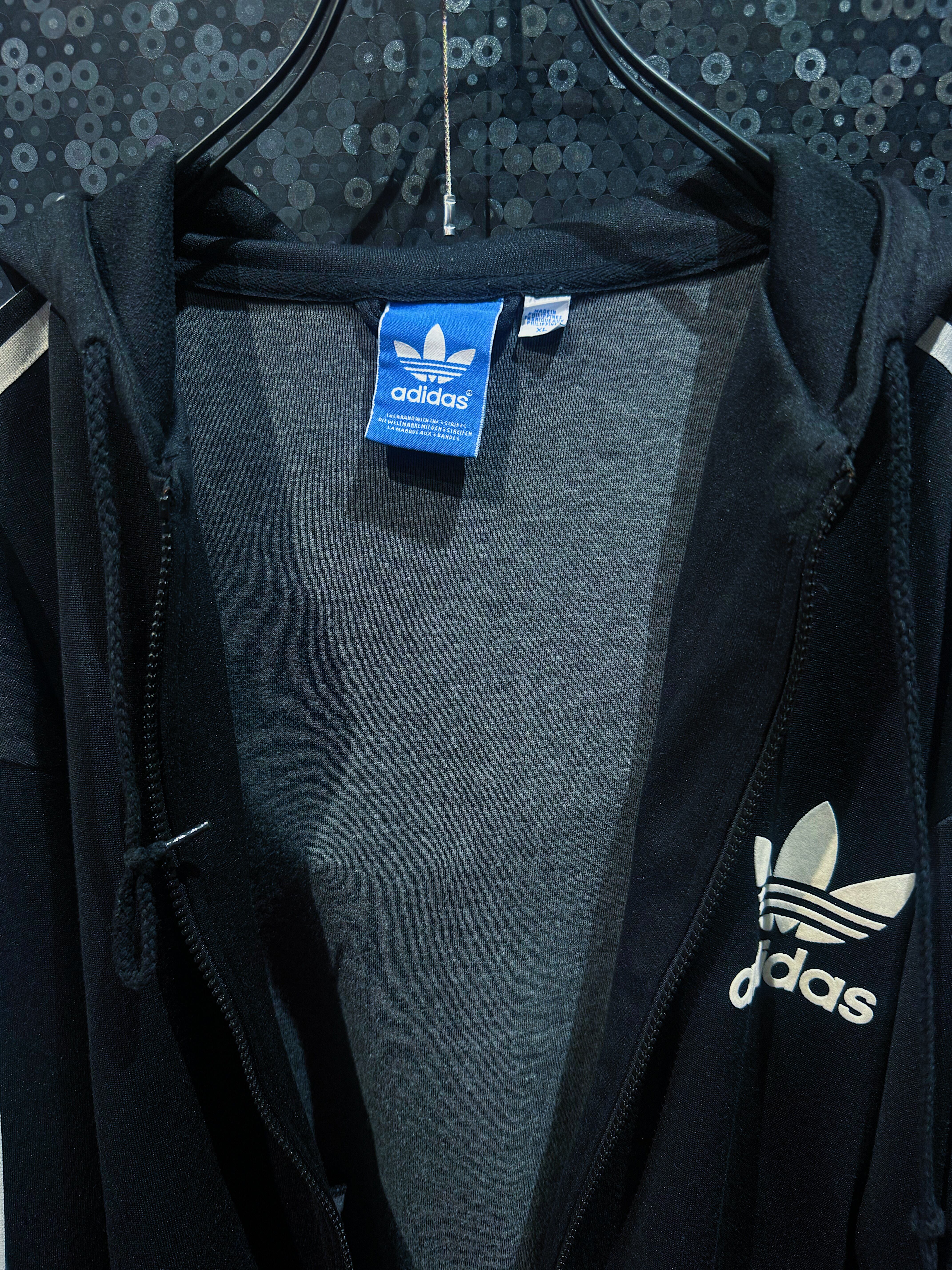 非常に珍しいトラックジャケットフーディー仕様の一着。定番のスリーストライプラインと胸元のトレフォイルロゴ刺繍という伝統的な意匠を踏襲しながら、通常のトラックジャケットにはないフード付きデザインが目を引きます。