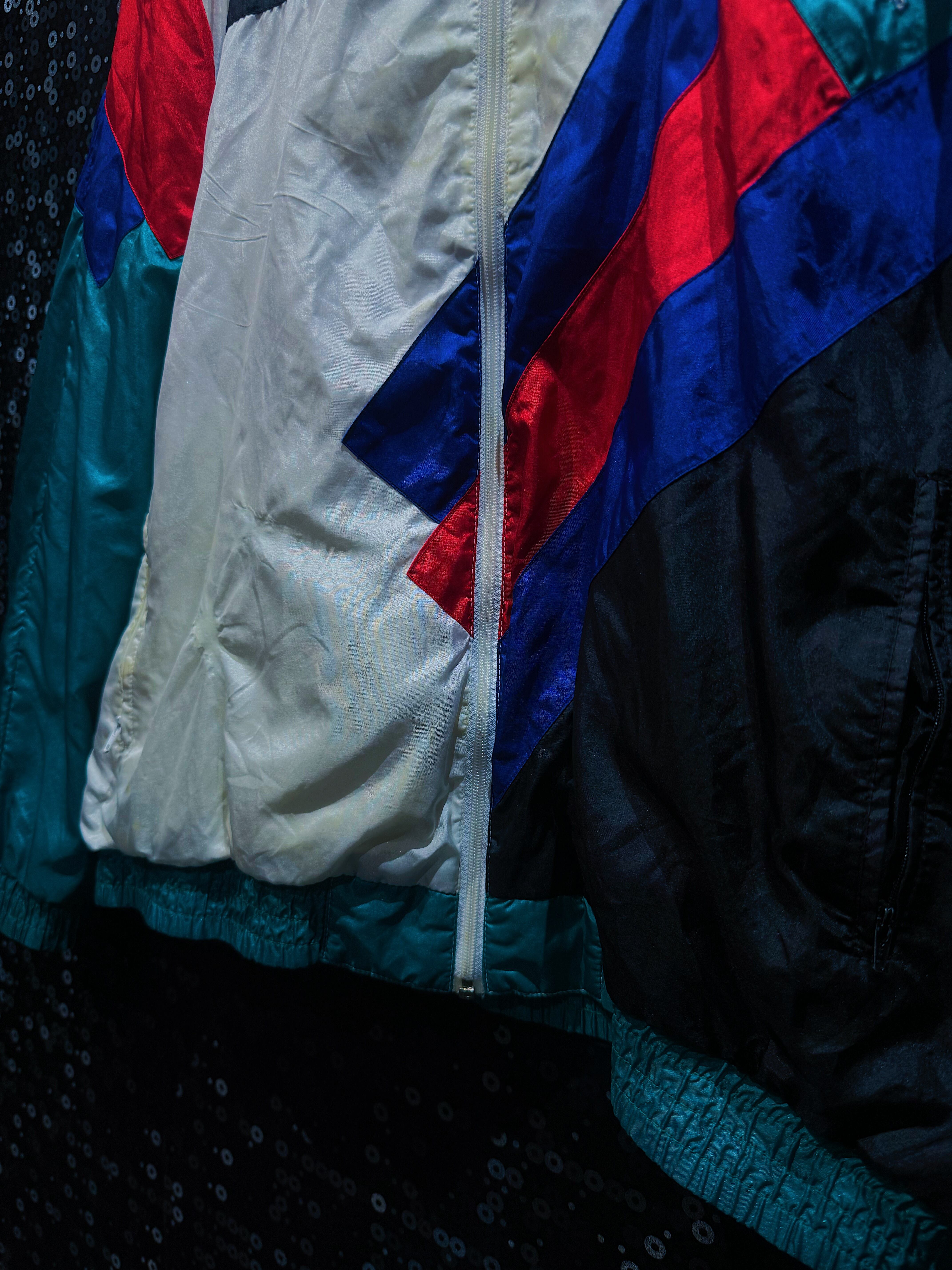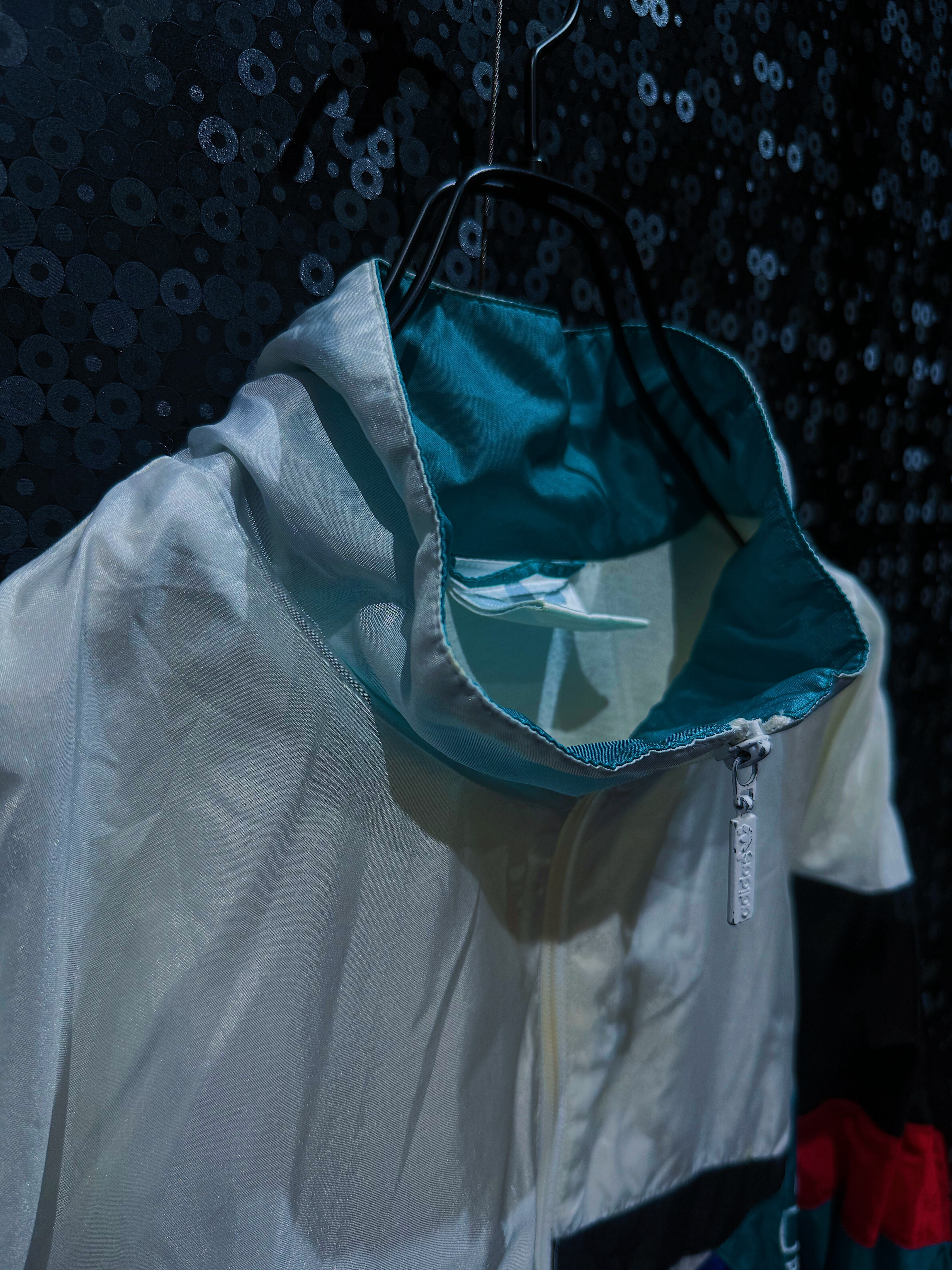 全体のカラーブロックも圧巻で、ホワイトベースにターコイズ、レッド、ネイビー、ブラックを大胆に切り替えた派手な配色。しかも素材には、90年代特有の光沢感のあるナイロン生地を使用しており、レトロなツヤ感がスタイリングに映える仕上がりになっています。