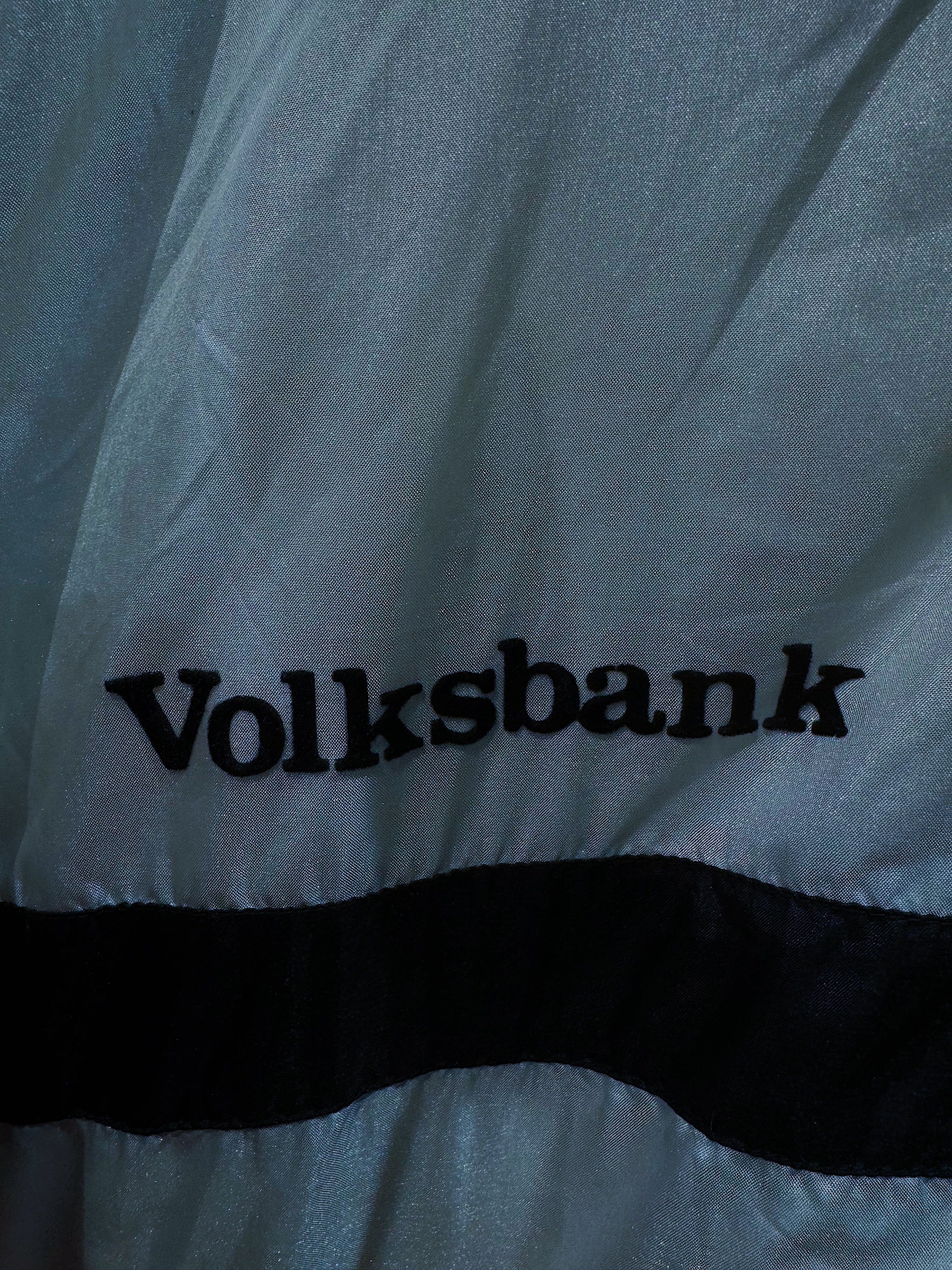 フロントにはドイツの地方銀行「Volksbank(フォルクスバンク)」のロゴ刺繍が施されており、企業支給品らしい特別感を漂わせています。