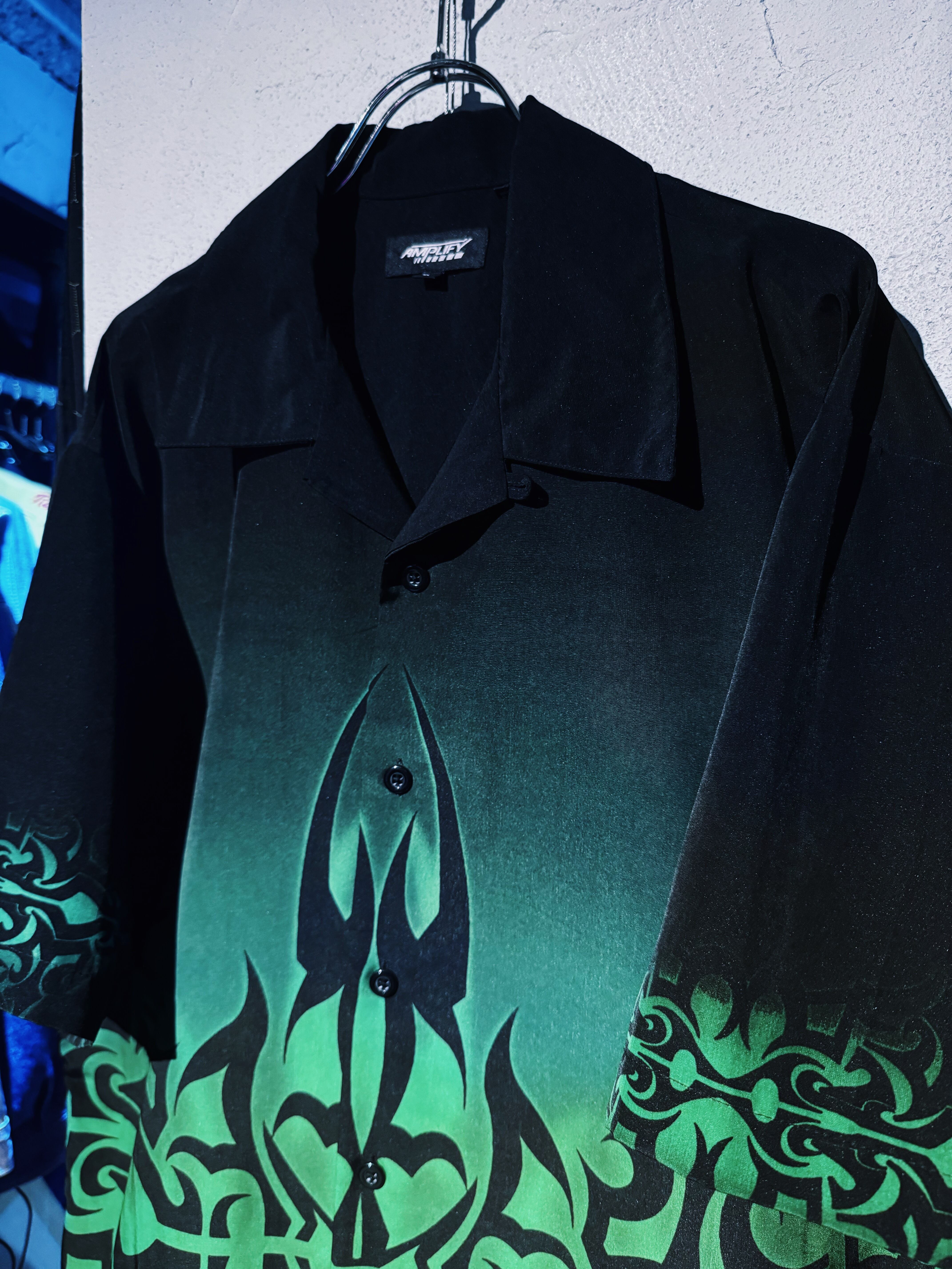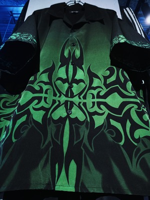 グリーンのトライバルパターンの様な禍々しいデザインが施されており圧巻の存在感で最高にクールでストリートな1着。一枚でかなり目に止まる圧倒的なデザイン。