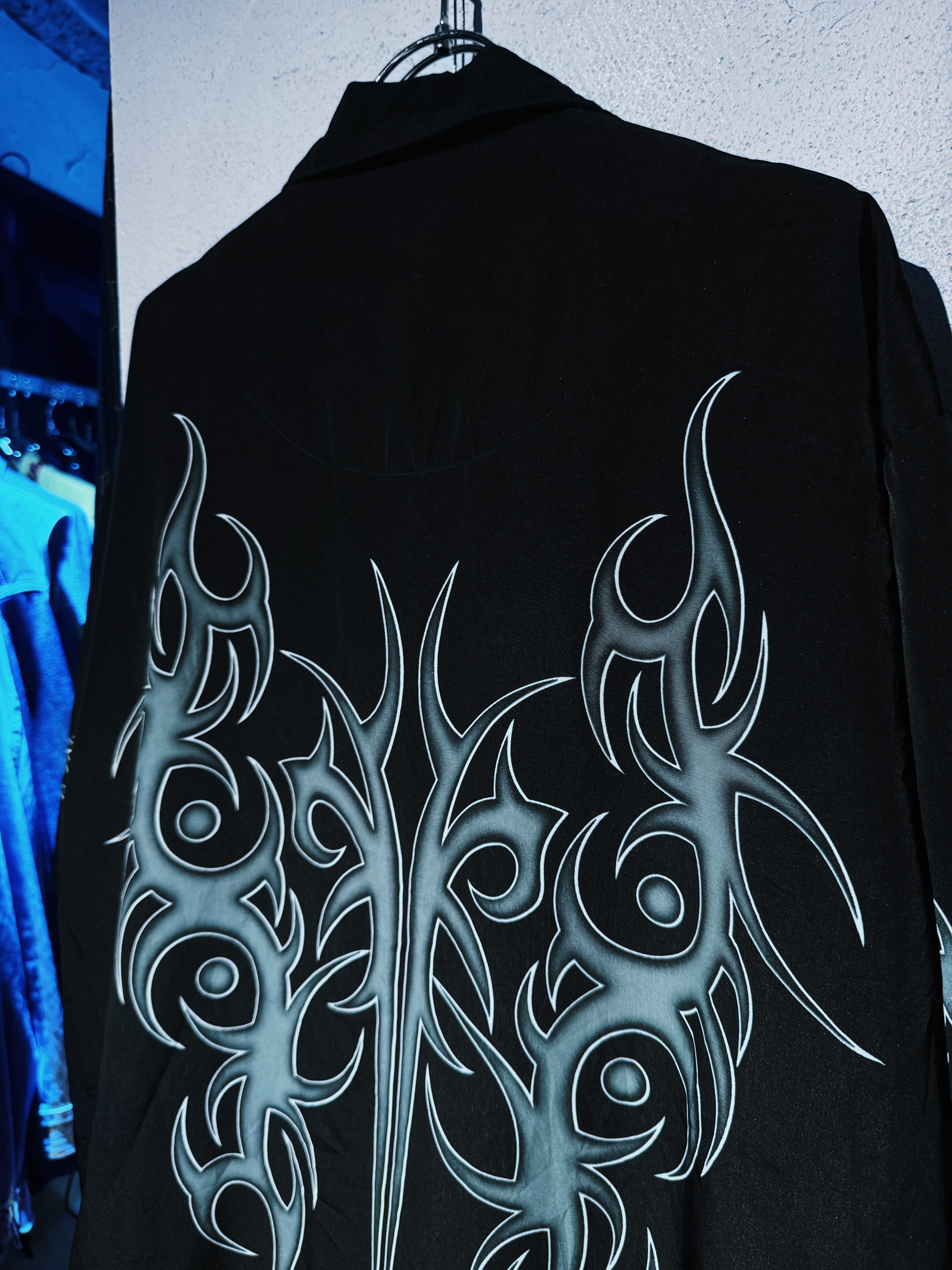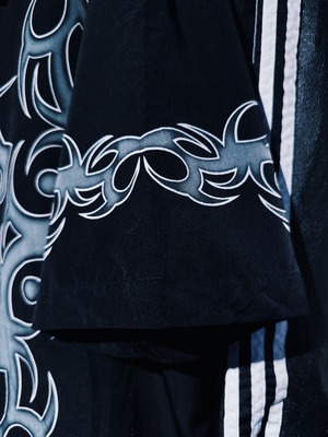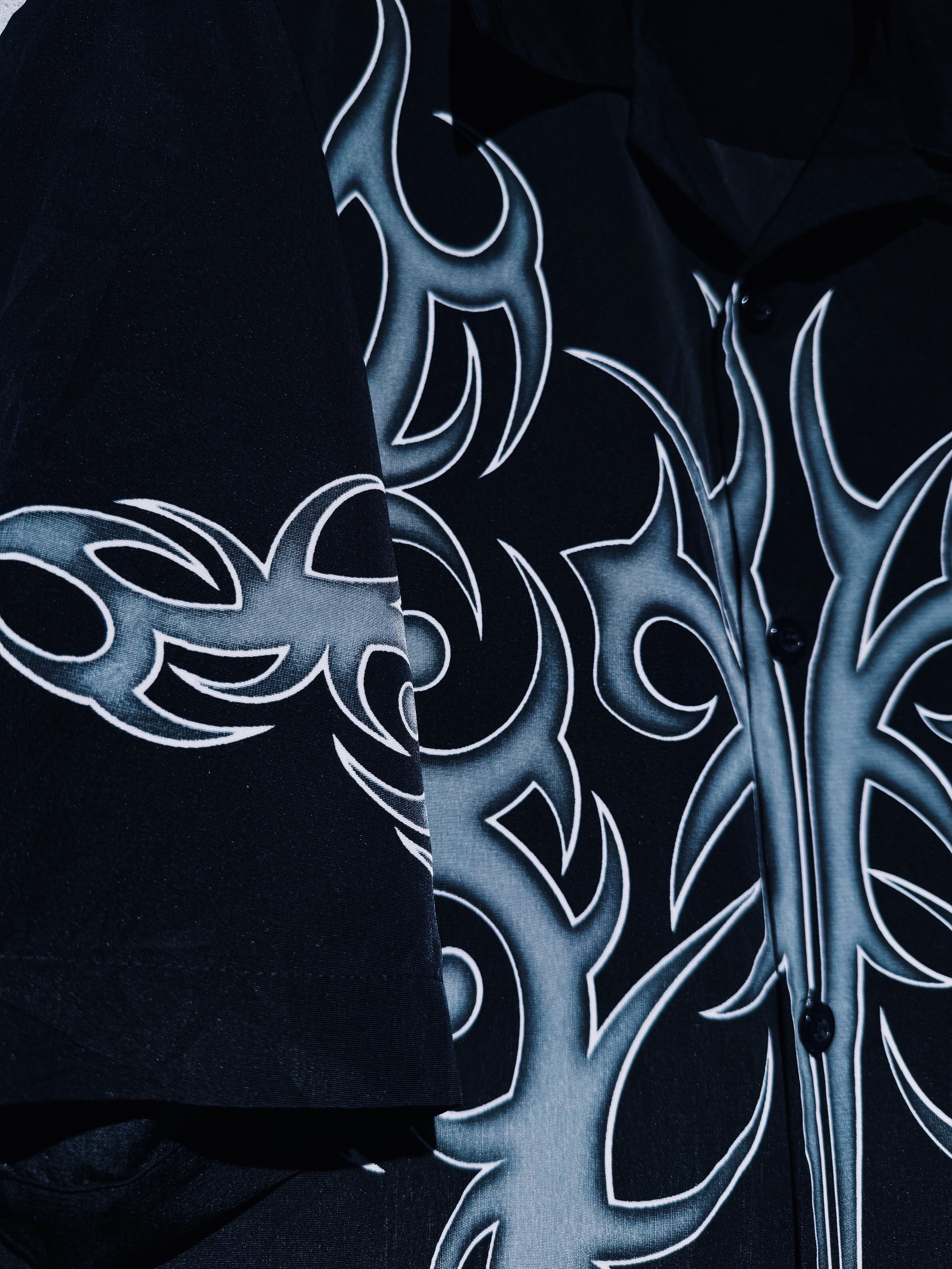 ブラックのボディにグレーのトライバルパターンの様な禍々しいデザインが施されており圧巻の存在感で最高にクールでストリートな1着。一枚でかなり目に止まる圧倒的なデザイン。