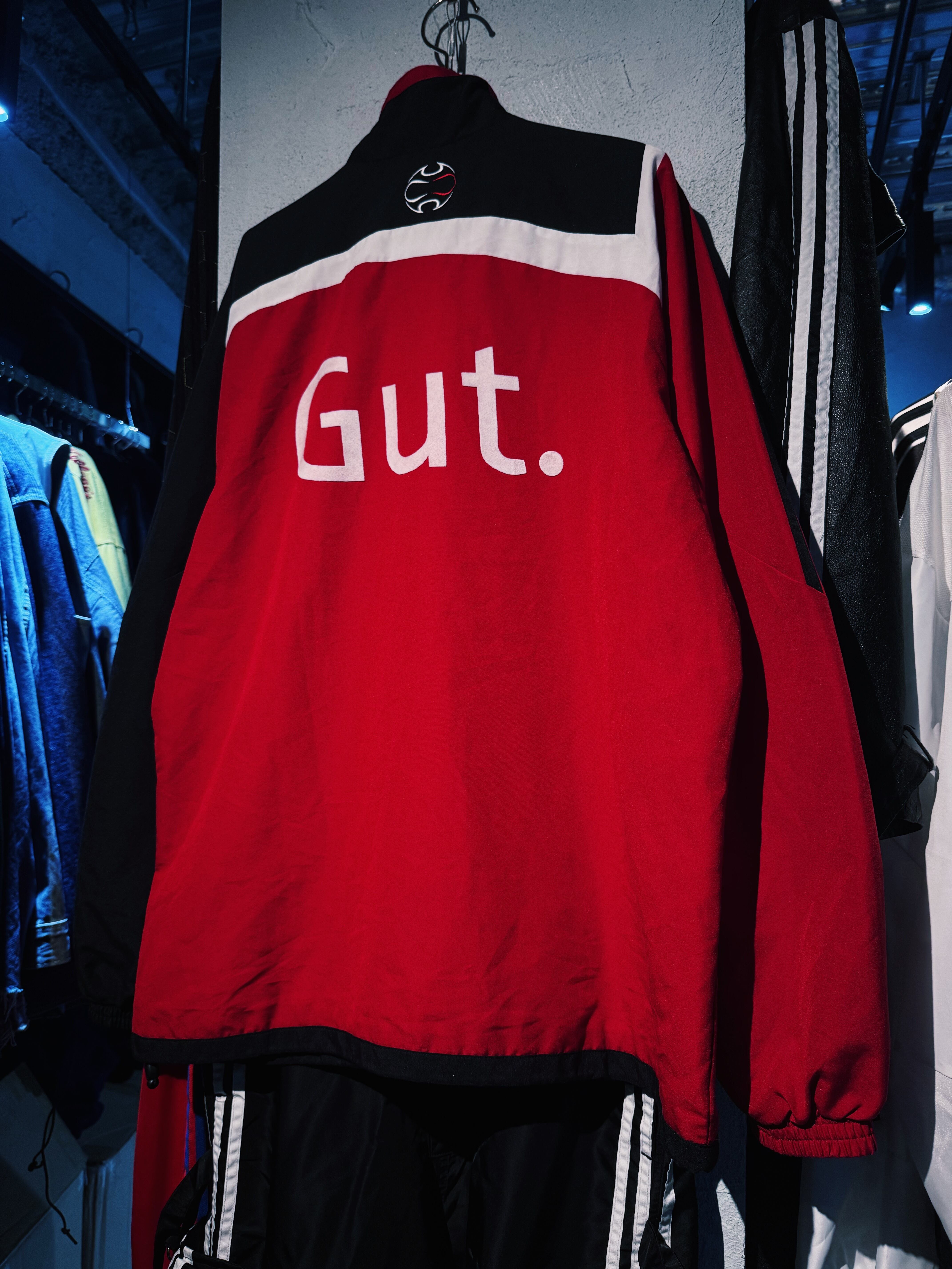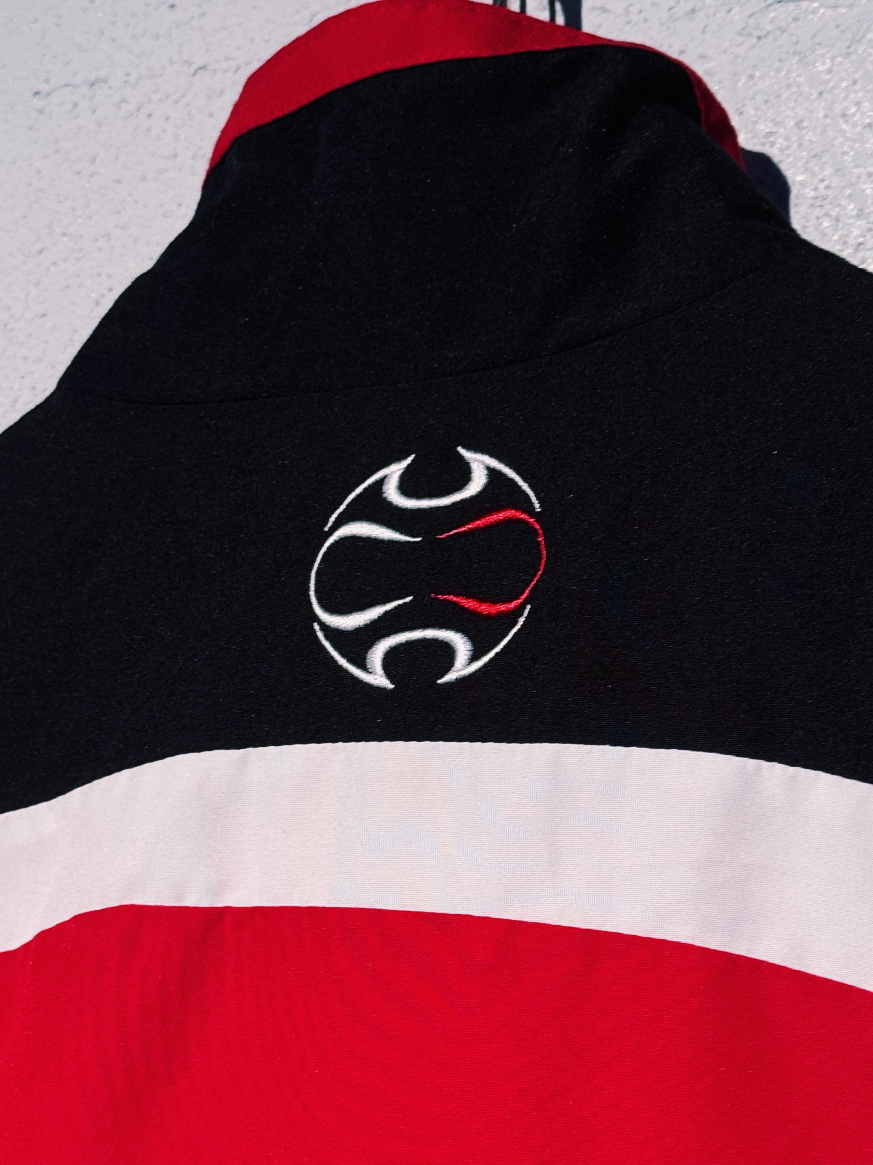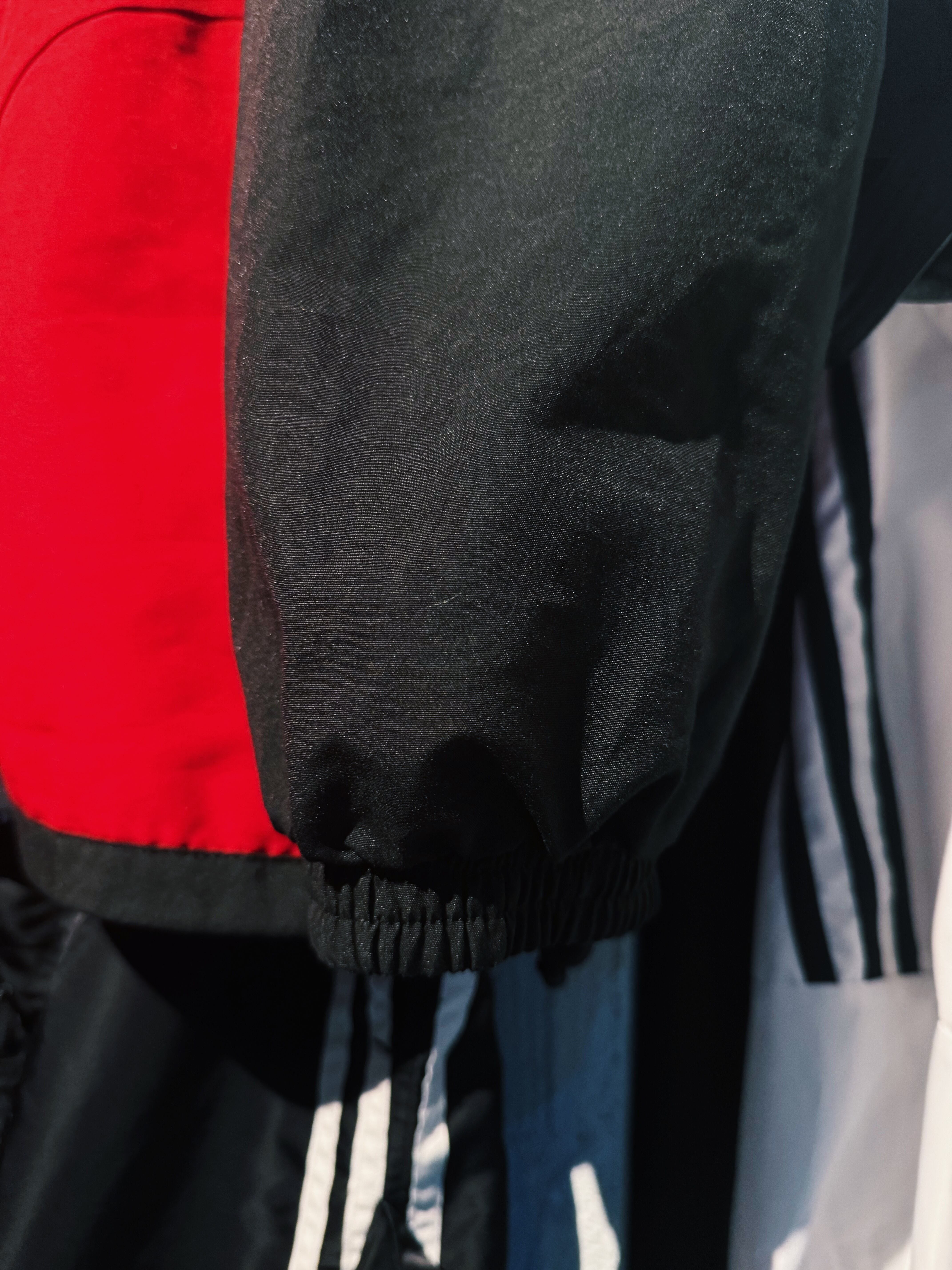 レッドカラーメインでブラックという間違いなくかっこいいカラーリングのトラックジャケット。今回はオリンピックや他の企業などのワッペンが施された特別仕様の極上の1着。