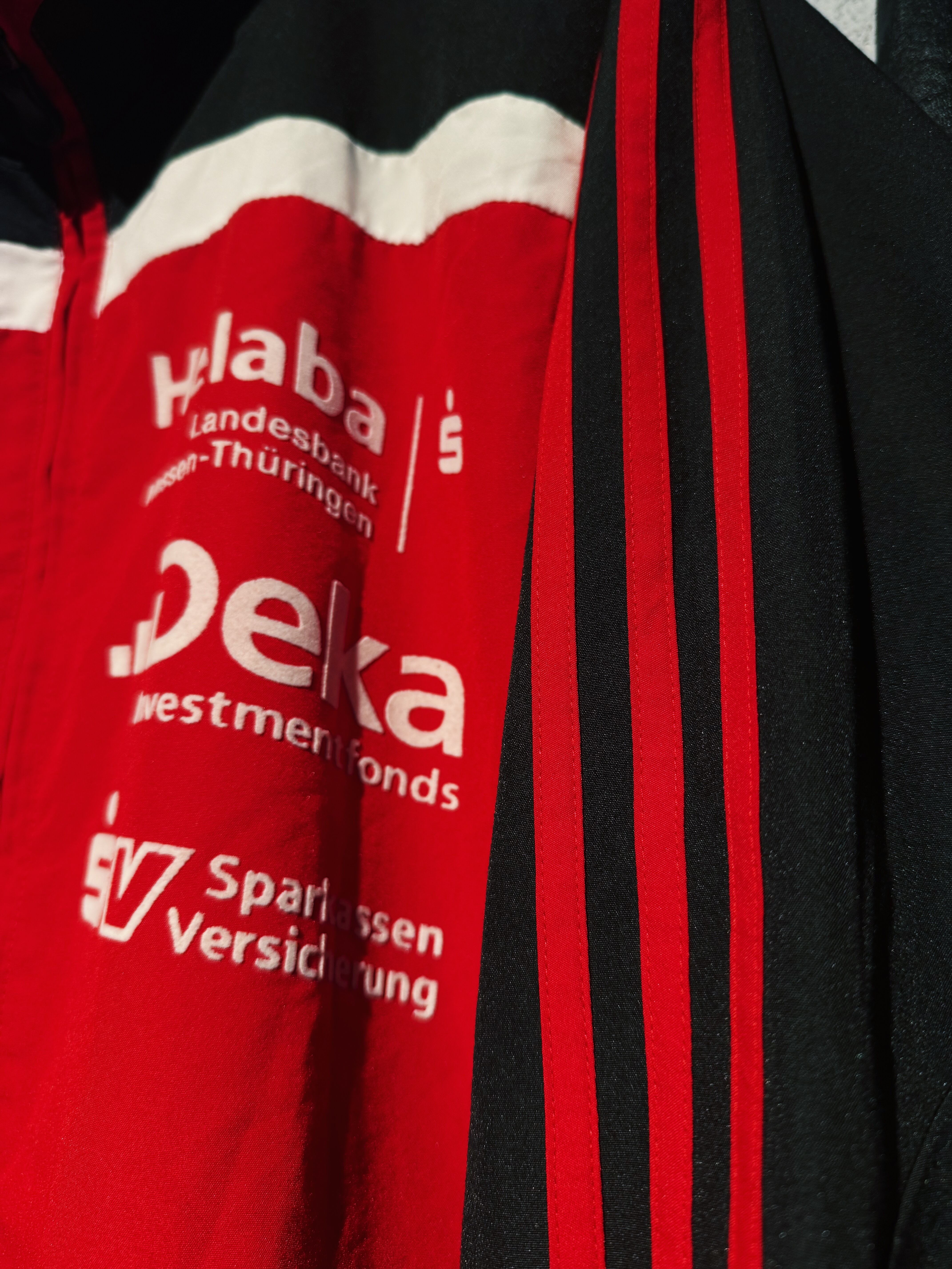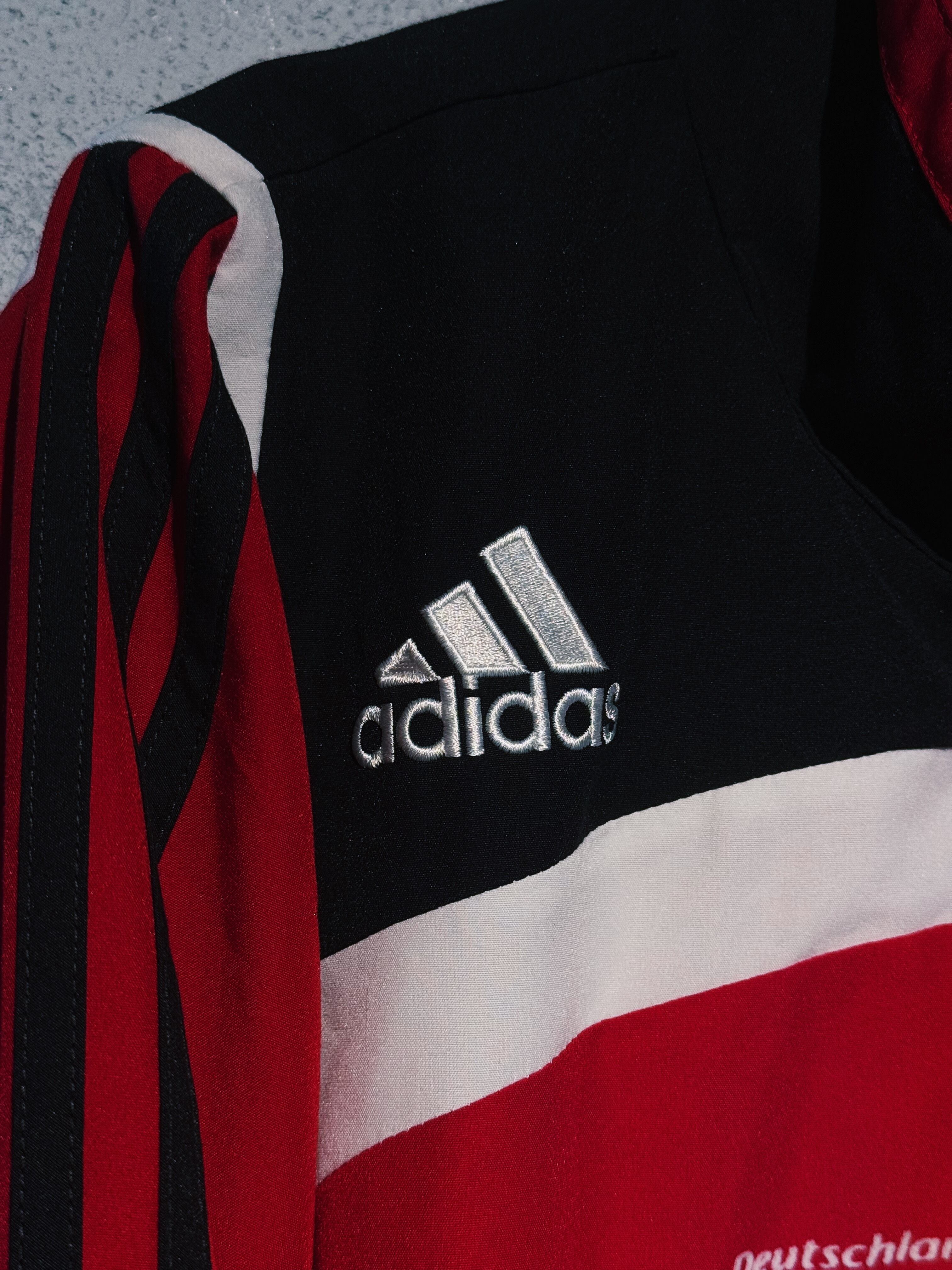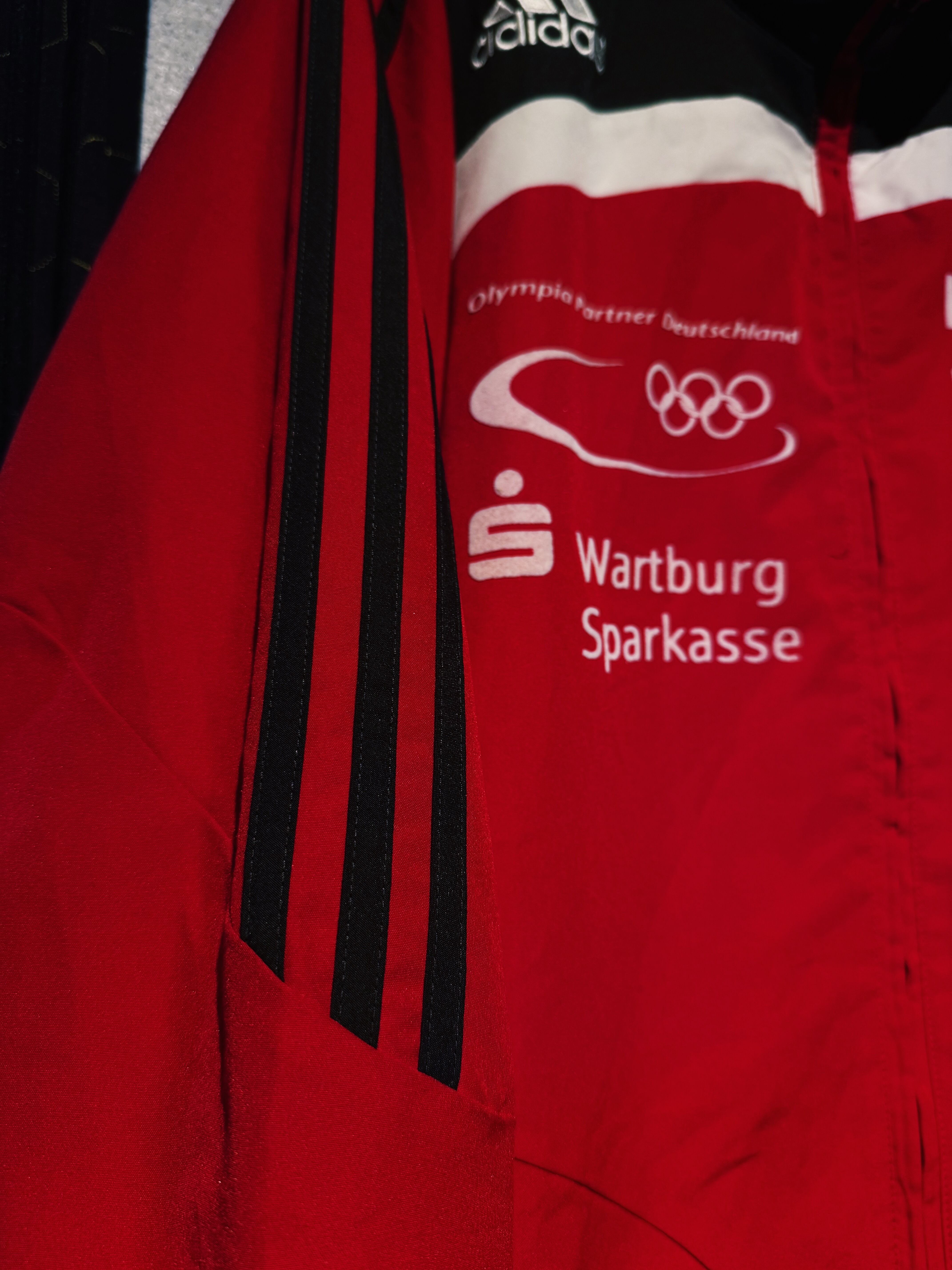 レッドカラーメインでブラックという間違いなくかっこいいカラーリングのトラックジャケット。今回はオリンピックや他の企業などのワッペンが施された特別仕様の極上の1着。