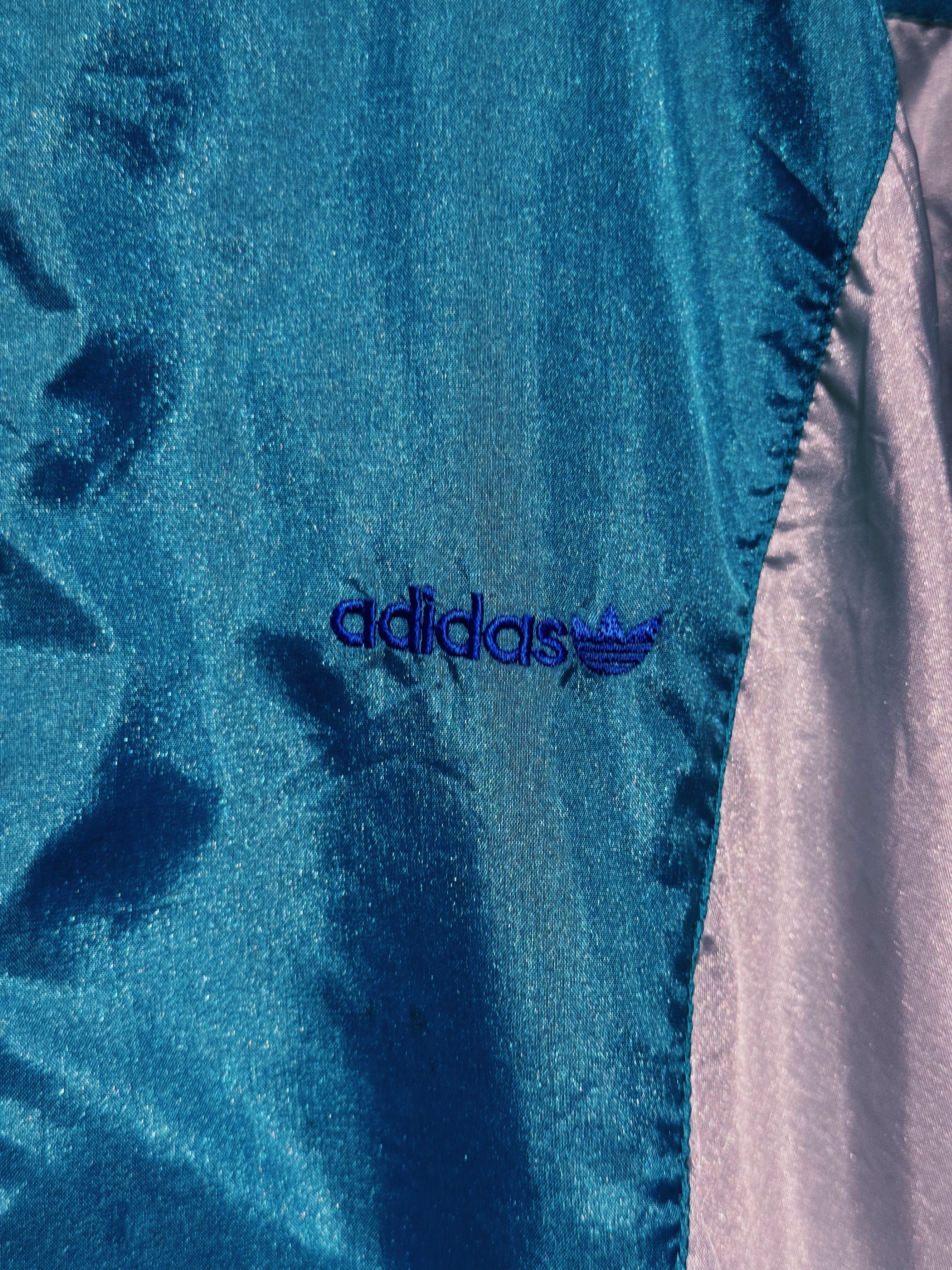 ティファニーブルーカラーのスイッチングに目が奪われるナイロントラックジャケット。3ストライプスやロゴとは違いユーロ規格らしい洗練されたデザインは高級感があって良いですね。