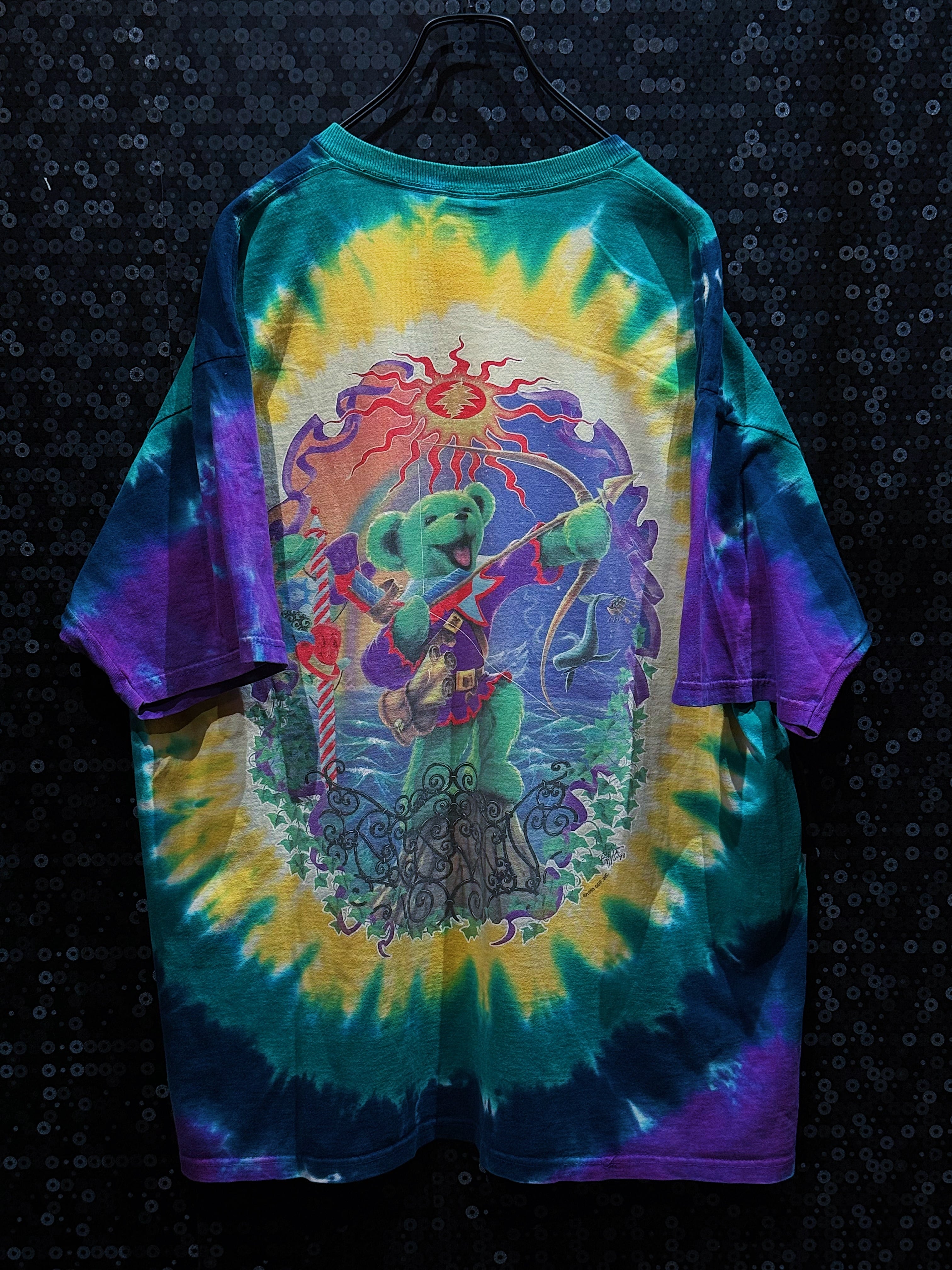 Grateful Deadの名物キャラクター「Dancing Bear」がローブを羽織り、薔薇や稲妻モチーフに囲まれた幻想的なヴィジュアルで描かれたLiquid Blue製のタイダイTシャツ。サイケデリックカルチャーの象徴ともいえるこの一枚は、まさに90年代ヒッピー×ロックの美学が結晶したアートピース。フロントには墓石モチーフとともに「Jerry Garcia」のイニシャルを思わせる“JGW”が刻まれ、故ジェリーへのリスペクトも色濃く表現。全体を彩るグラデーション染めの美しさはLiquid Blueならではの技術力の賜物で、まるで1枚のキャンバスに描かれたアートのよう。背面にも同系モチーフが展開されていれば、さらに希少性が高まるヴィンテージ名品。バンドT好きだけでなく、グラフィックアートや90sカルチャーに魅了される全ての人に刺さる一着です。