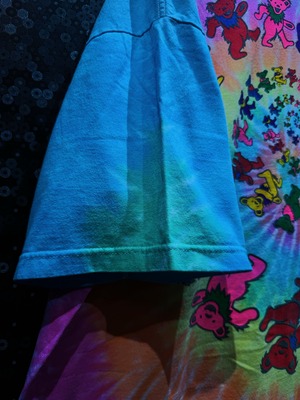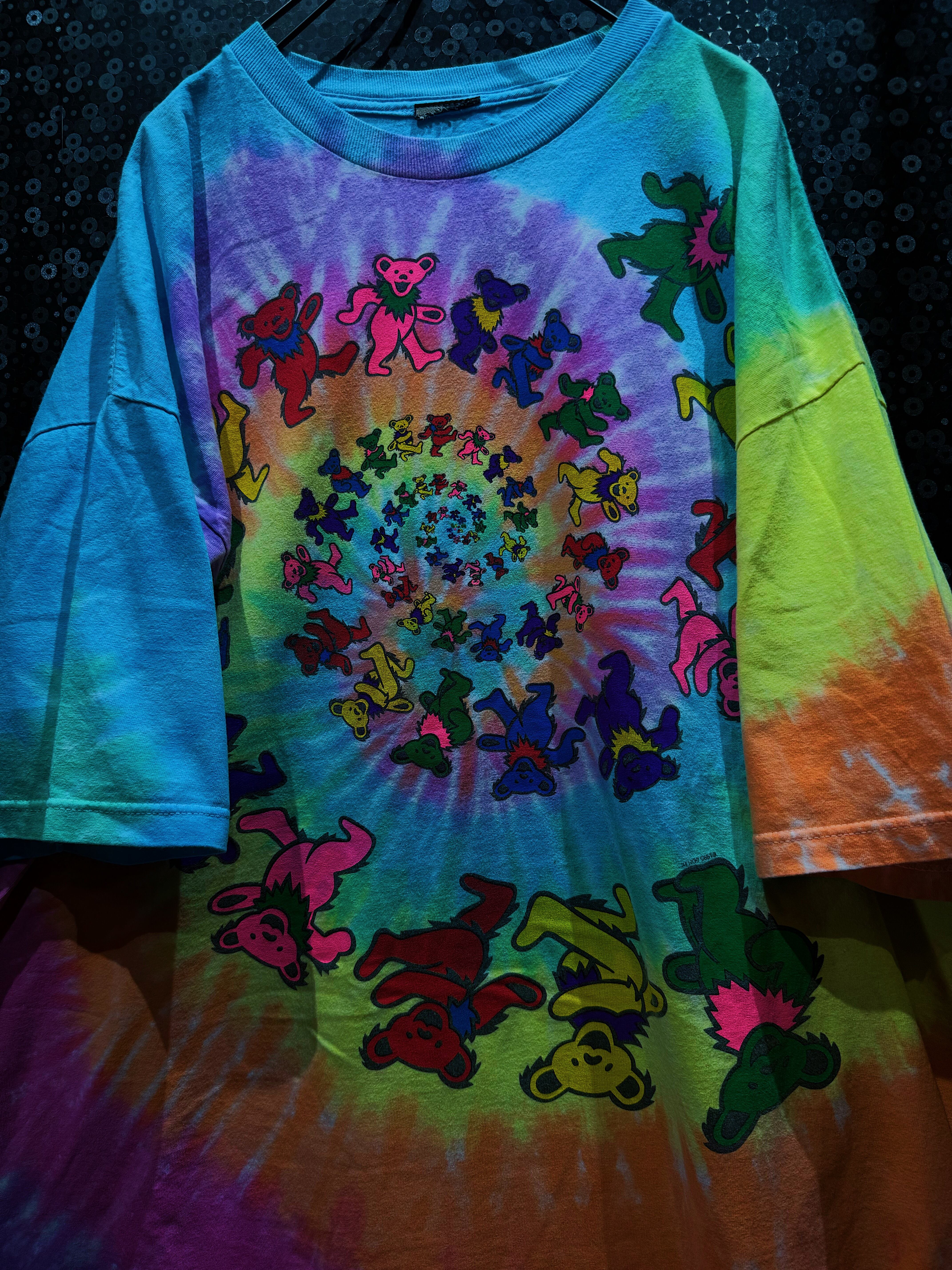 グレイトフル・デッドの象徴として知られる「ダンシング・ベア」が全面に描かれた、極彩色タイダイのヴィンテージTシャツ。