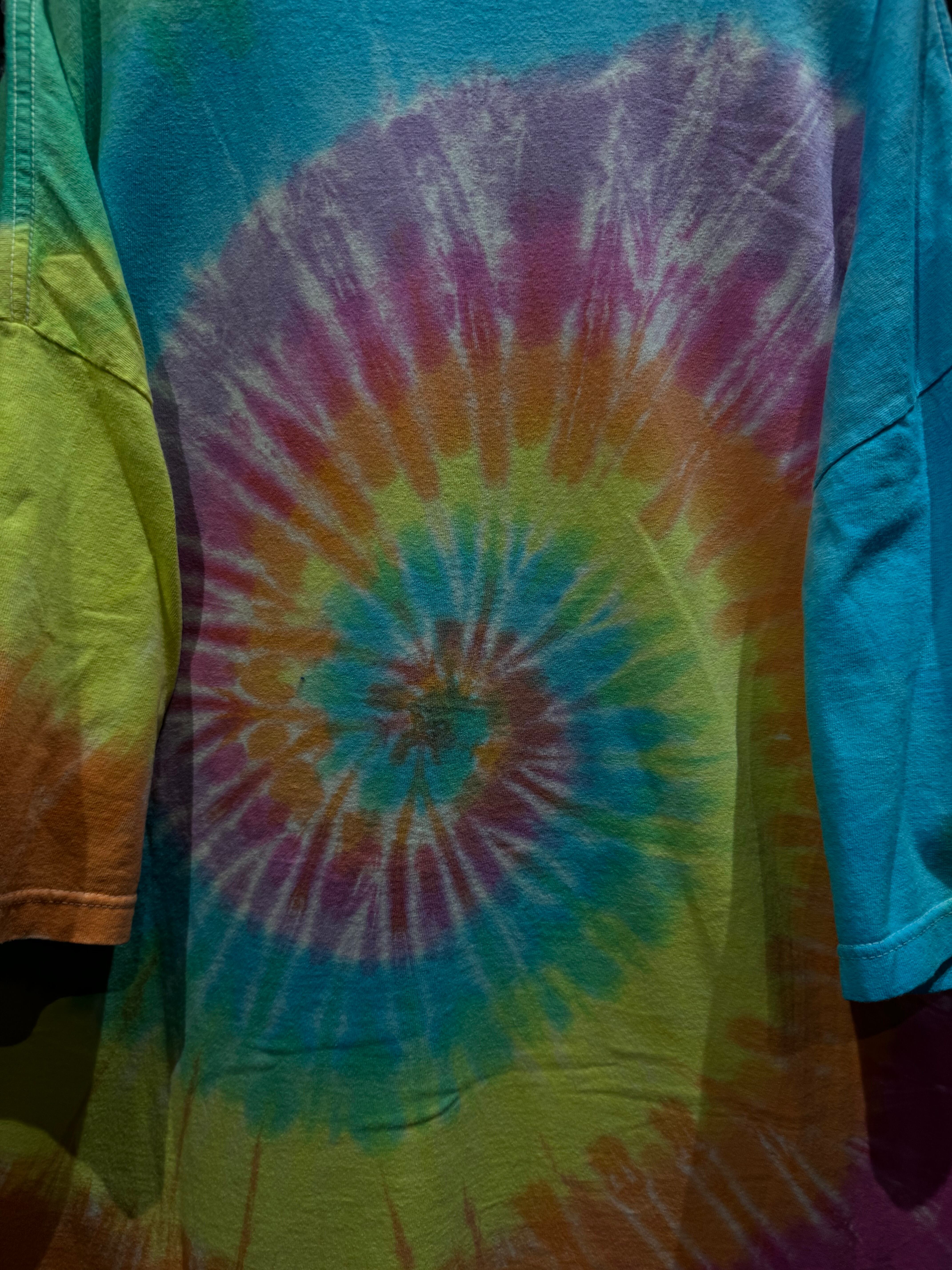 タイダイ染めとの組み合わせはまさに60〜70年代ヒッピーカルチャーのアイコンとも言えるビジュアルで、音楽とファッション、そして自由な精神が融合した芸術的な一枚。タグが消えかけている点も、長い時を経た証としてヴィンテージの魅力を一層際立たせています。