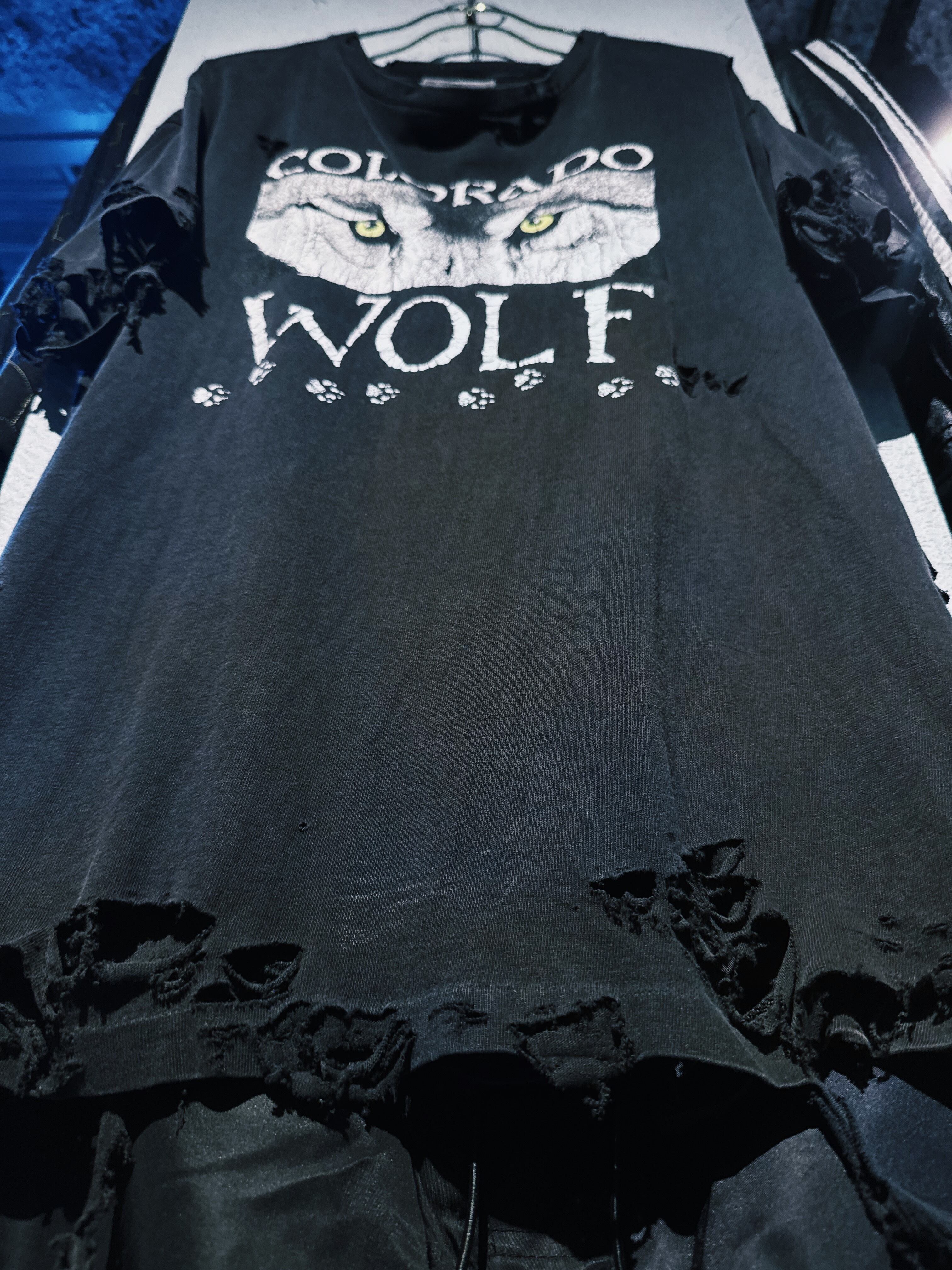 待望のボロTが新入荷。今回は90'sのウルフのデザインが施されたTシャツのシンプルで使いやすいヴィンテージTをベースに絶妙なカッティングなどが施された圧巻のボロTシャツ。