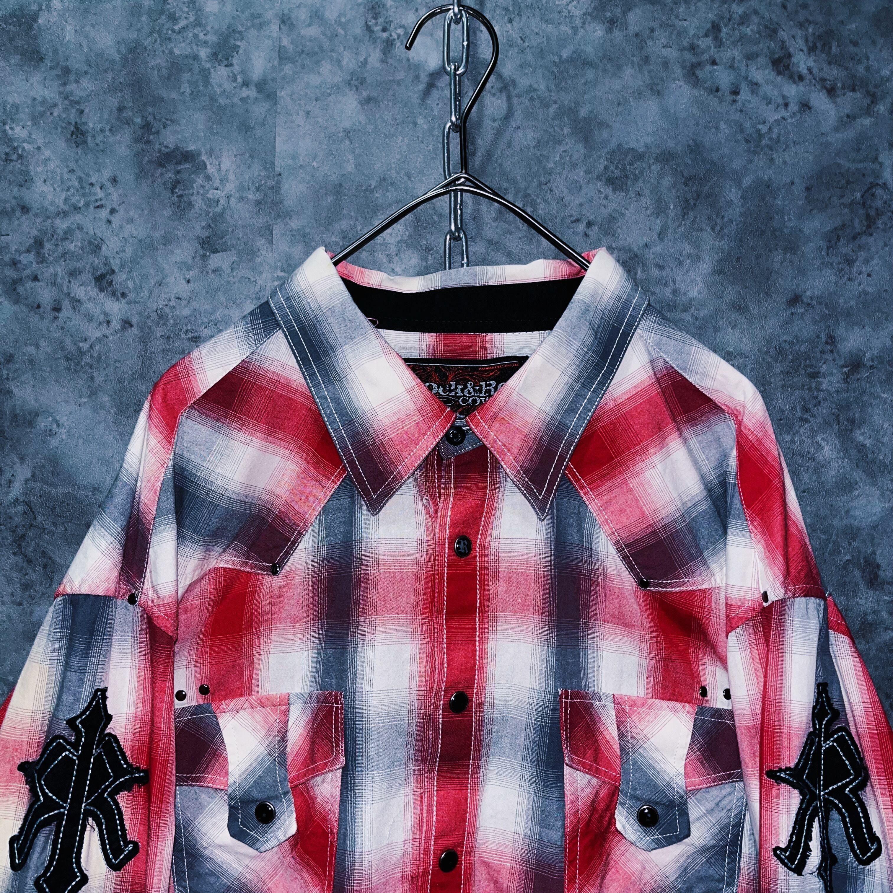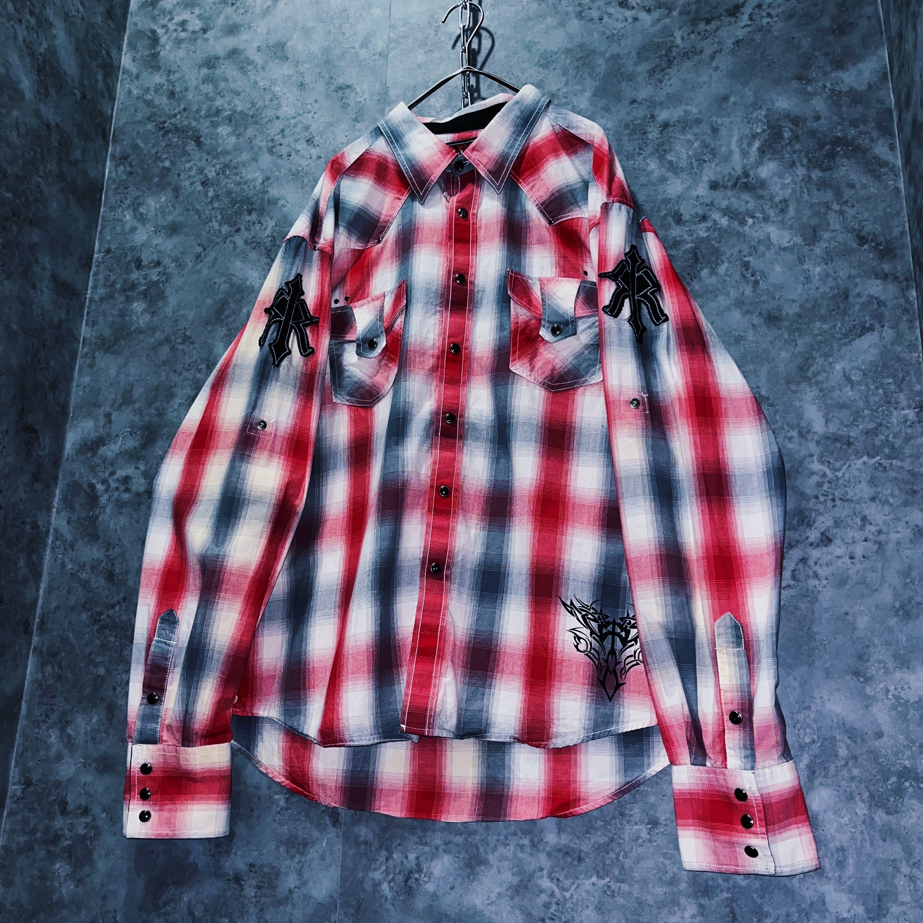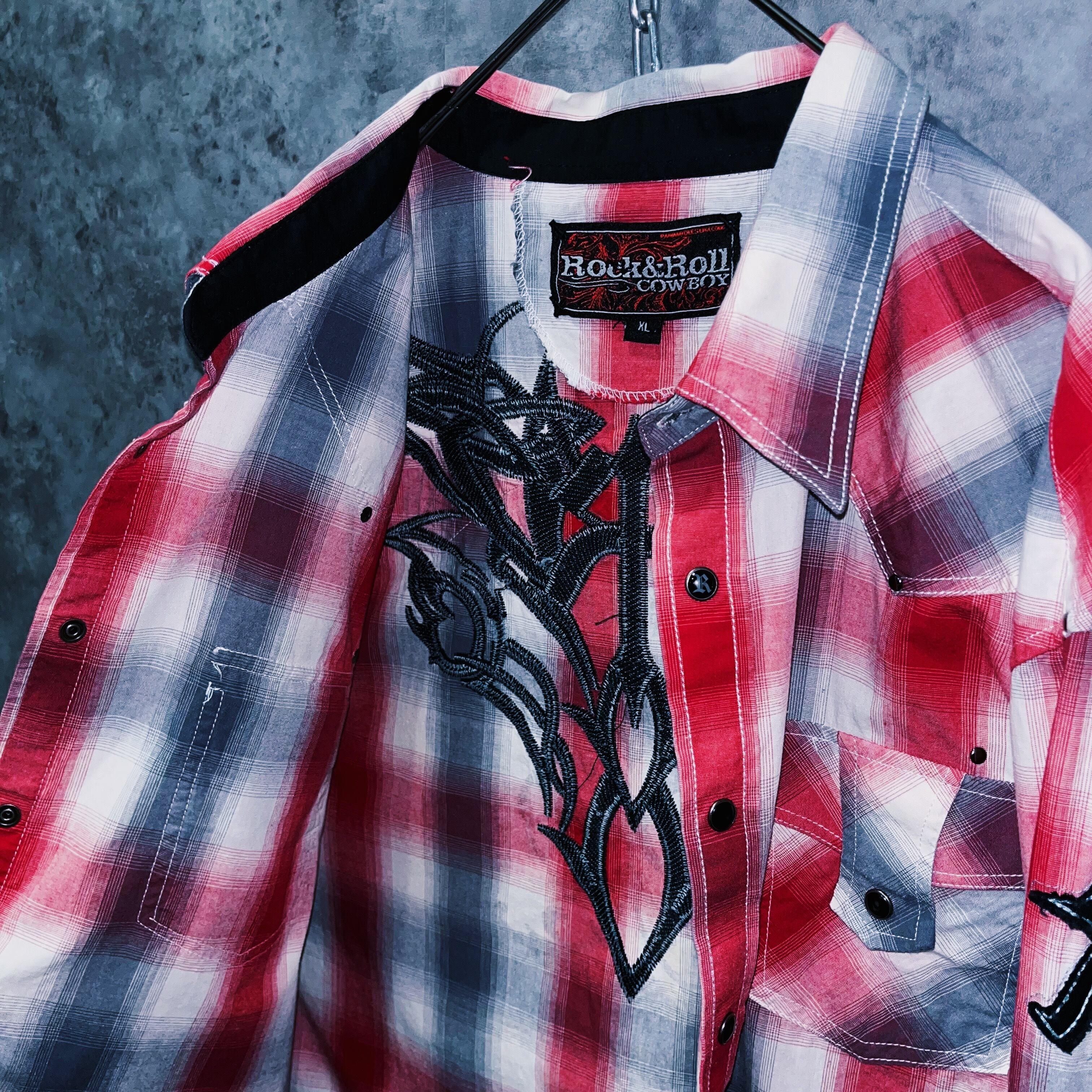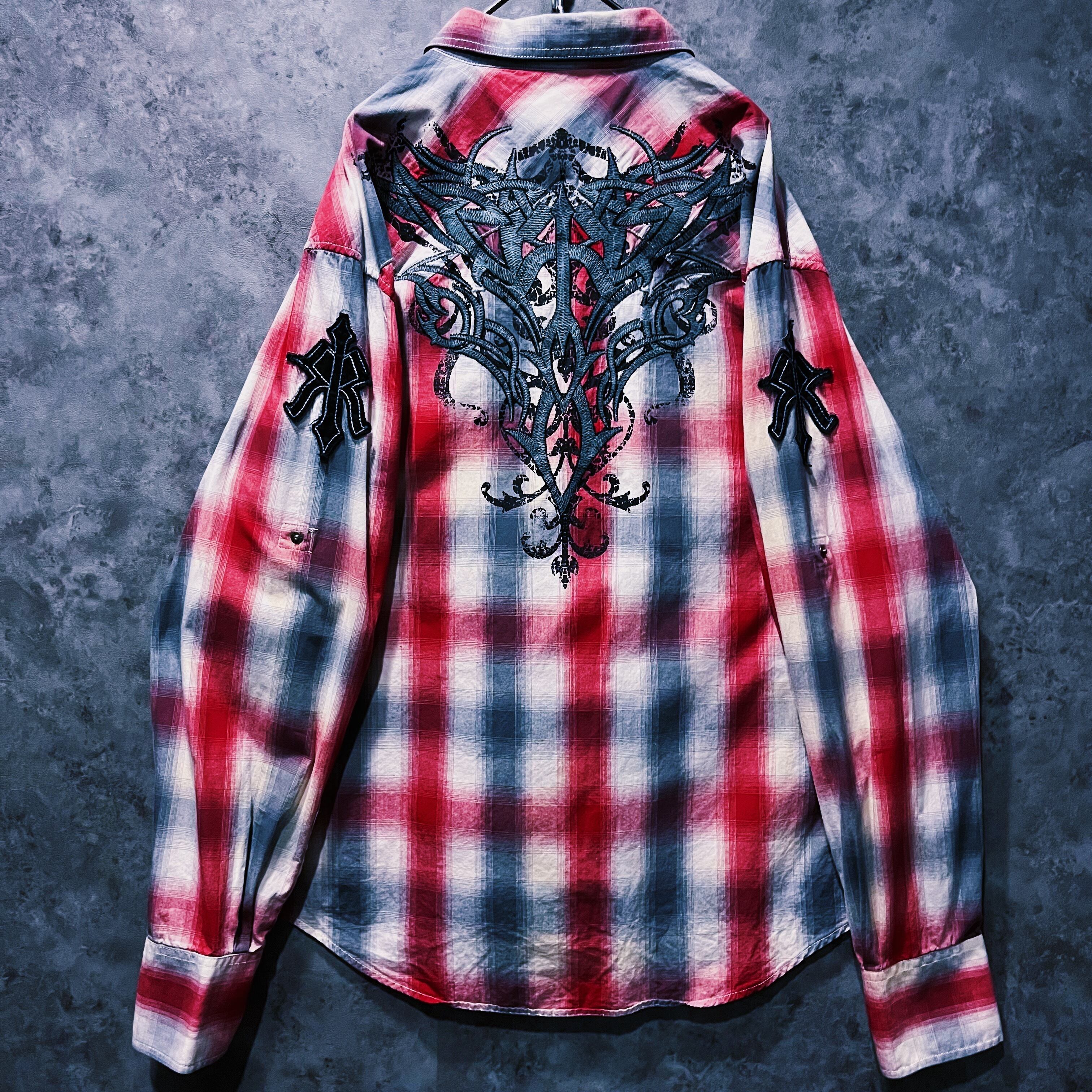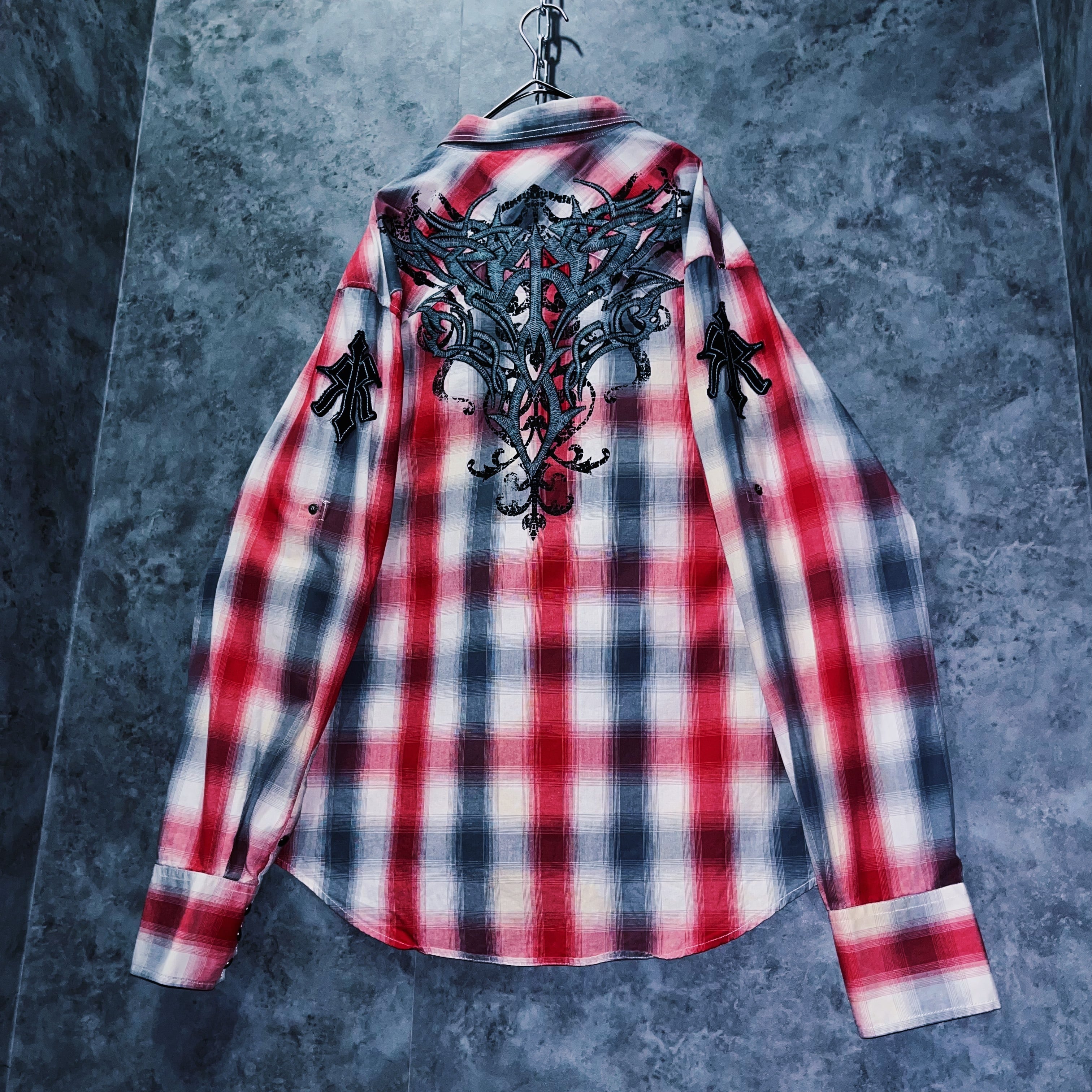 ヴィンテージトライバルエンブロイダリーデザインレッドカラーチェックシャツ