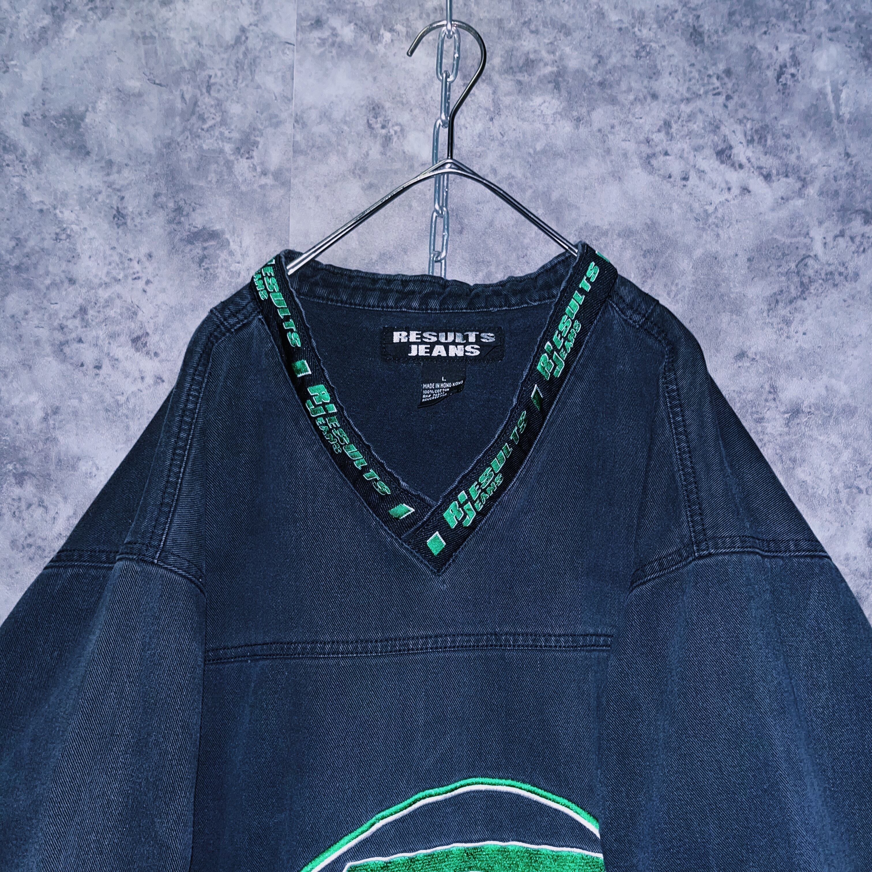 90's vintage "RESULTS JEANS" black denim half sleeve loose game shirt