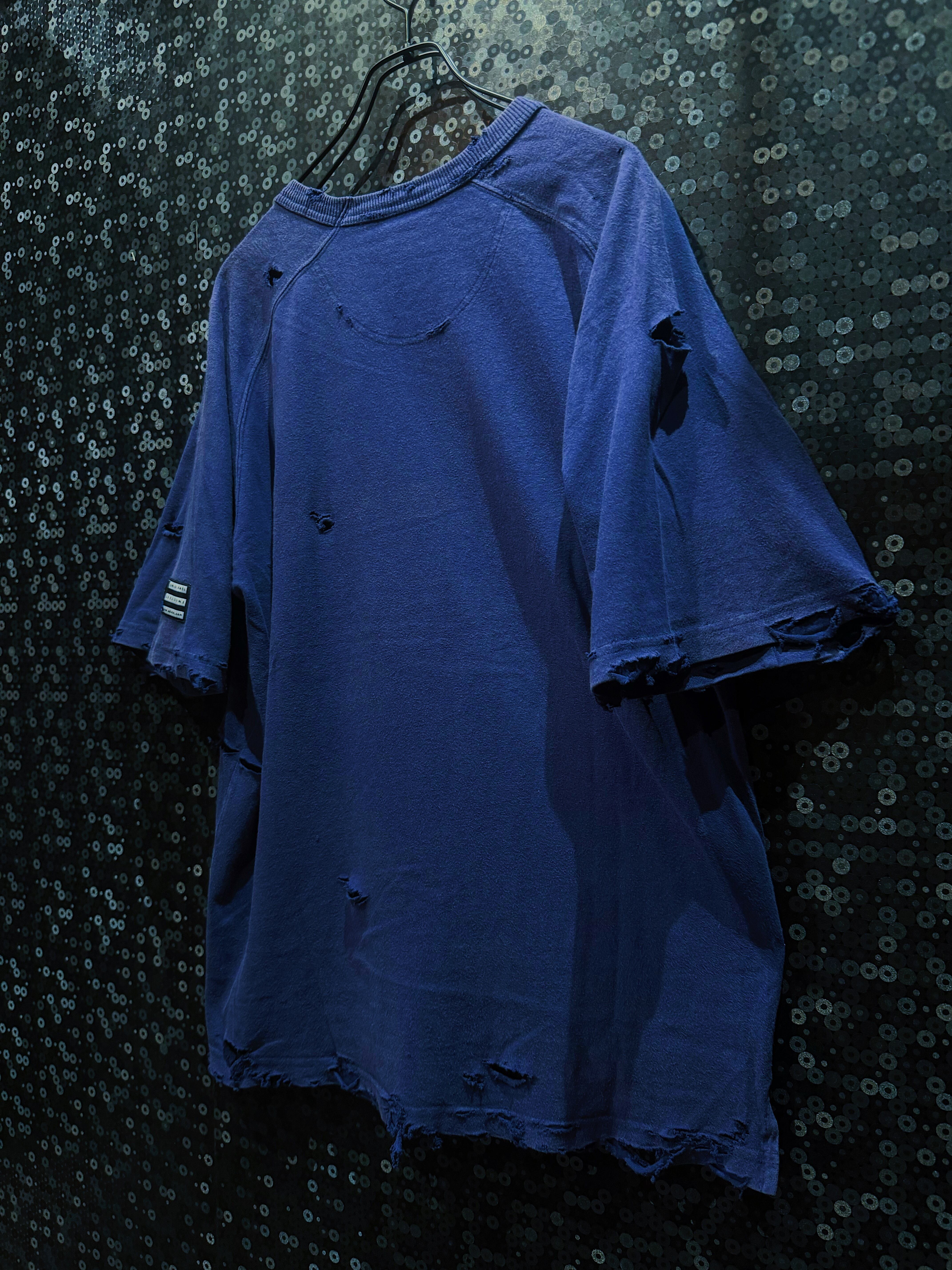 adidas「CORPORATE LOGO LINE」のヴィンテージボロ加工Tシャツ。濃厚なインディゴ寄りのブルーに、胸元の立体ロゴ刺繍が強いインパクトを放つ一枚です。
