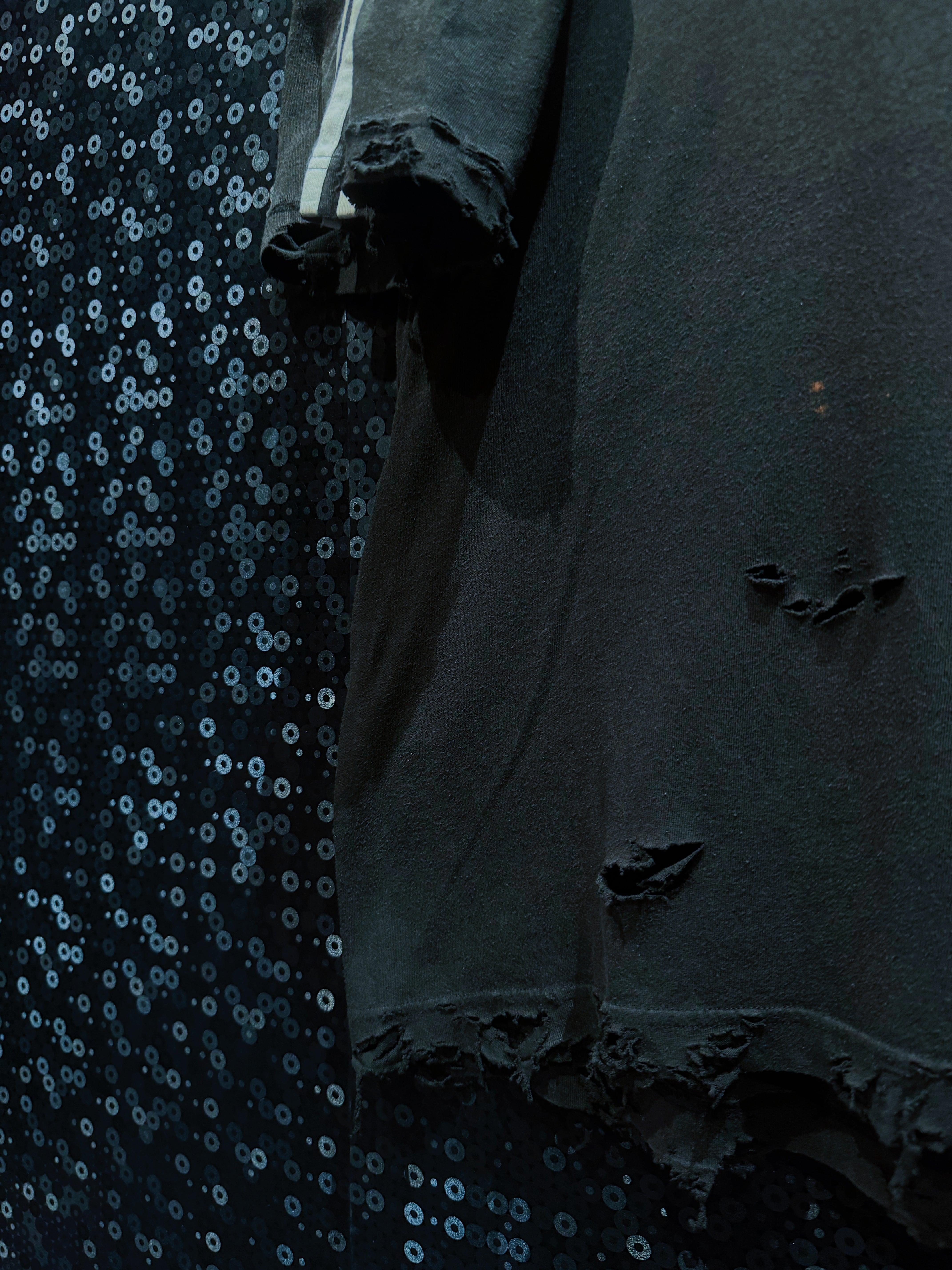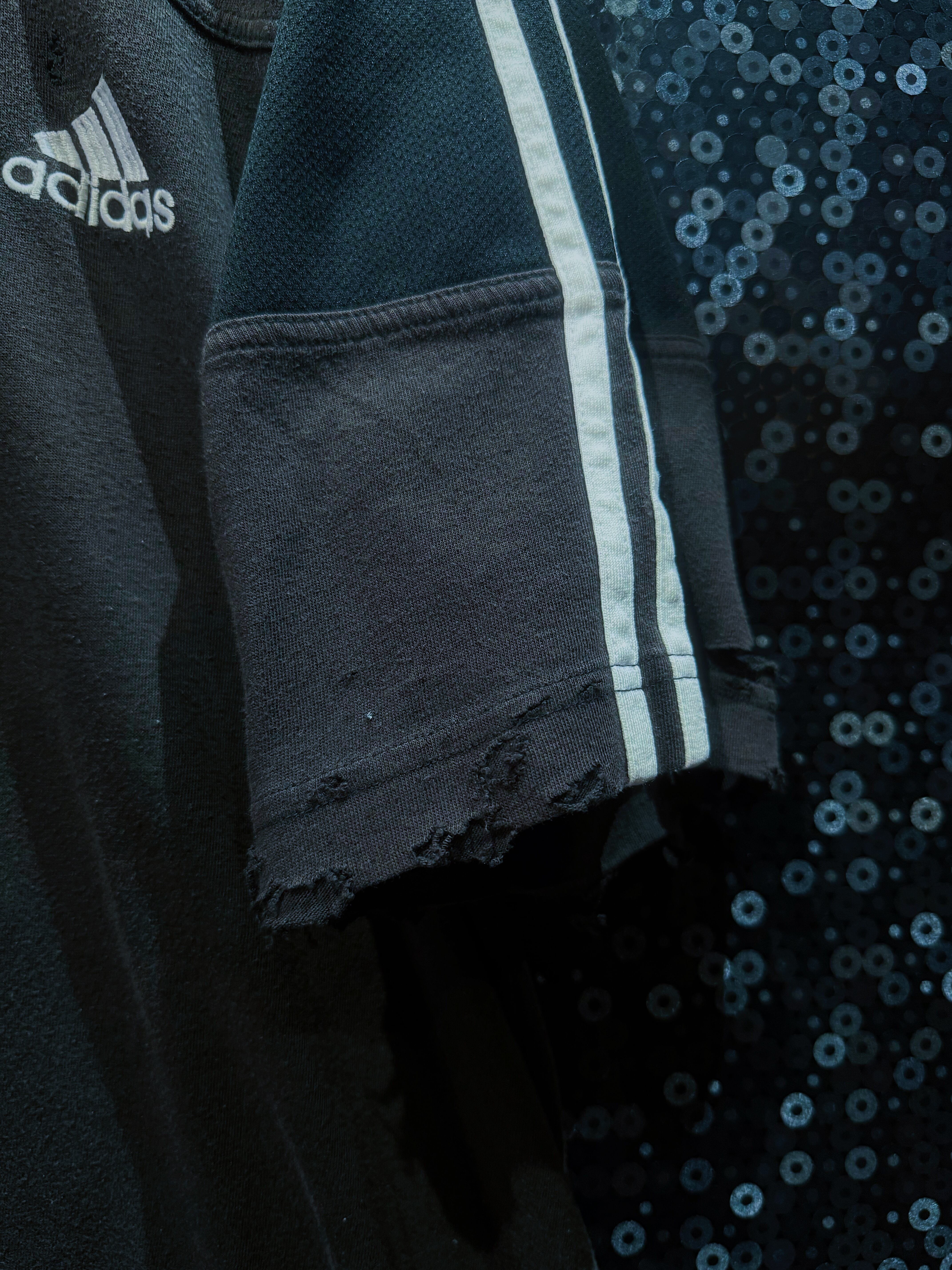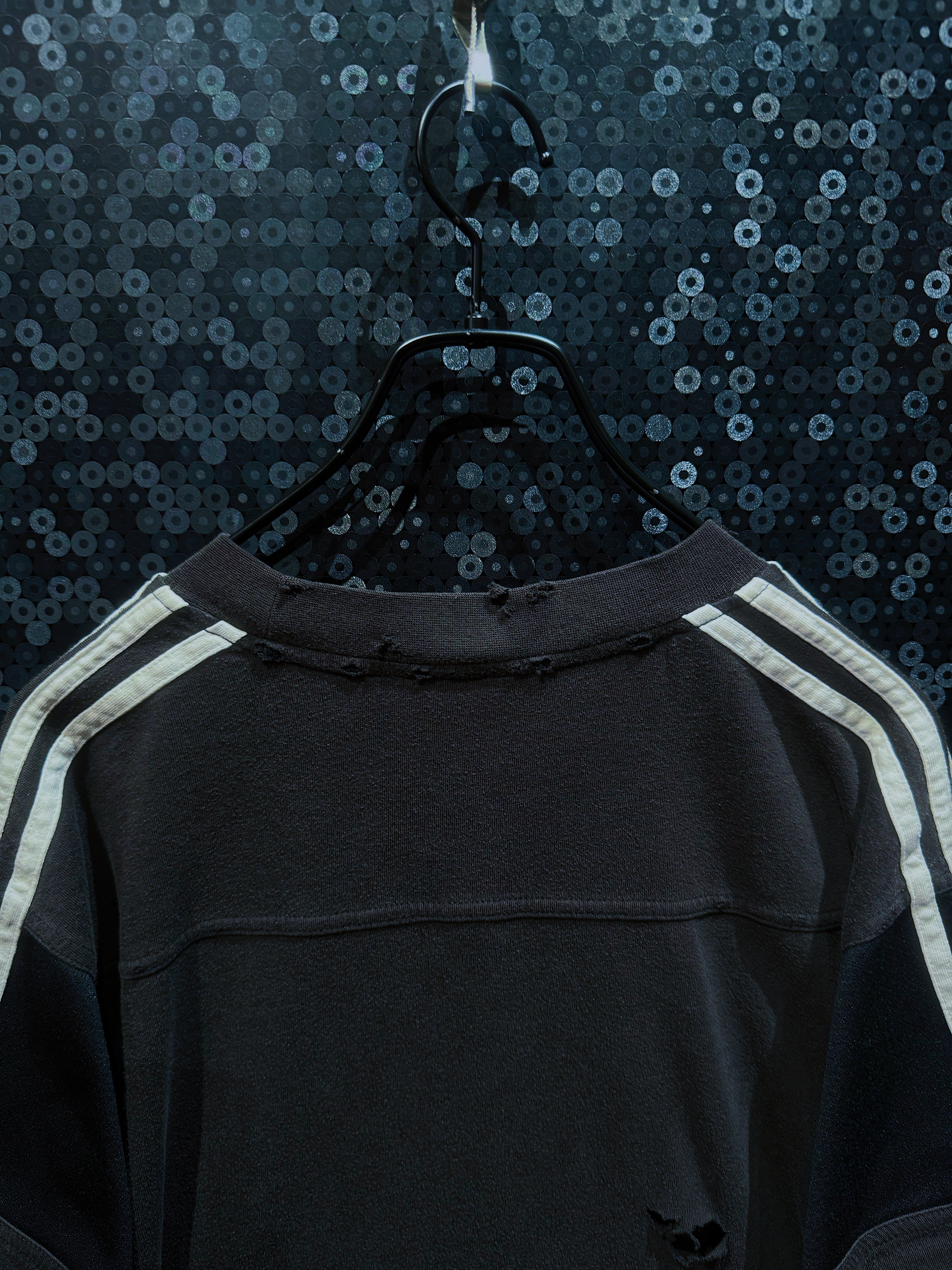 特徴的なのは、半袖ながらもトレーニングウェアのディテールを取り入れた切り替えデザインと、両袖に入るホワイトのスリーストライプ。左胸には刺繍ロゴが控えめながらしっかり主張しており、ボロ加工の中にもブランドの確かな存在感を漂わせます。