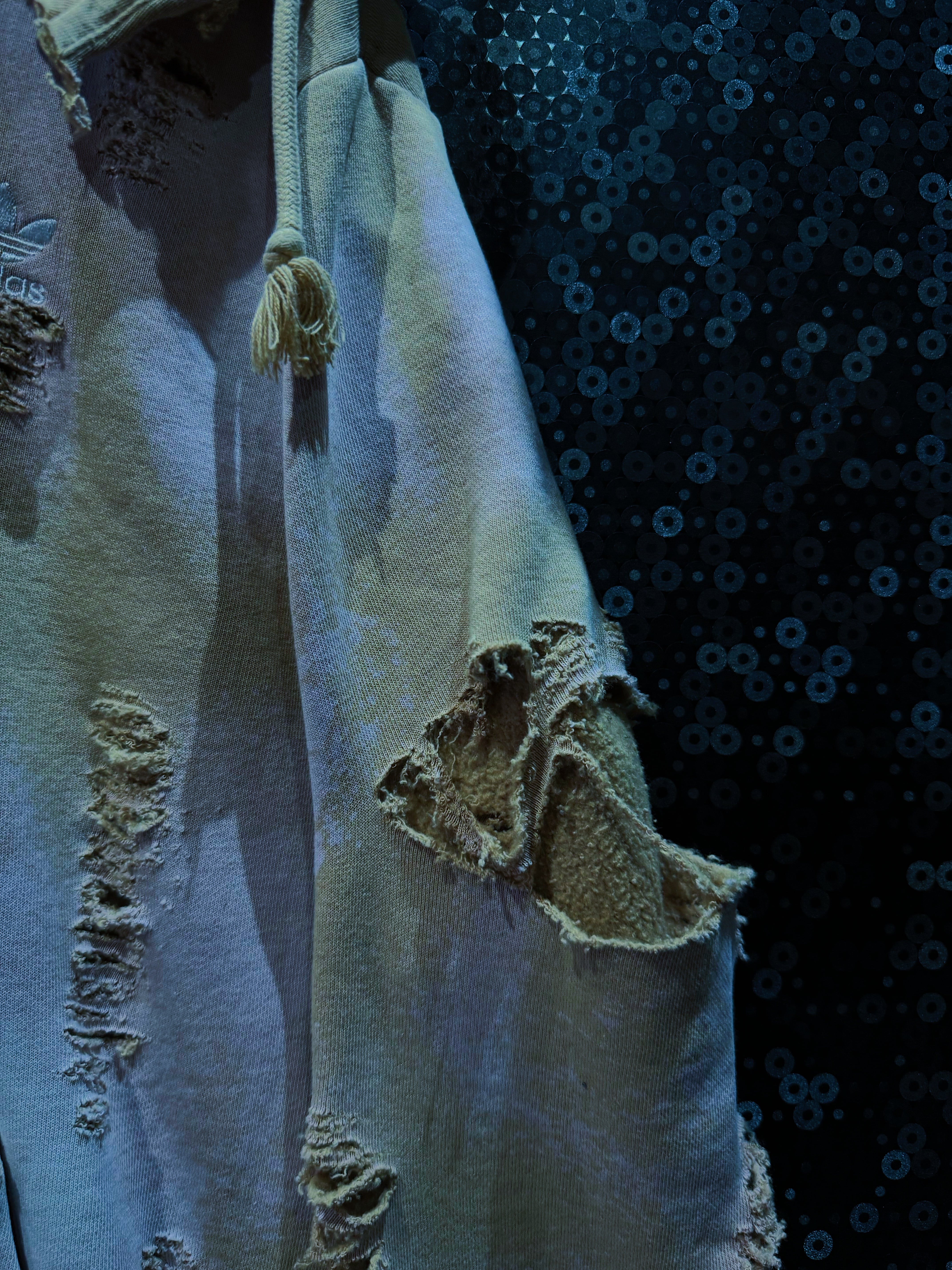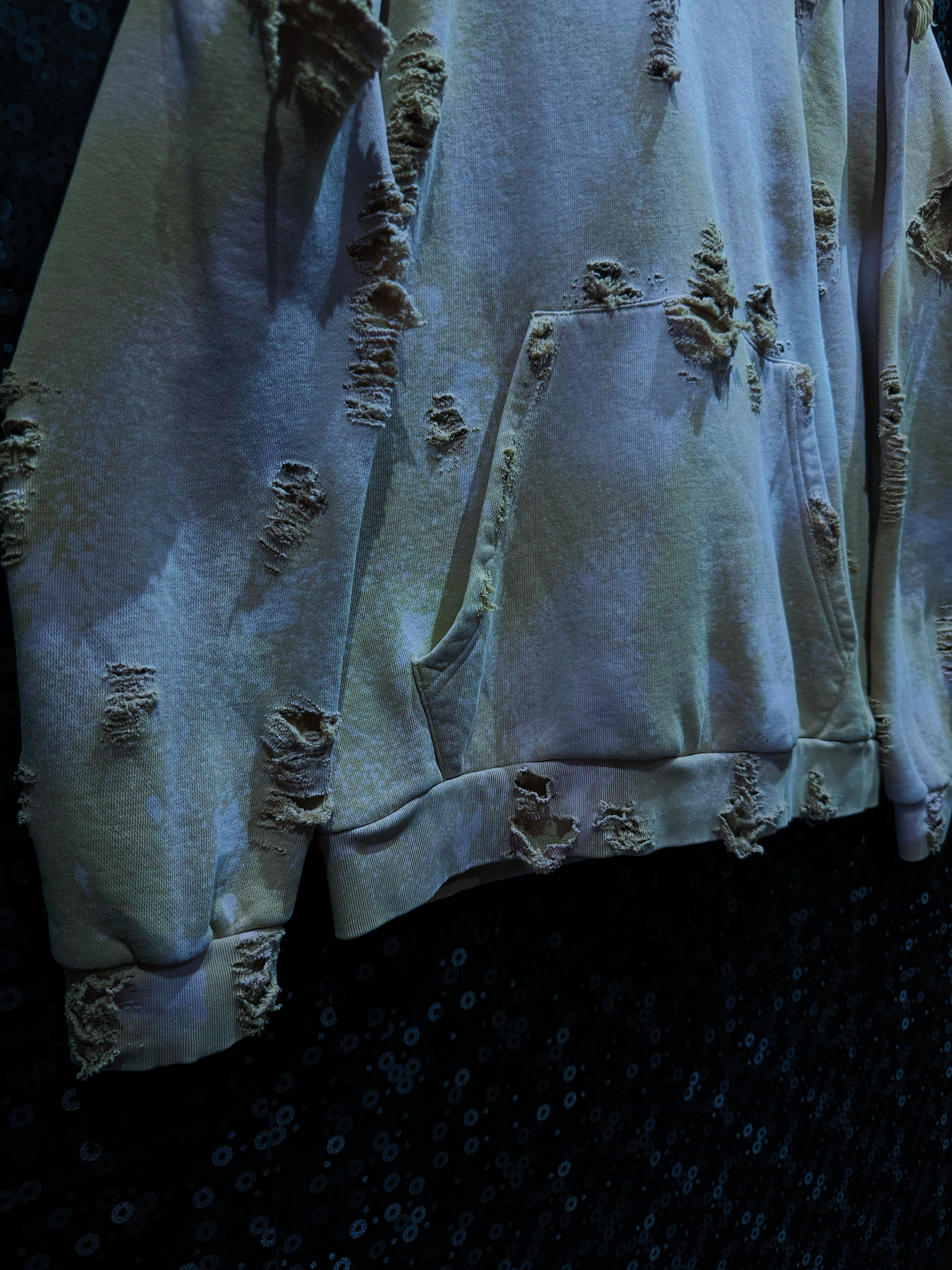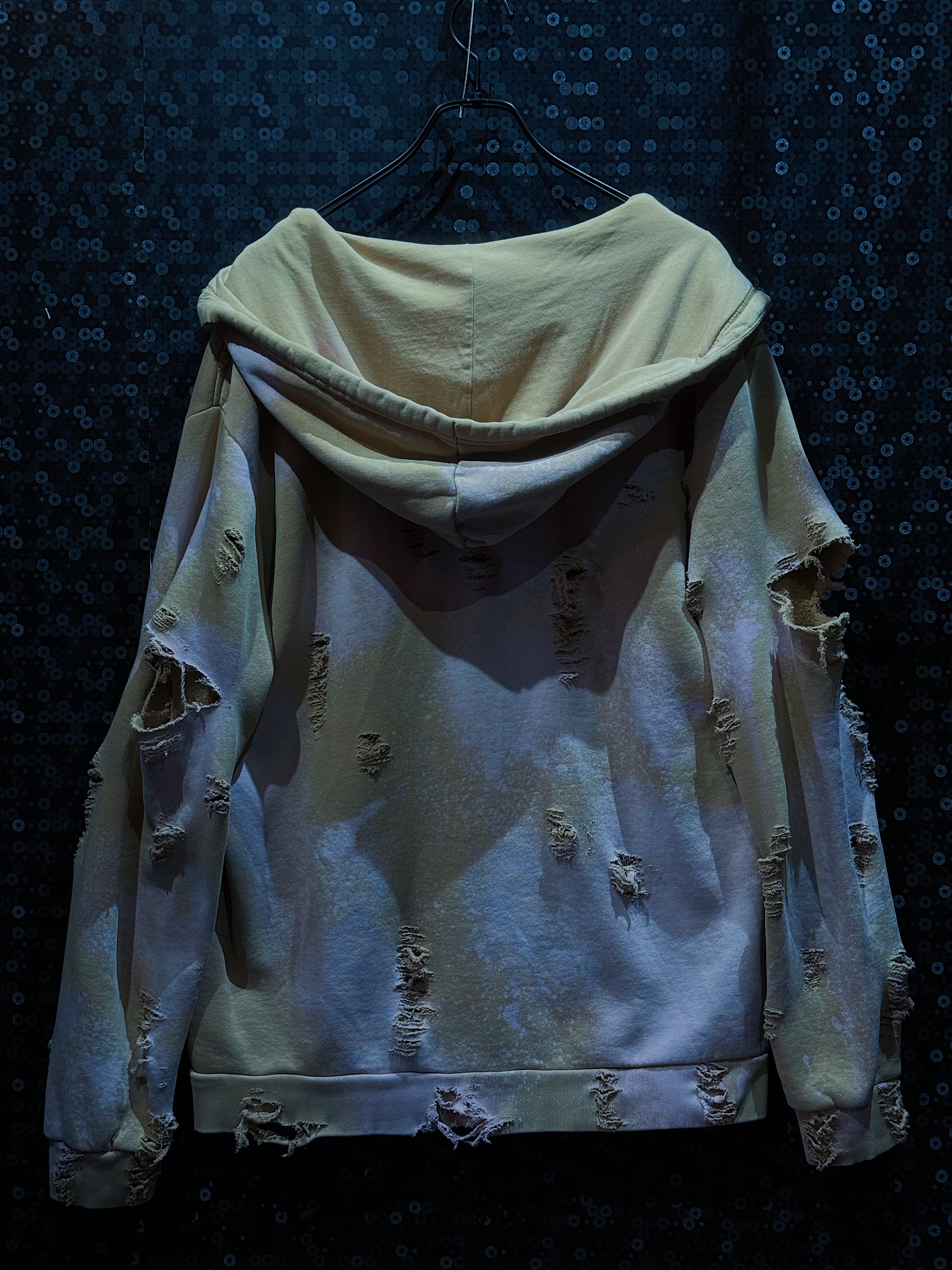 adidasのヴィンテージ加工フーディー。ボディカラーはベージュ系をベースにしながらも、全体に施されたブリーチによる褪色とムラ感が、まるで“砂漠に差し込む朝霧”のような幻想的なグラデーションを描いています。